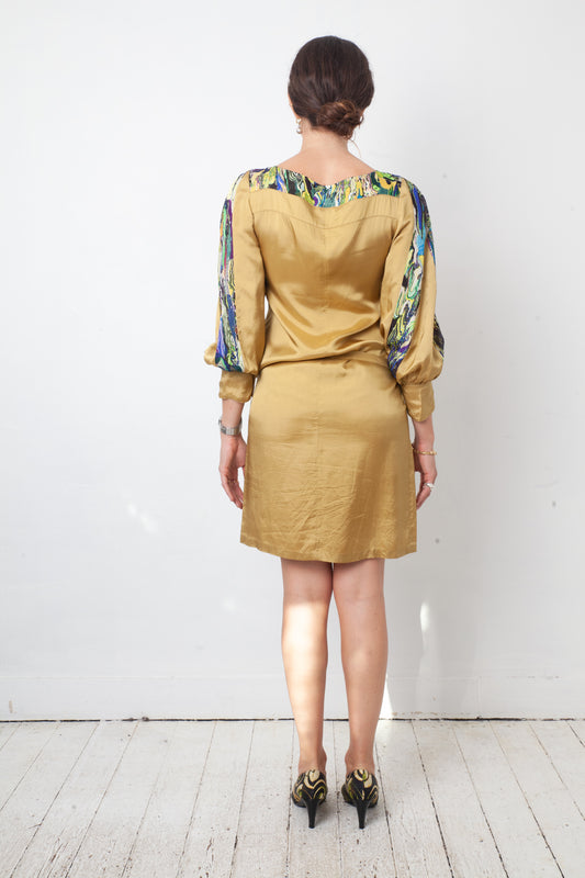 Dries van Noten 2010's mustard yellow dress with multicolour marble outlines