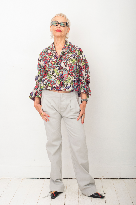 Junya Watanabe multicolour draped paisley print cotton shirt with ruffled sleeves.