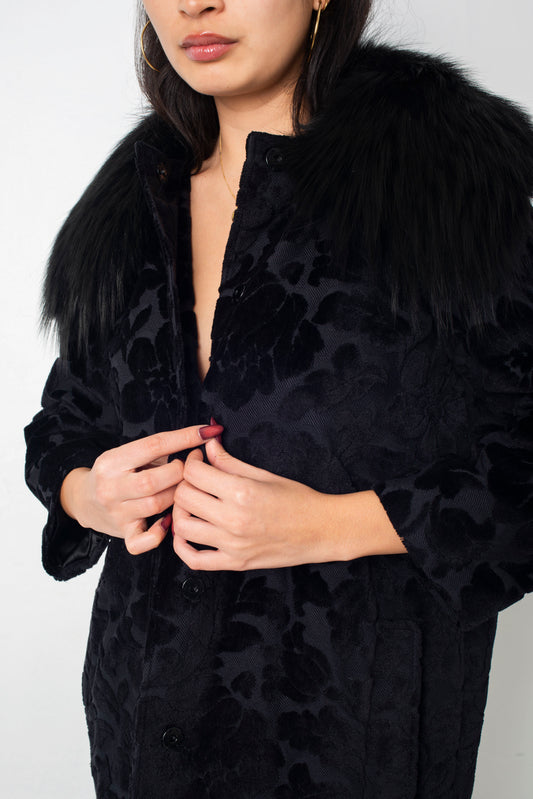 Dolce & Gabbana 2010's black velvet coat with dévoré floral print & fox fur collar