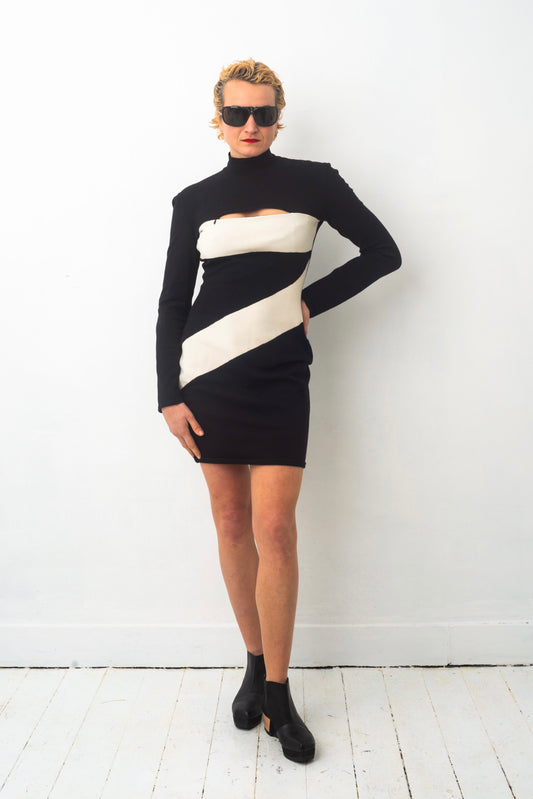 Thierry Mugler 90’s wool knit black and white bodycon dress with zipper chest opening