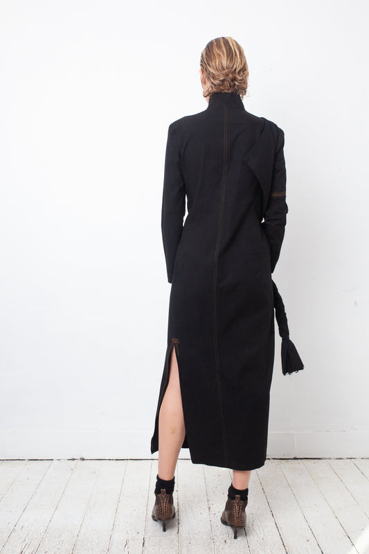 Yohji Yamamoto 2000's black cotton dress with orange stitching and braid detail