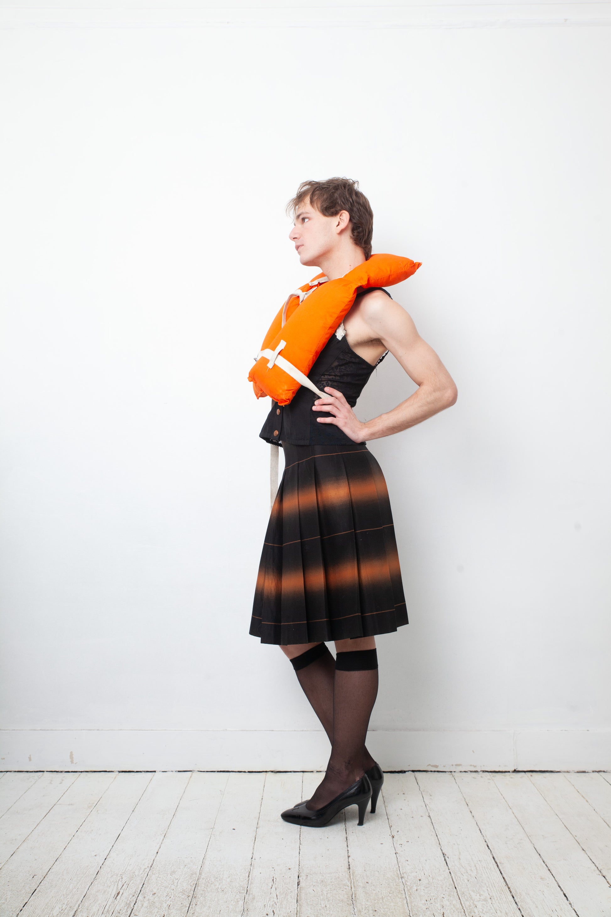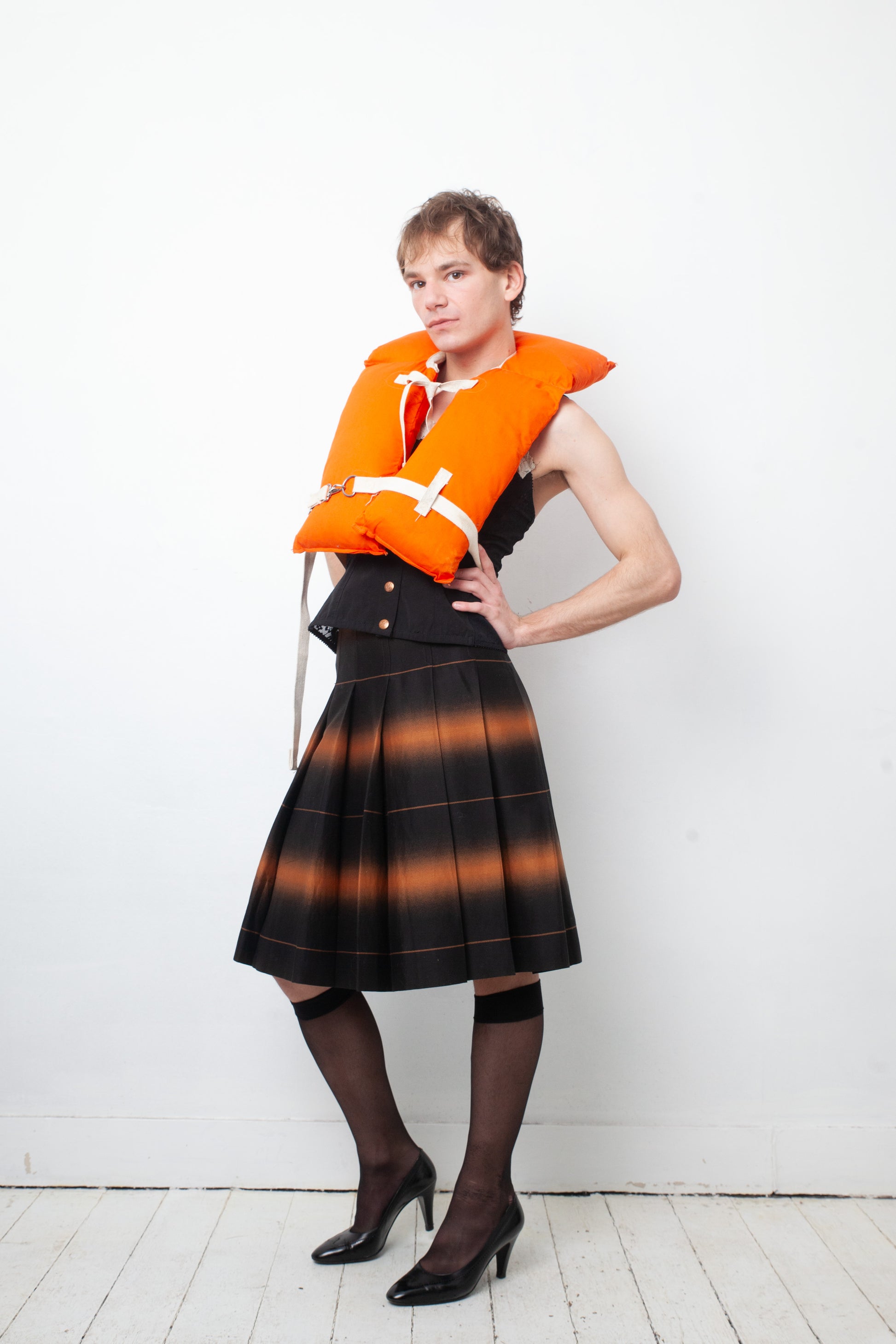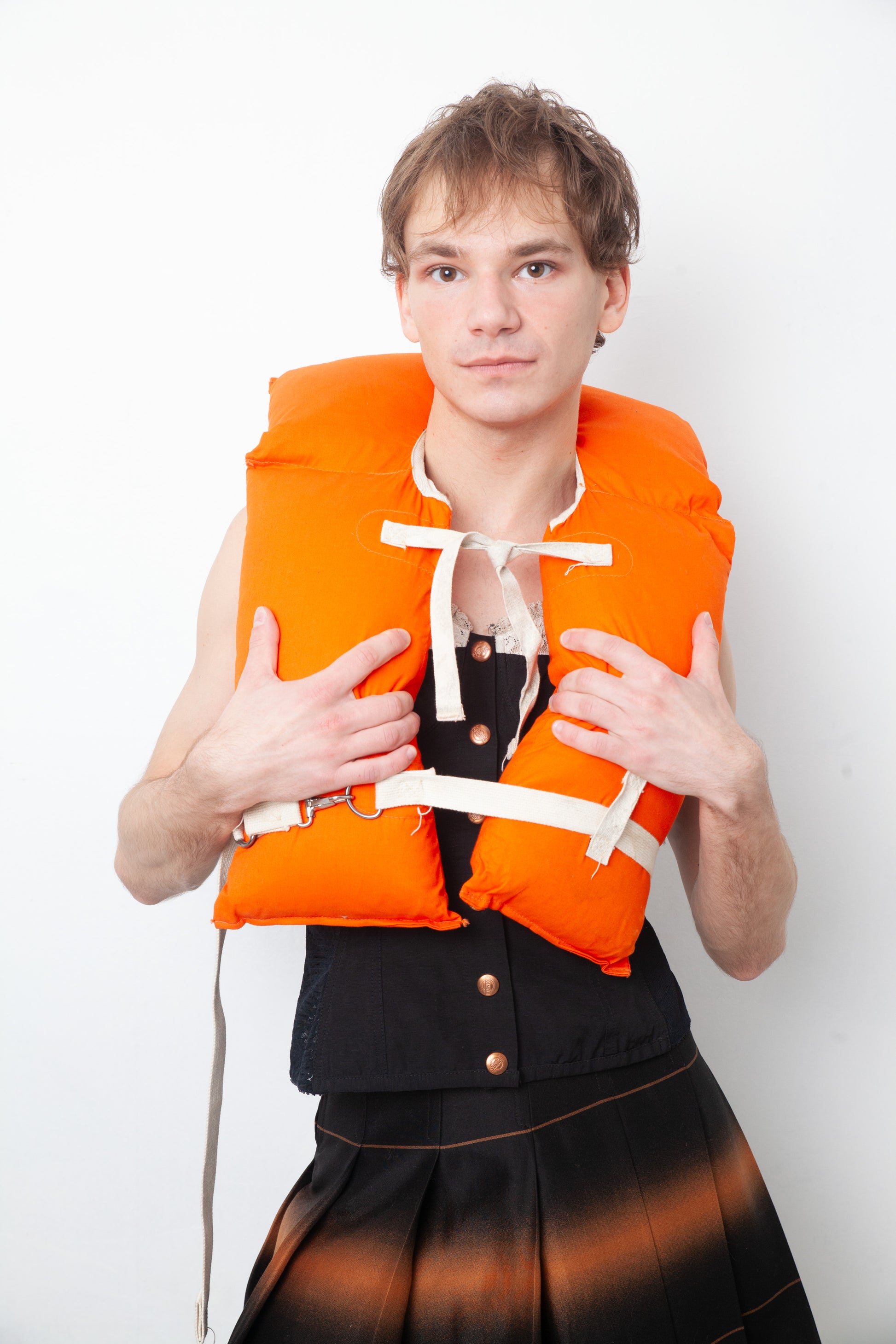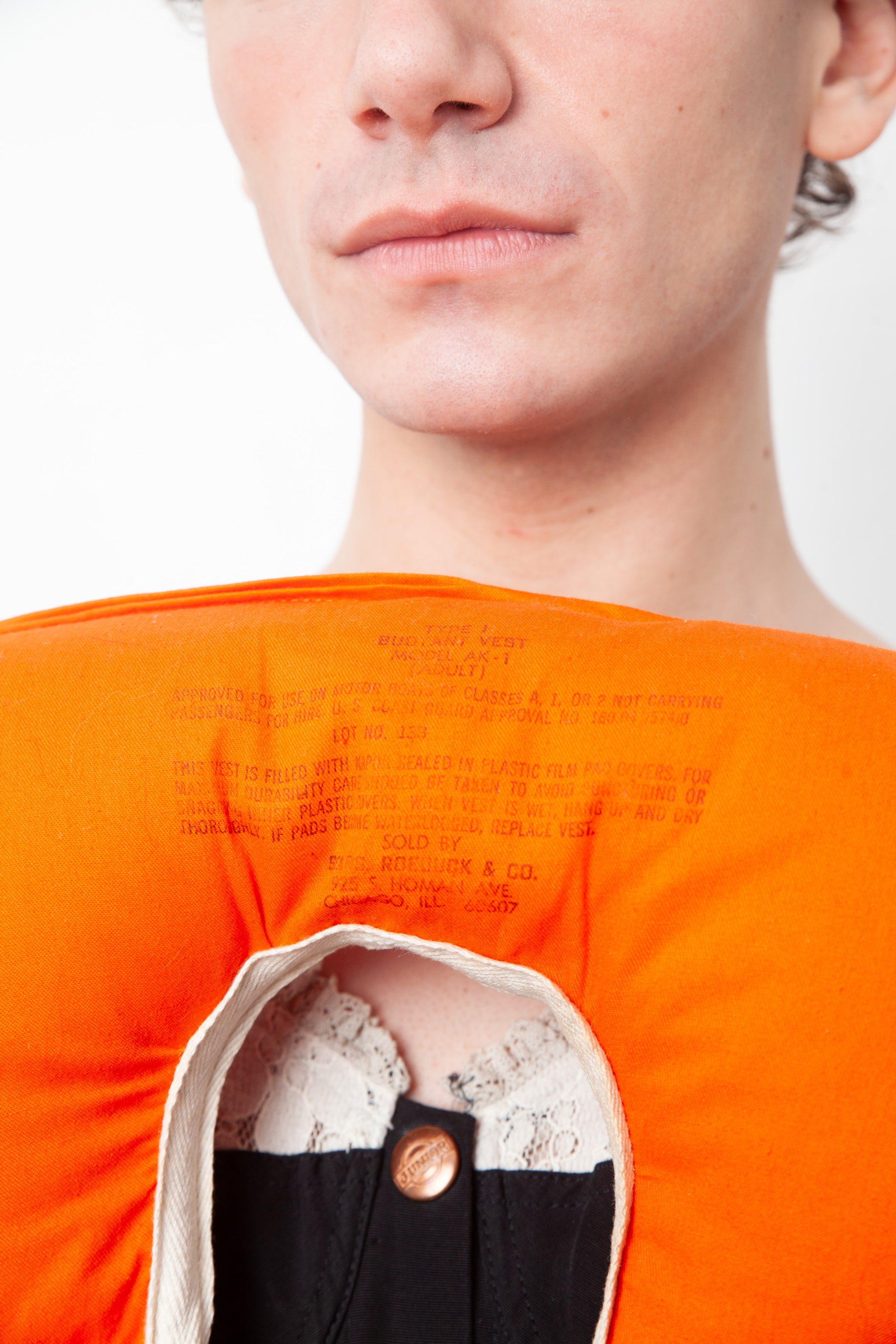 In the most striking orange, a true vintage gem, this 1970's life jacket, "Buoyant Vest Type 1 Model AK-1" made in Chicago. The vest closes in the front with two white canvas adjustable straps.