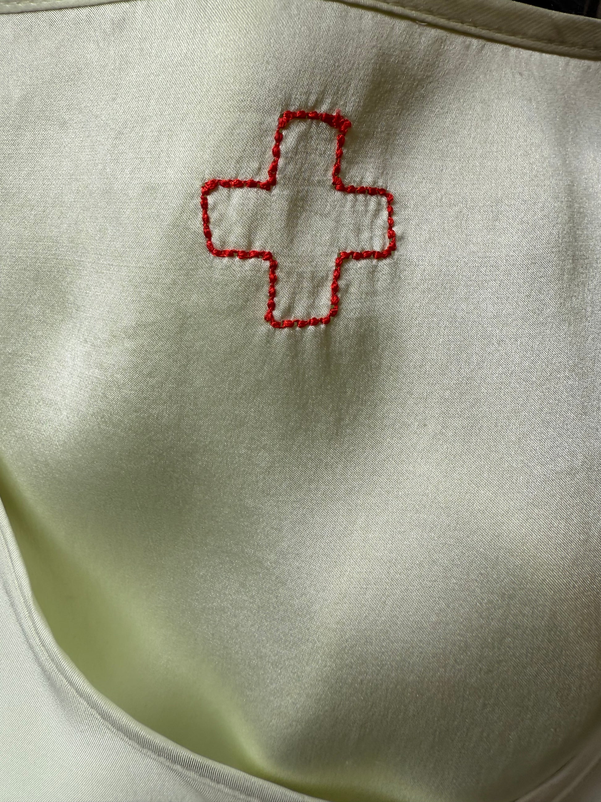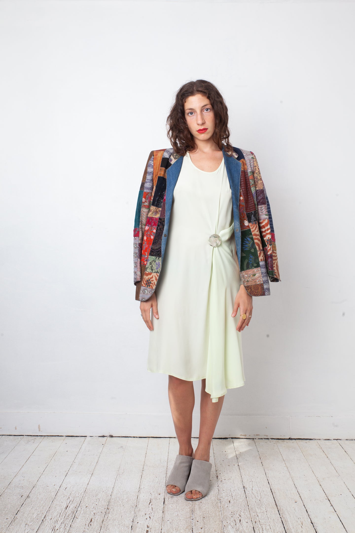 A.F. Vandervorst pastel green silk slip dress with a round neck and a round pin in the front, creating an asymmetrical draping. The red stitched cross logo visible in the back.