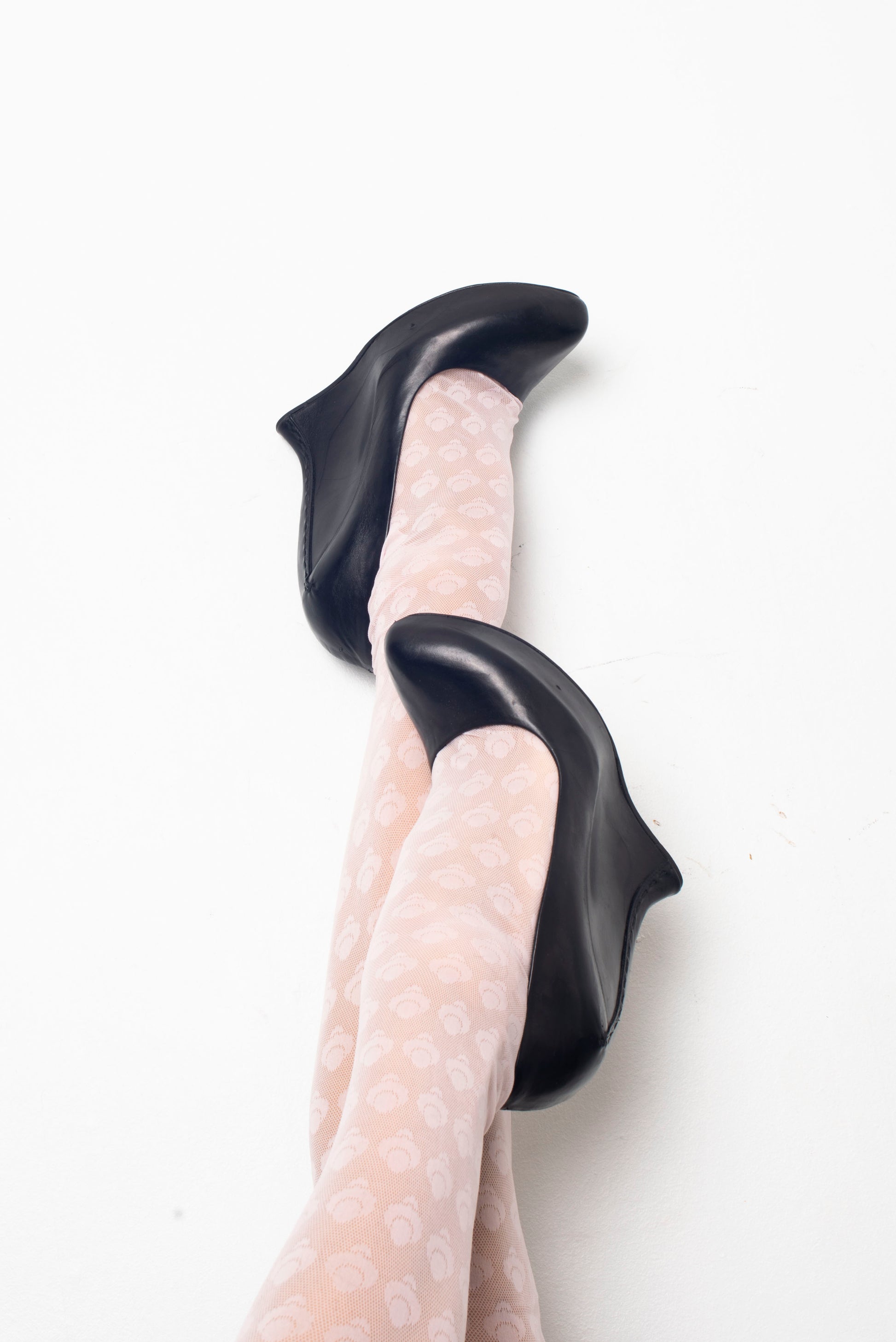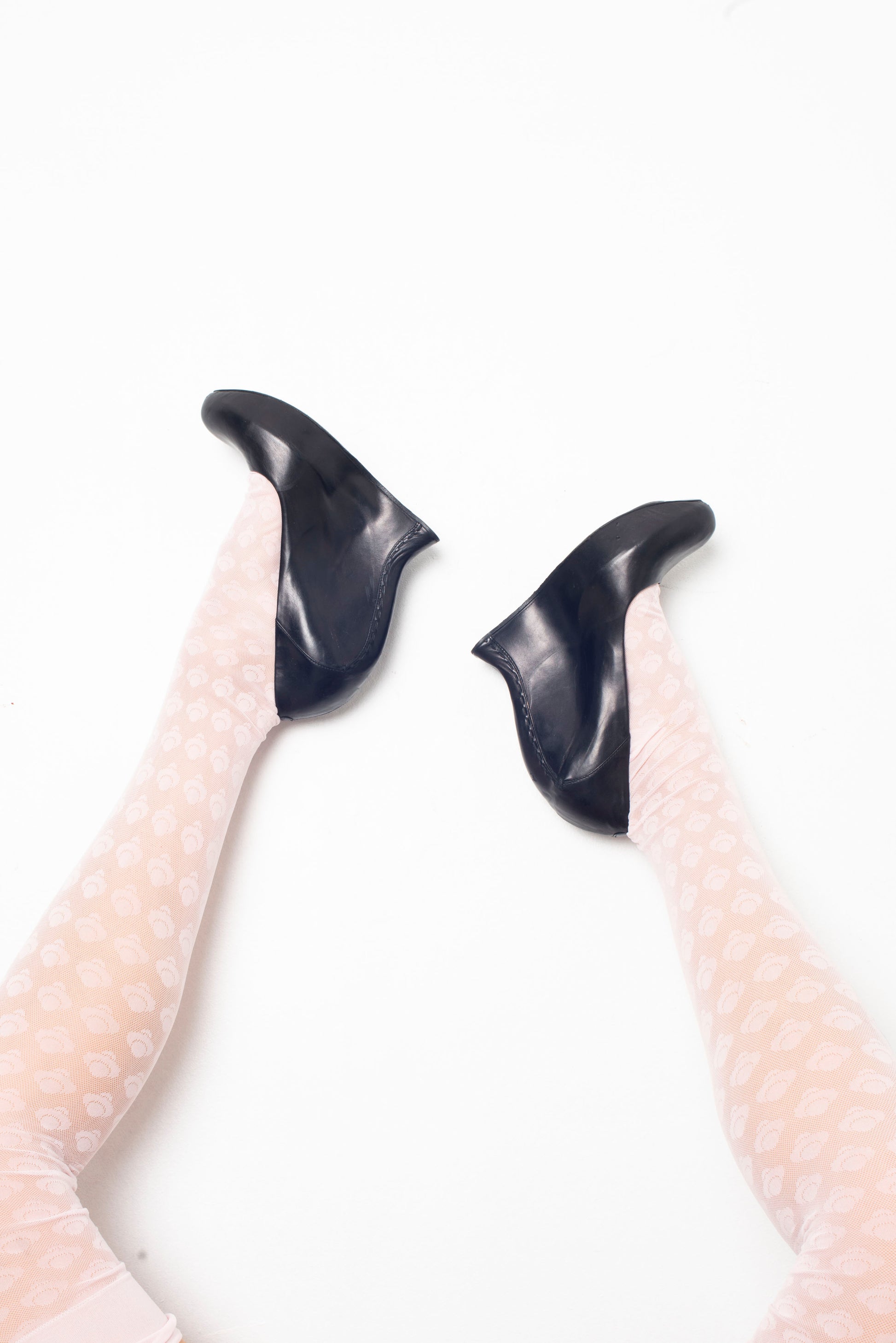 The curved wedge heel, embellished with black stitching in the back reminds one of a corseted body. Heels are 12 cm high, not for beginners.