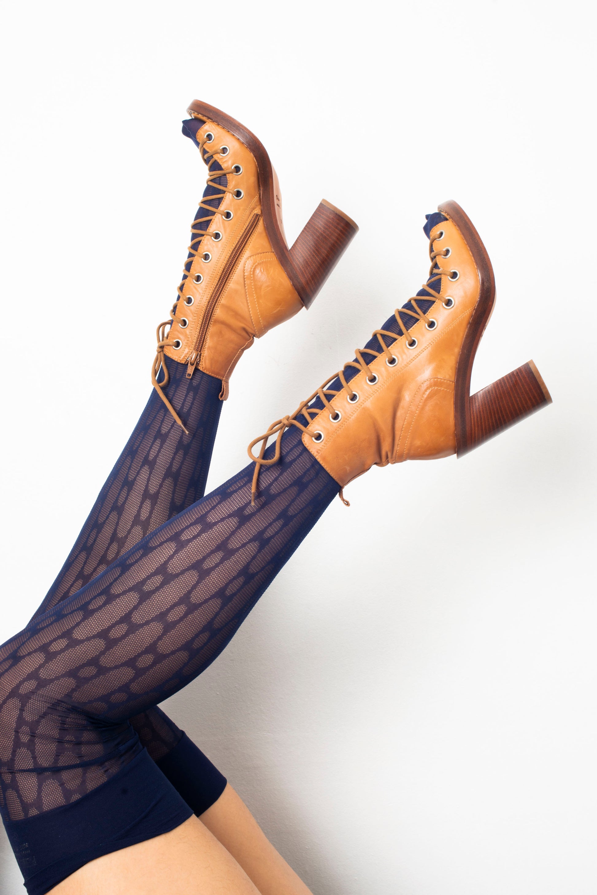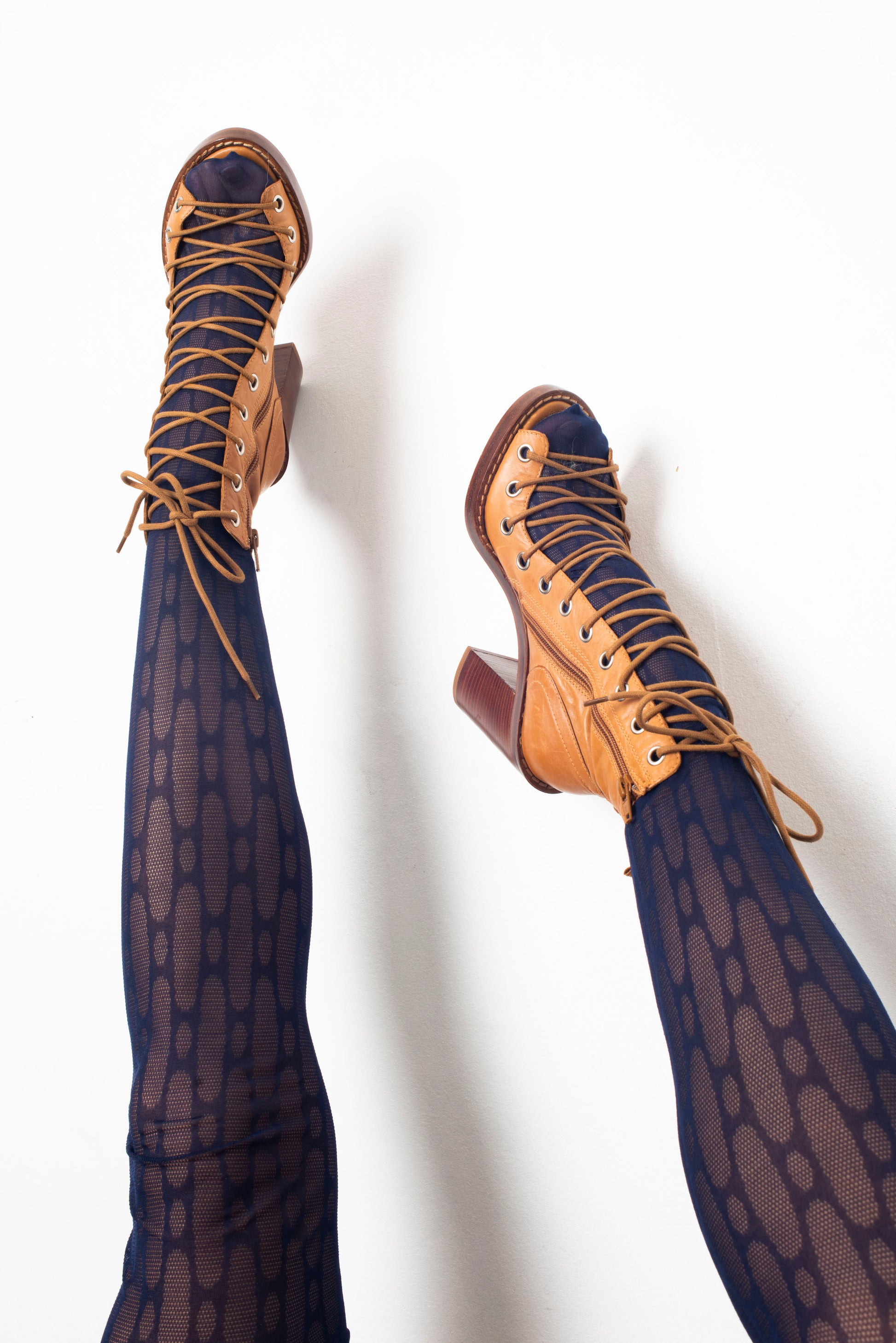 Made of a soft caramel leather, the heels feature this very glamorous laced open front, which imitates a corset.
