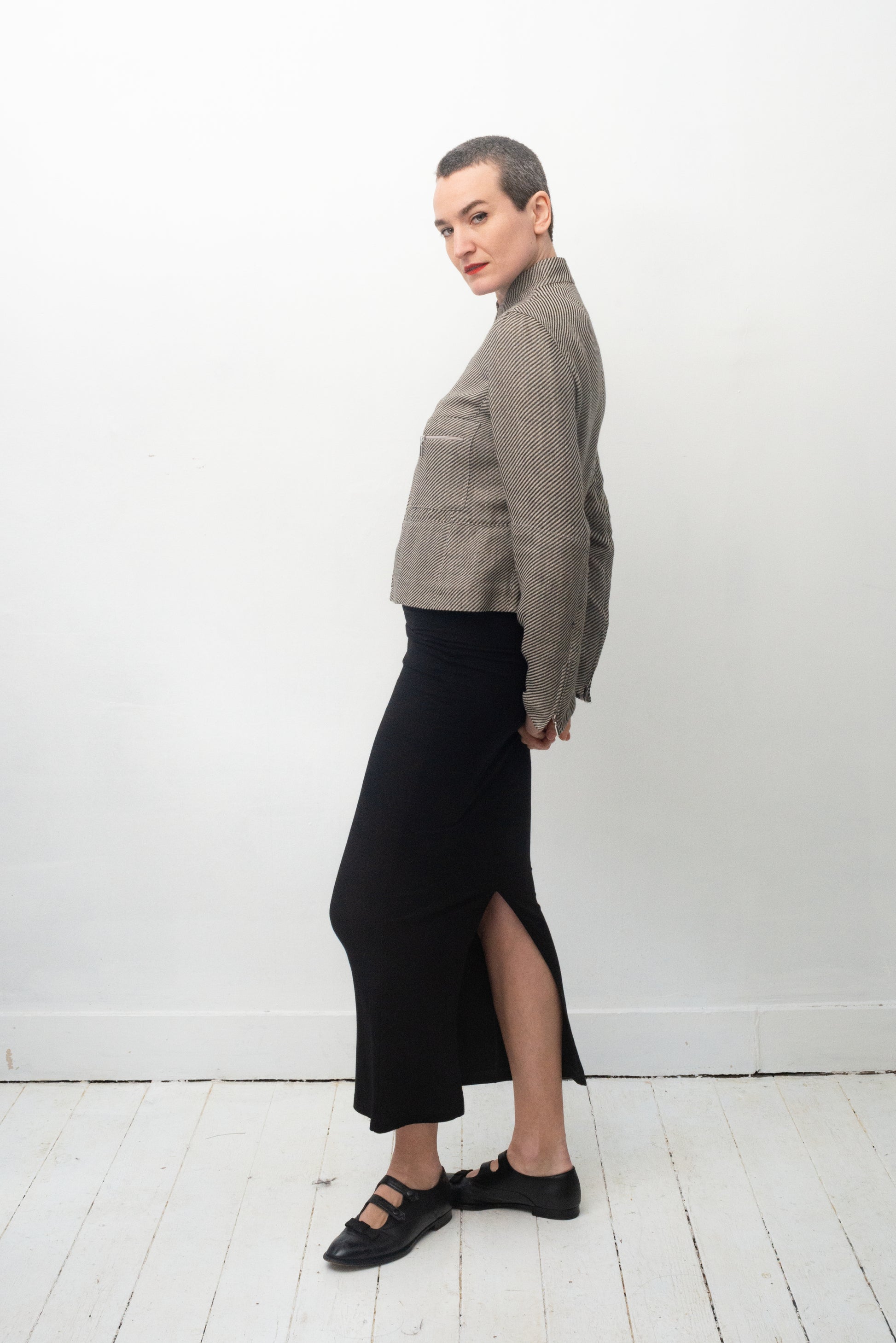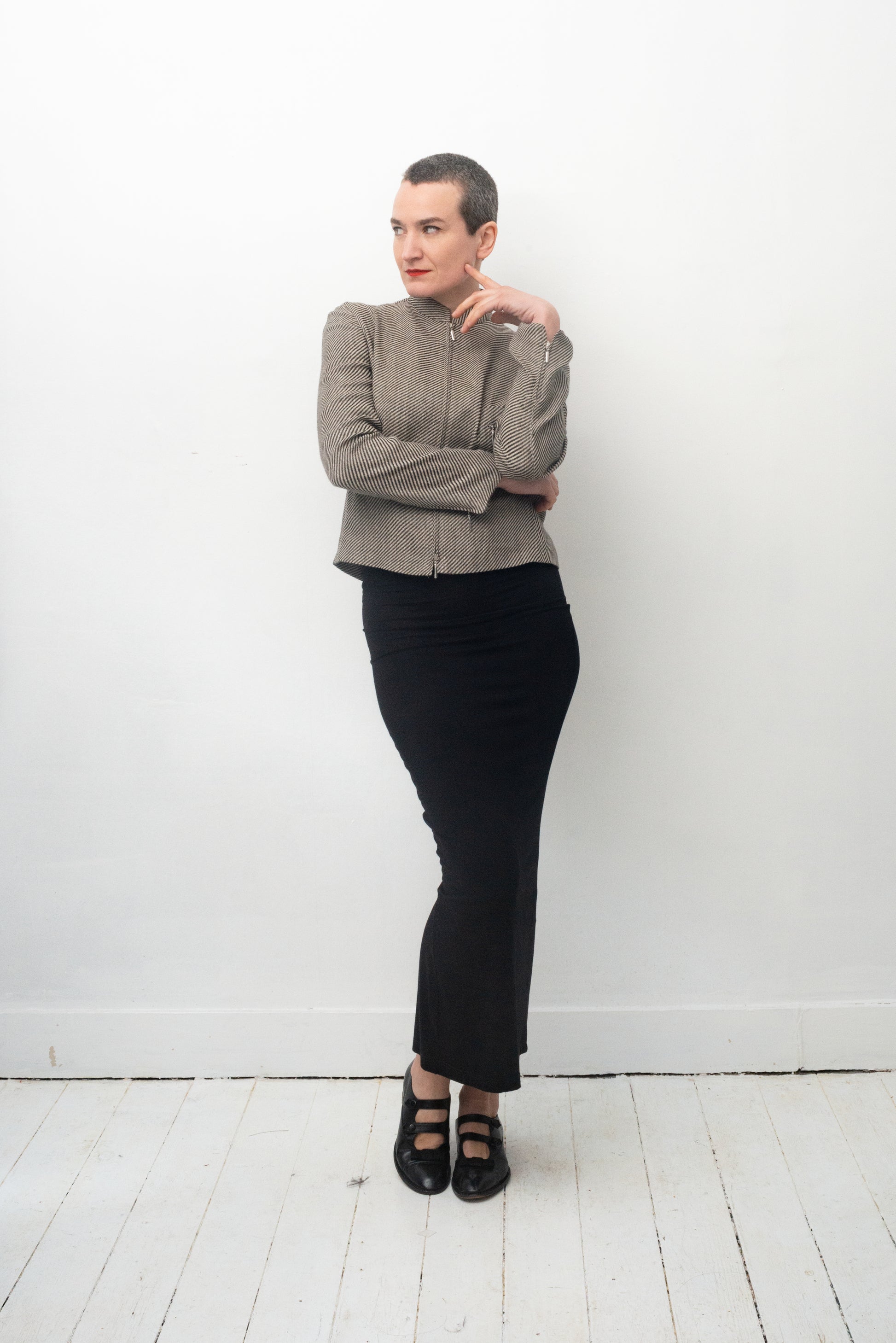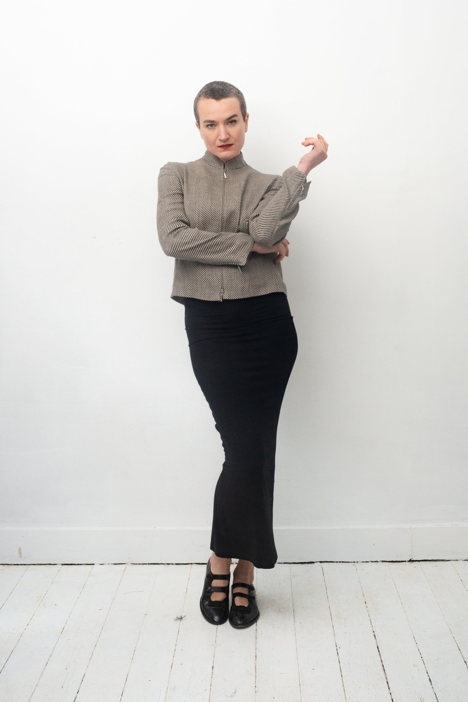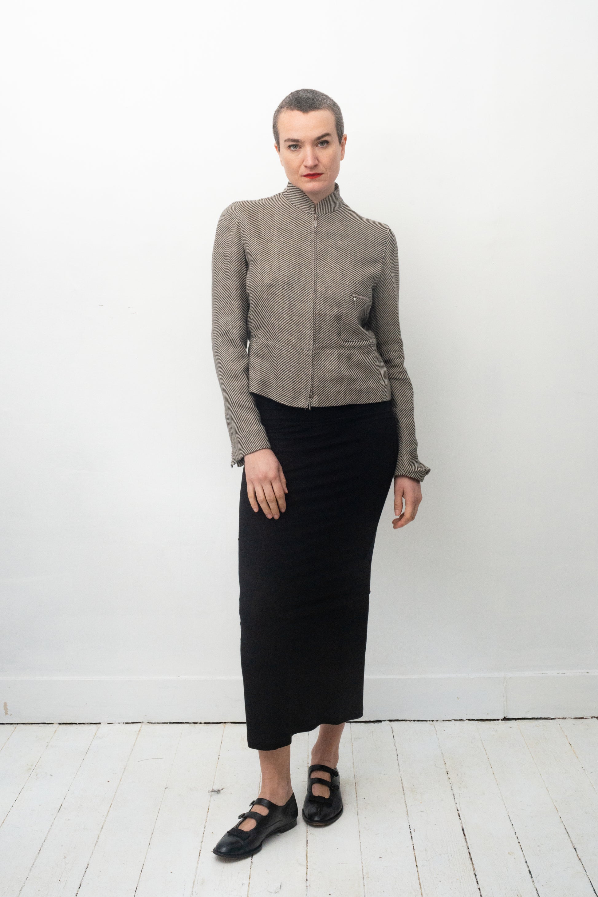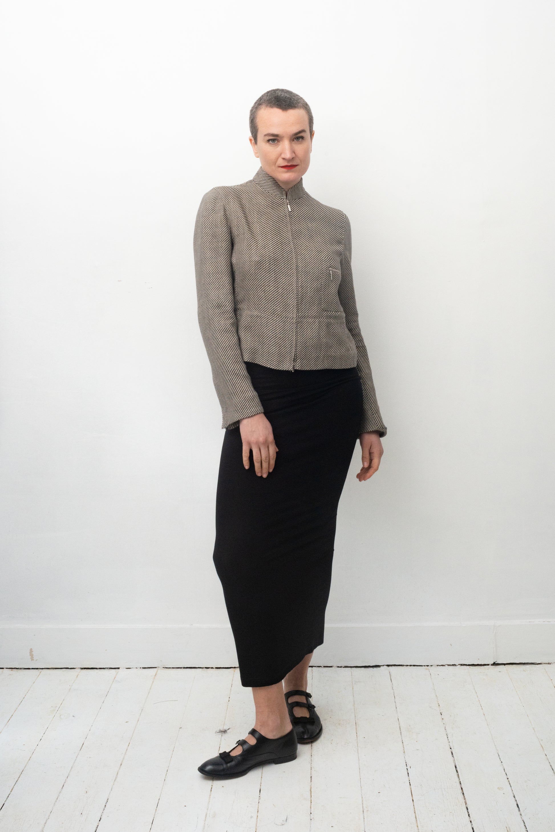 The jacket's fabric is a blend of linnen, silk and wool, making her touch soft yet resistant.