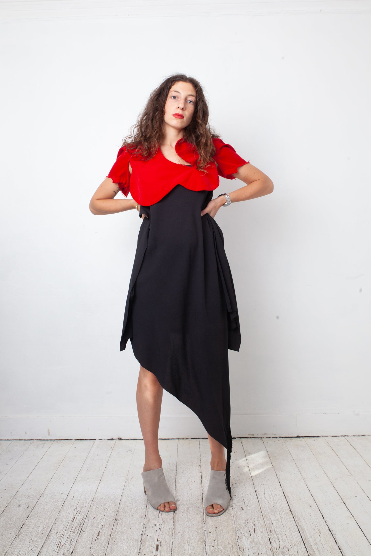 Balenciaga 2016 asymmetric black viscose slip on dress. The dress is shorter on the right and ends on the left with fringes.