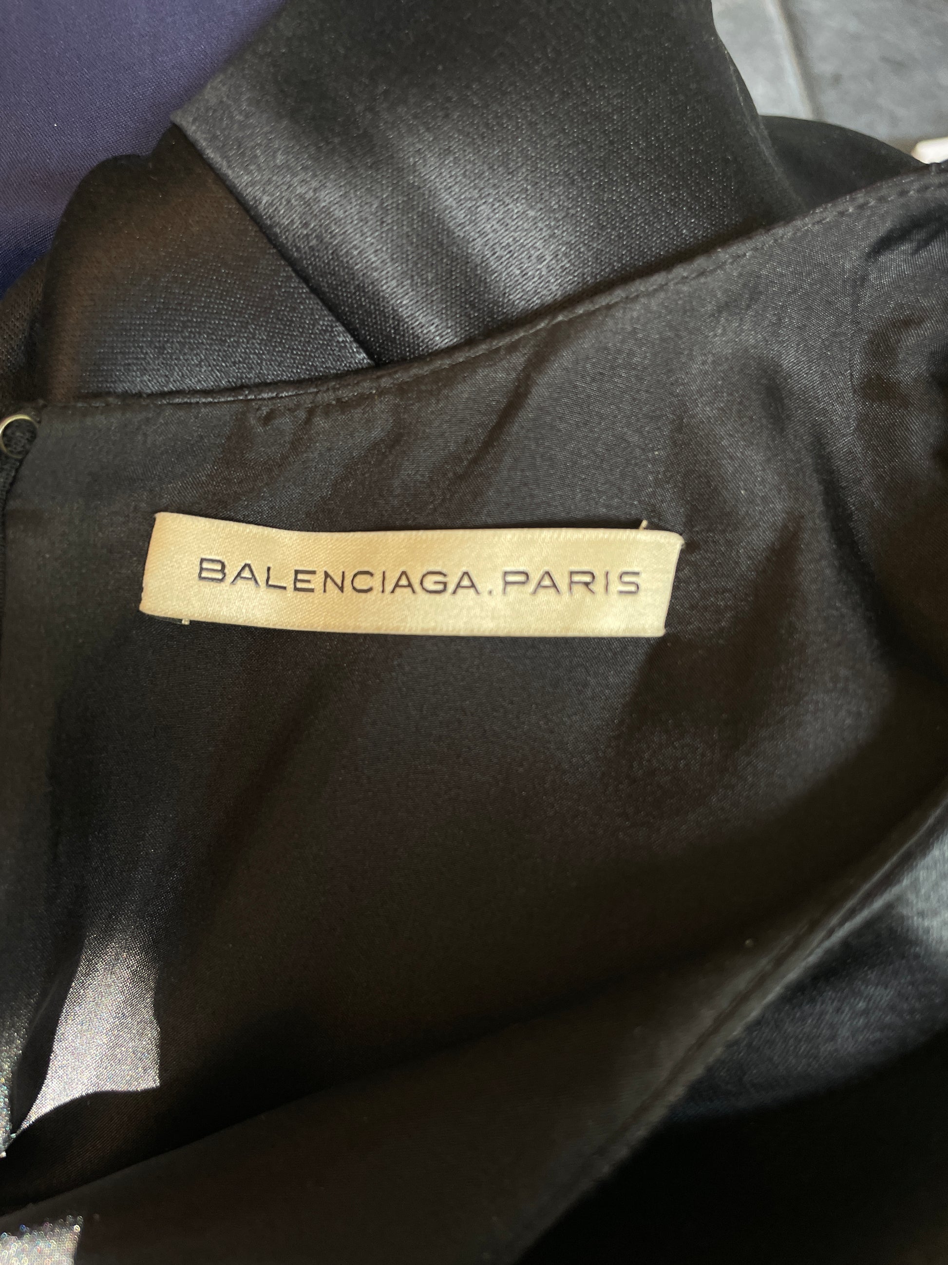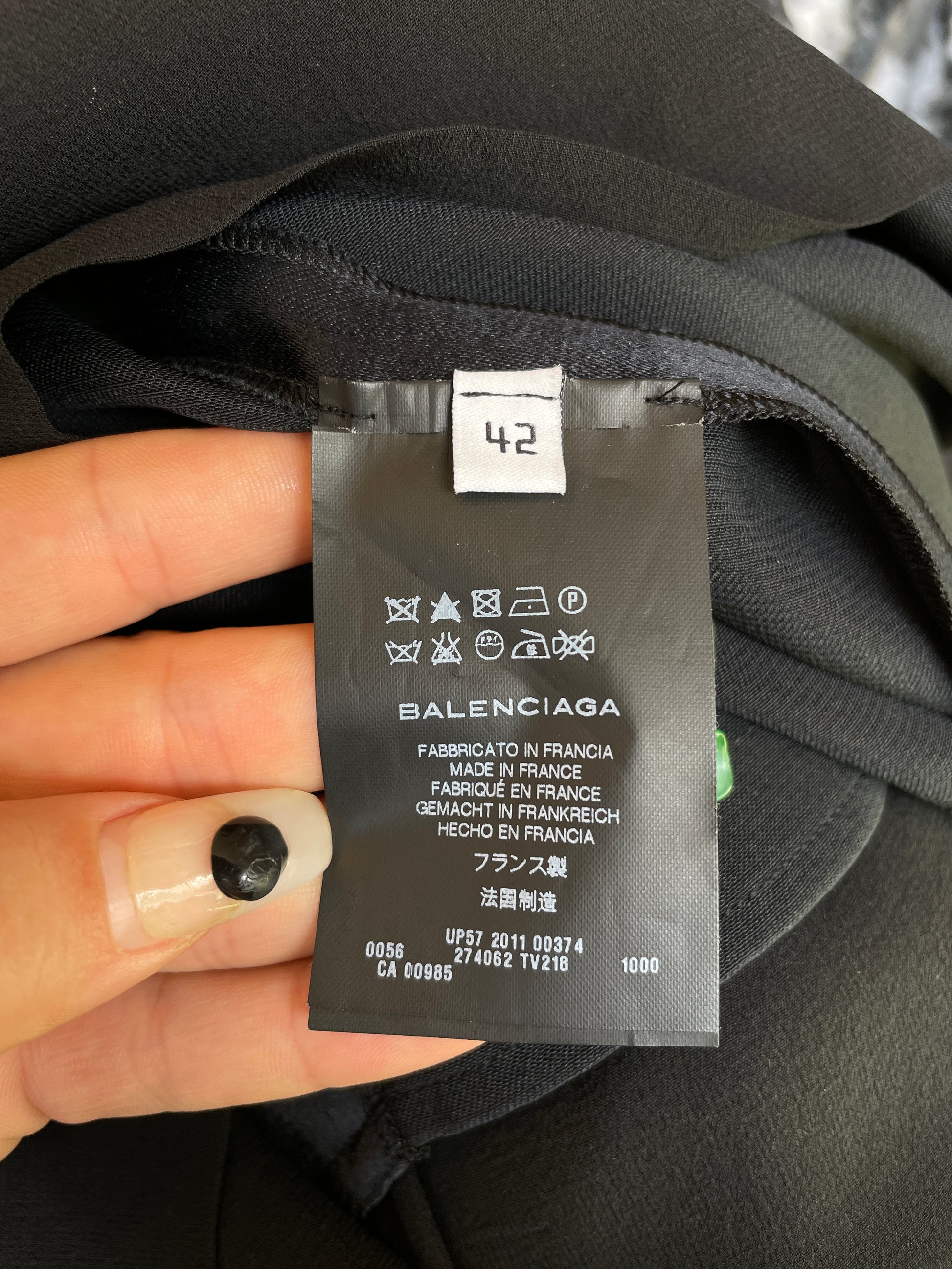 Simple yet very elegant black dress by Balenciaga from 2011 in 2 different types of silk: the body and upper arms are cut from a satin-like silk while the large bottom hem of the dress and large cuffs of the sleeves are made from a transparent gauze like silk.