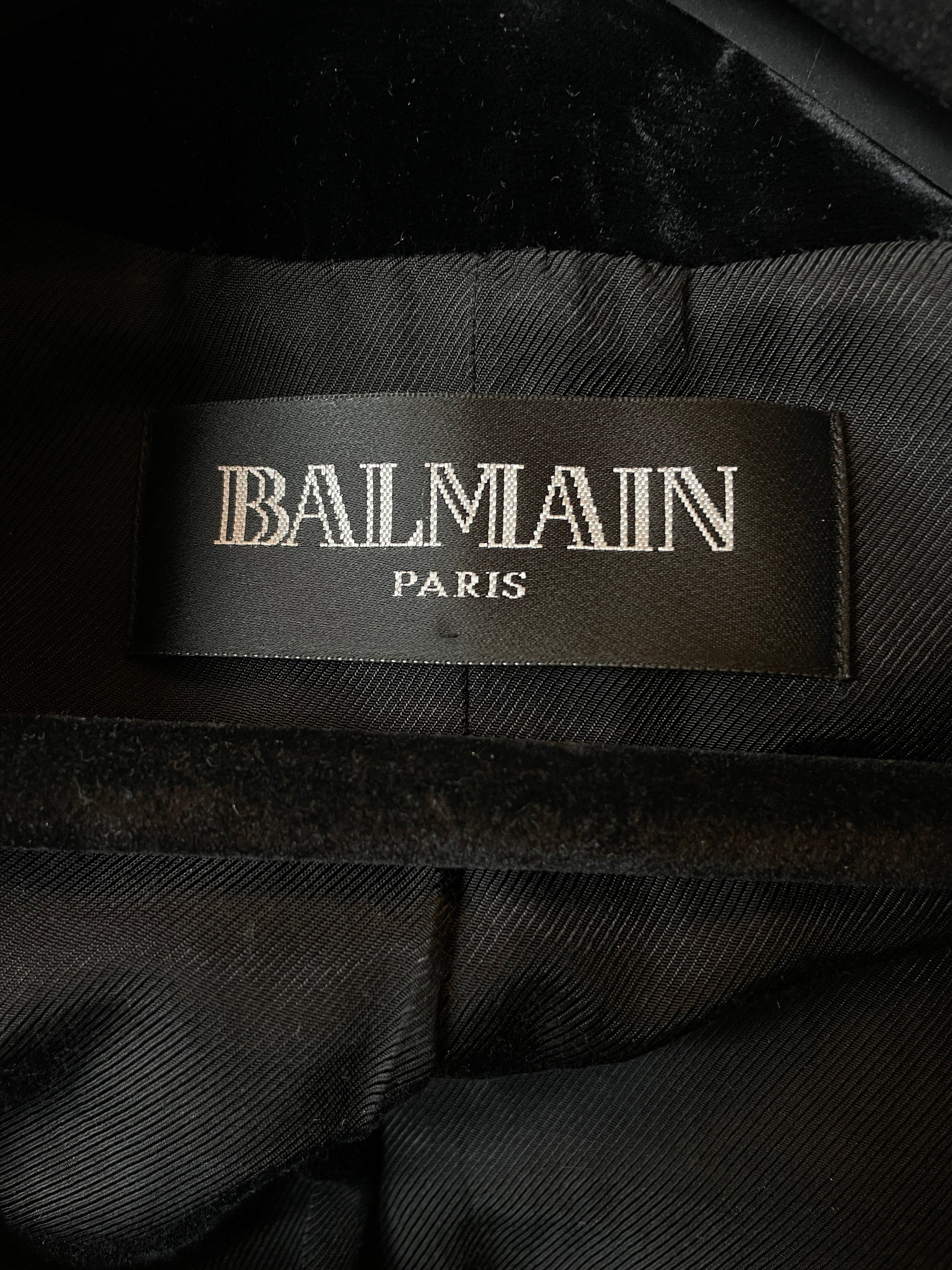 Gorgeous Balmain jacket by Olivier Rousteing in the most intense black velvet fabric with a subtle yet mesmerising dévoré Fabergé pattern, that appears and disappears depending on how the light strikes it.