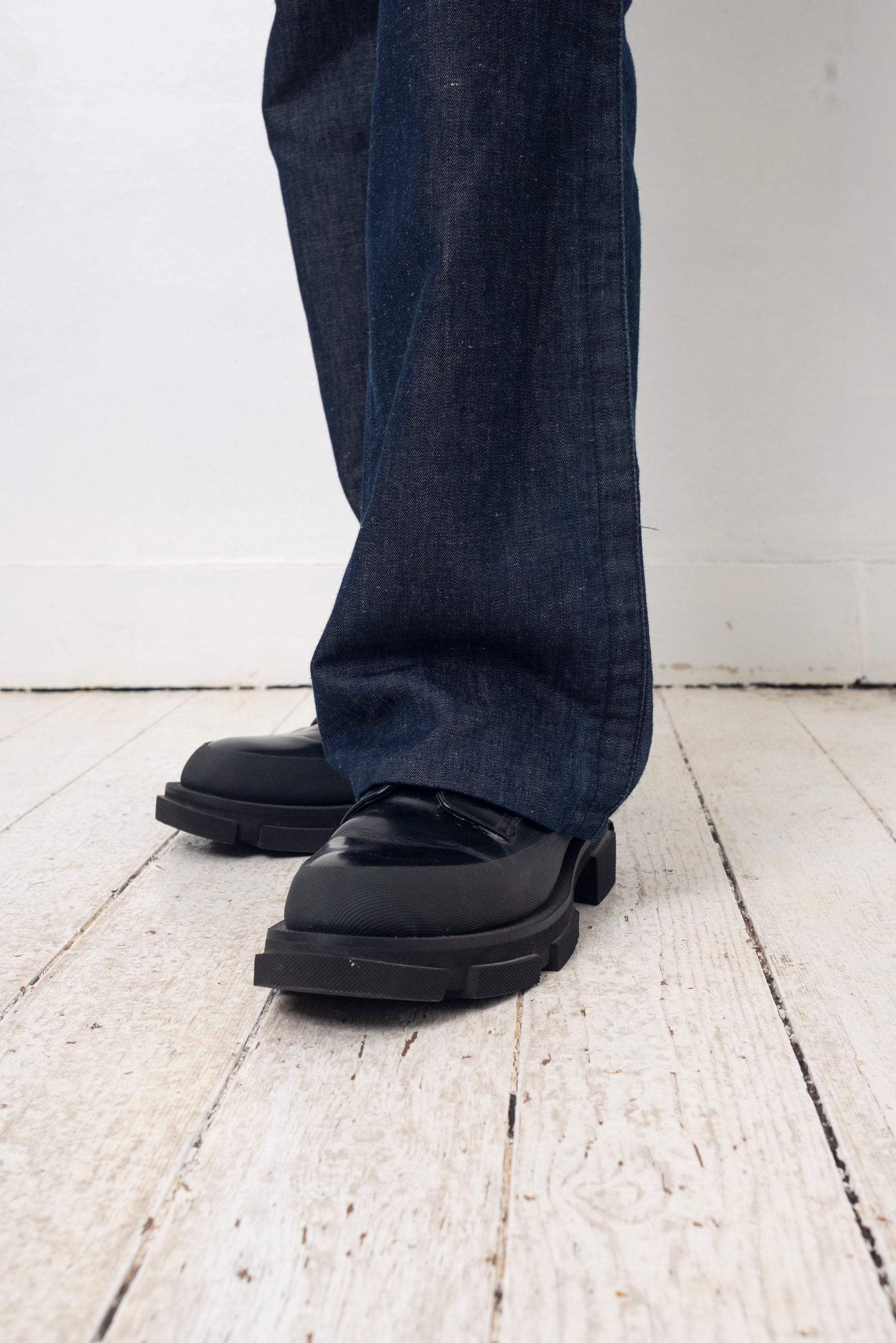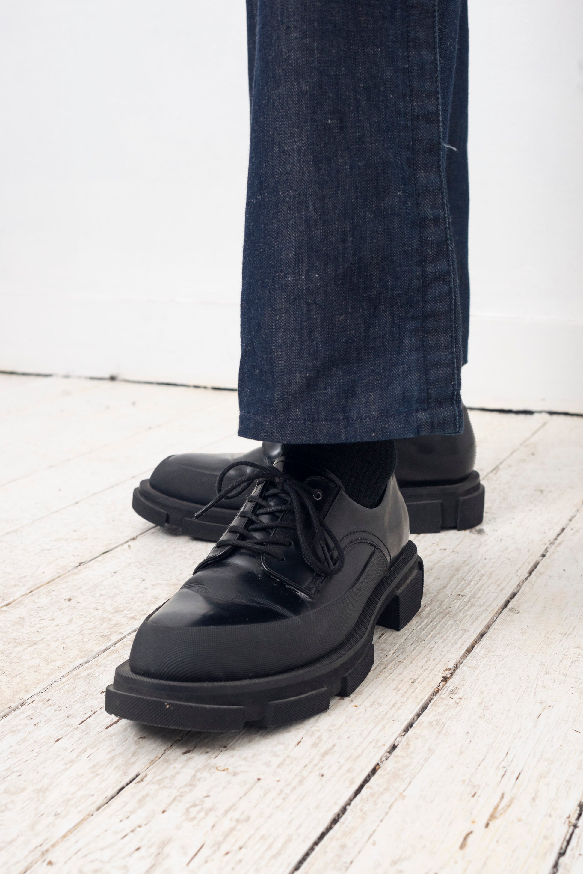 BOTH black derby leather shoes with chunky soles.