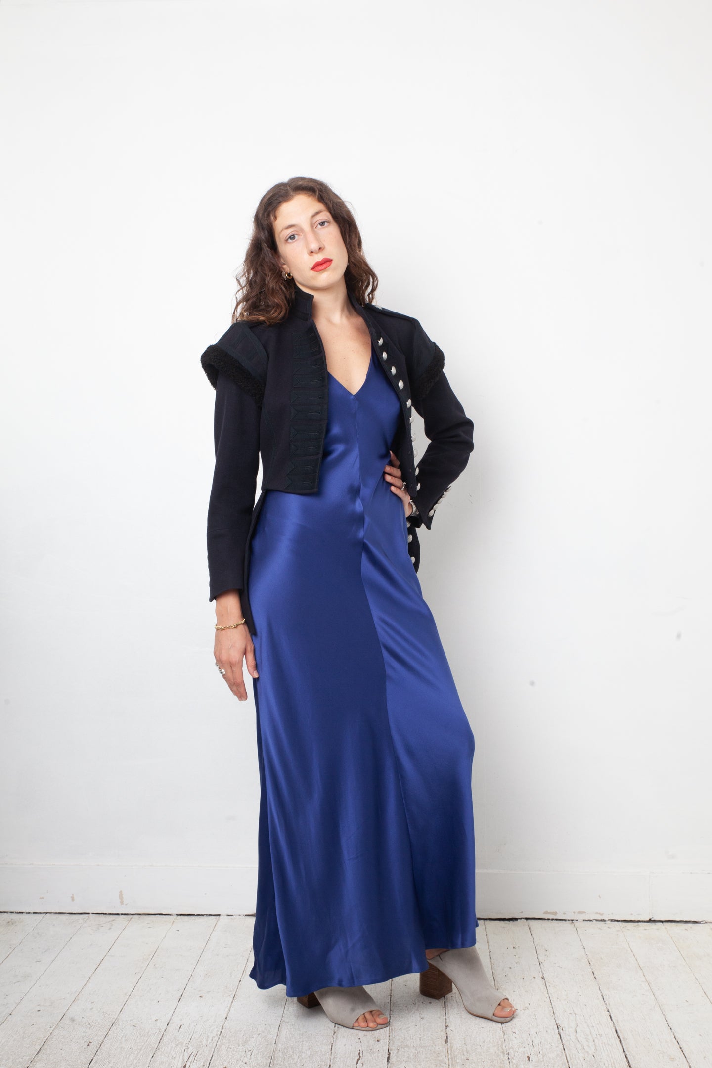 Here worn with an Alberta Ferretti blue silk evening gown, also available online