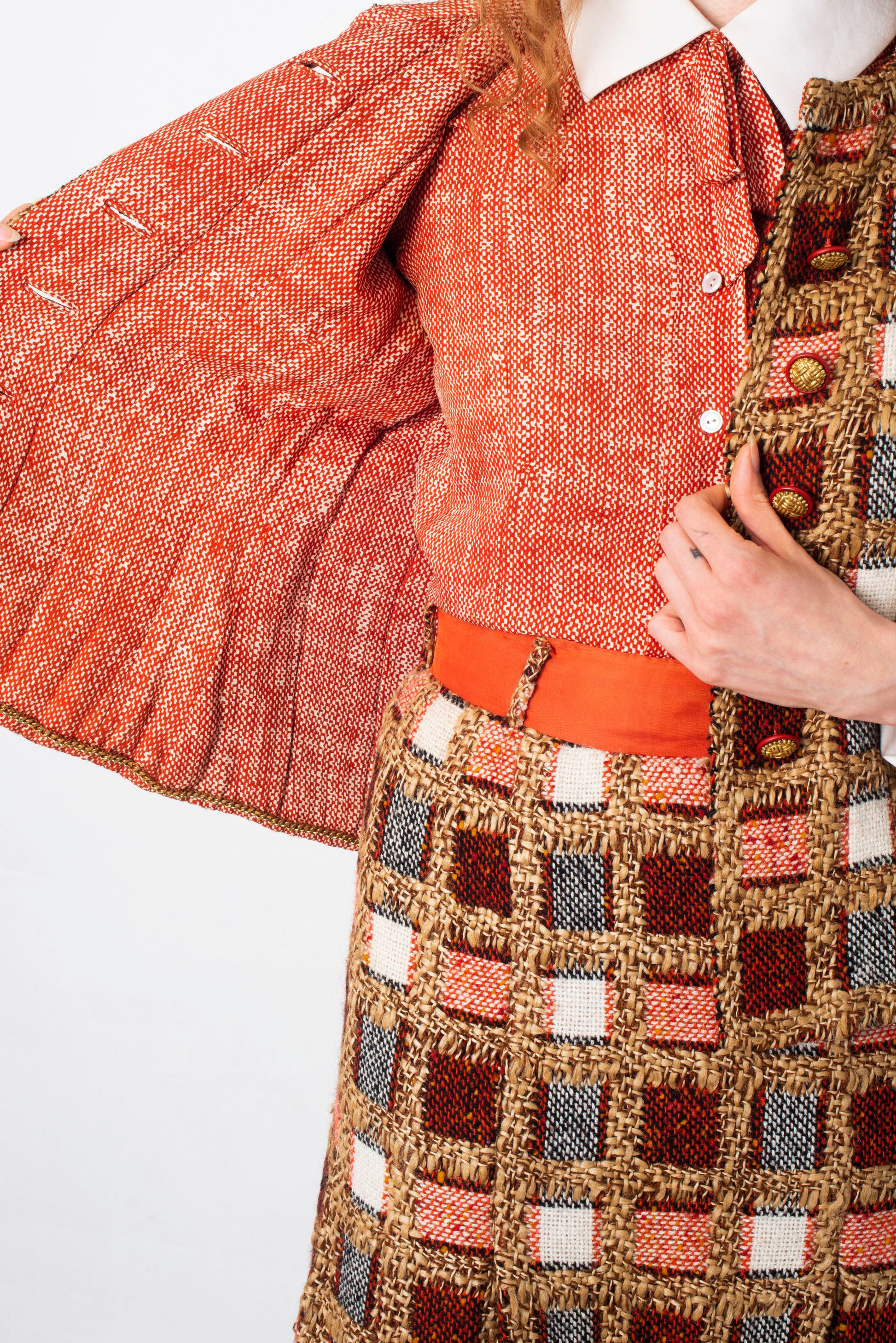 The suit is made of the most unusual and extremely elaborate tweed fabric in a beautiful fall color palette of red and browns.