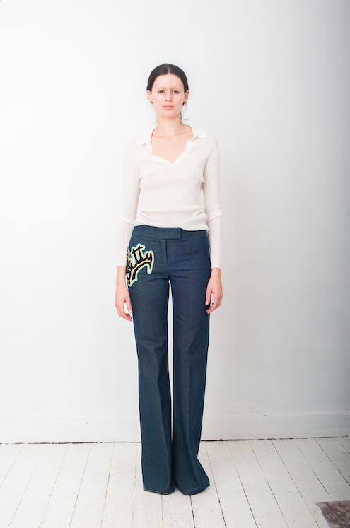 The trousers feature a patch in yellow, black and baby blue featuring a deer and the name “Betty”.