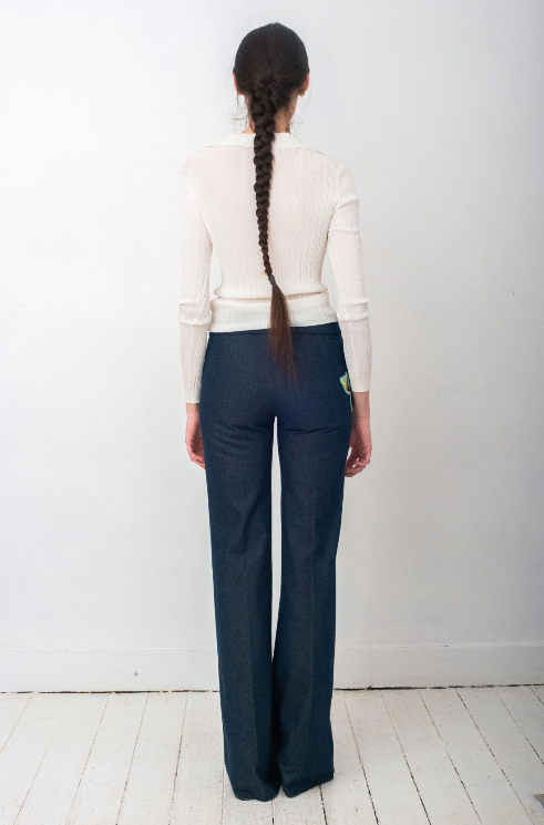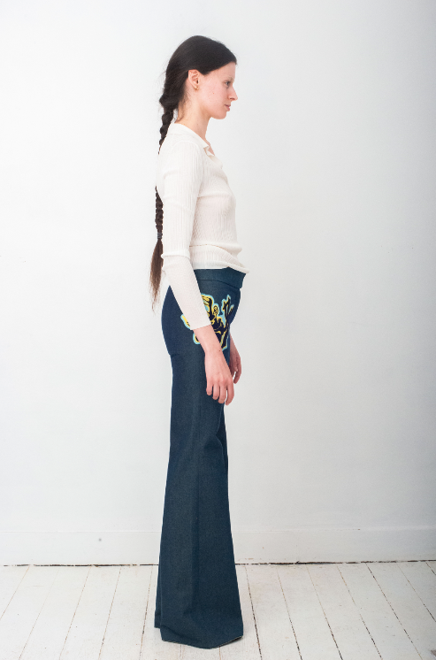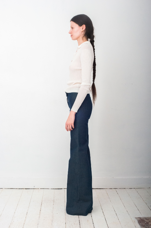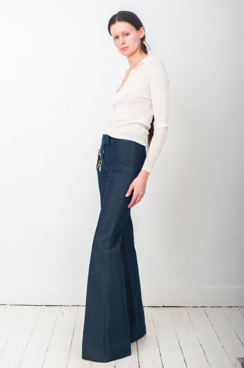 Flared low rise denim trousers that create an incredible silhouette and endless legs.