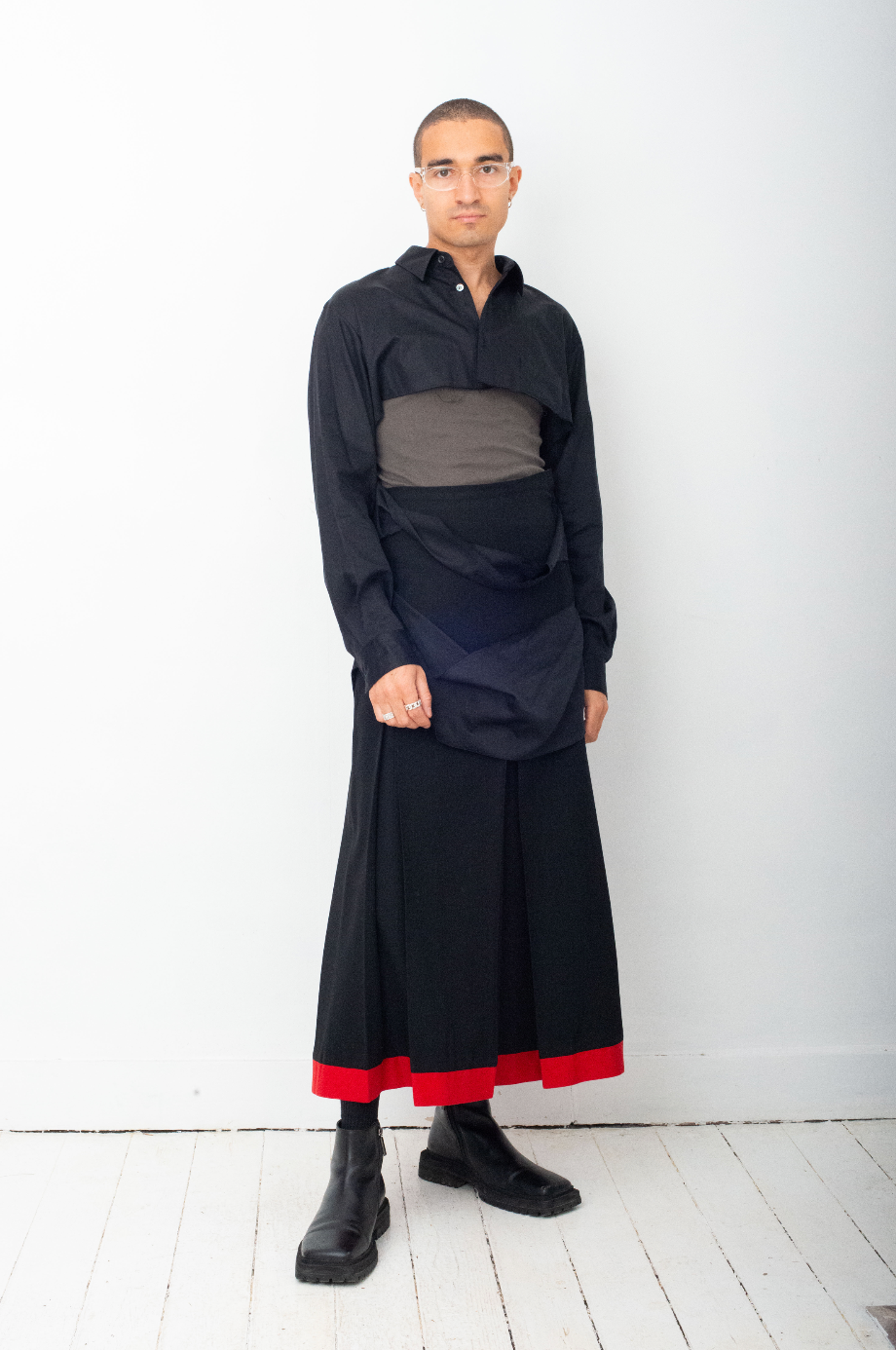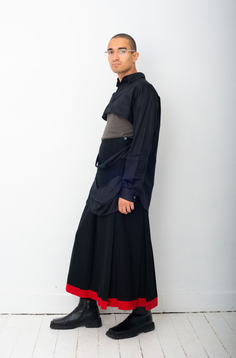 Here worn with Rick Owens tank top and a Yohji Yamamoto black pleated skirt, also available online.