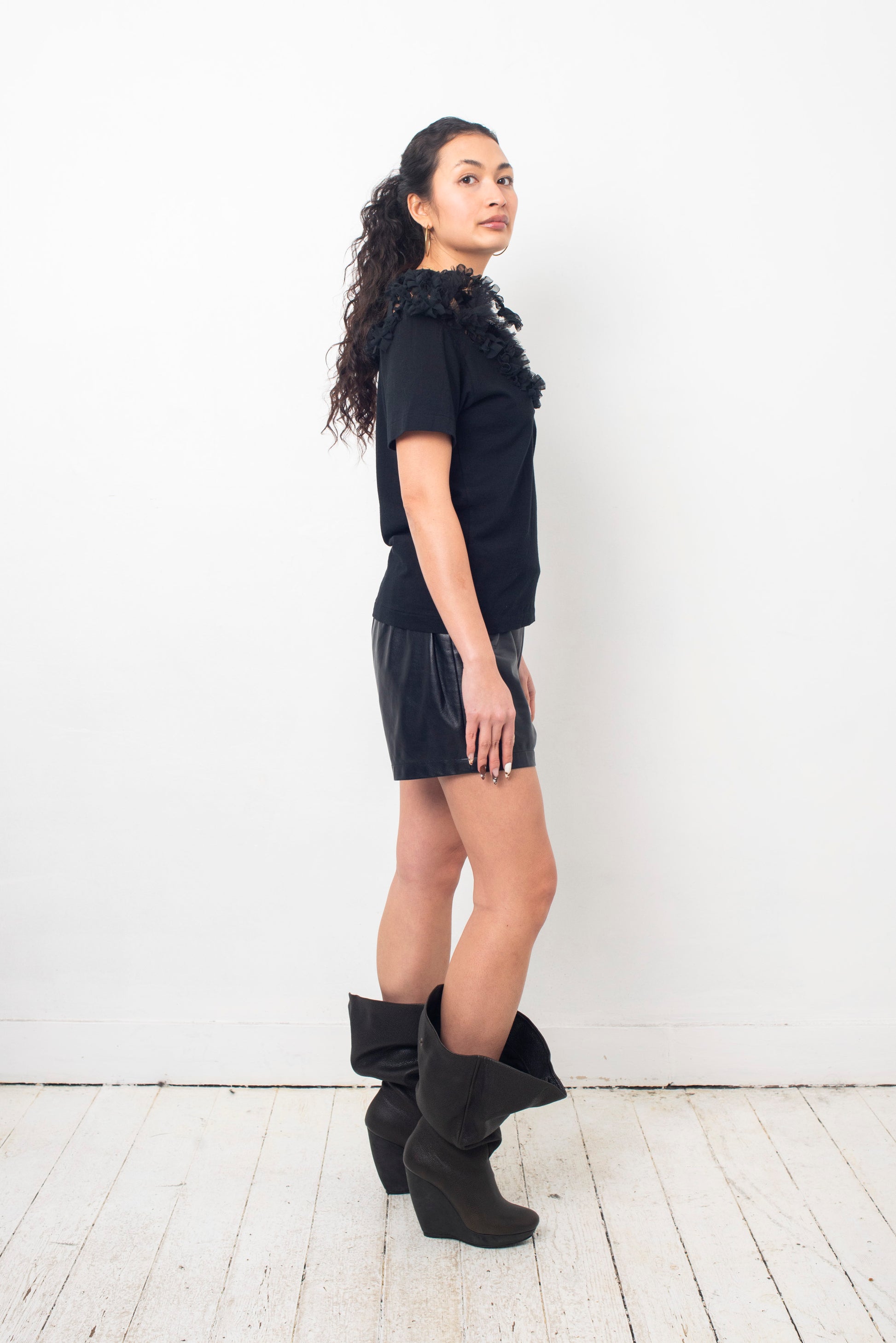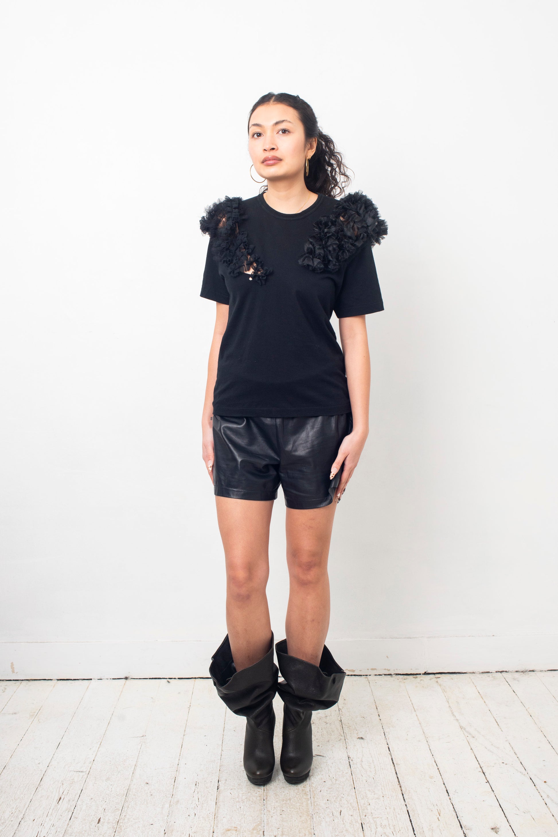 Comme des Garcons SS 2006 stretchy black T-shirt with ruffled tulle details on the sleeves.
