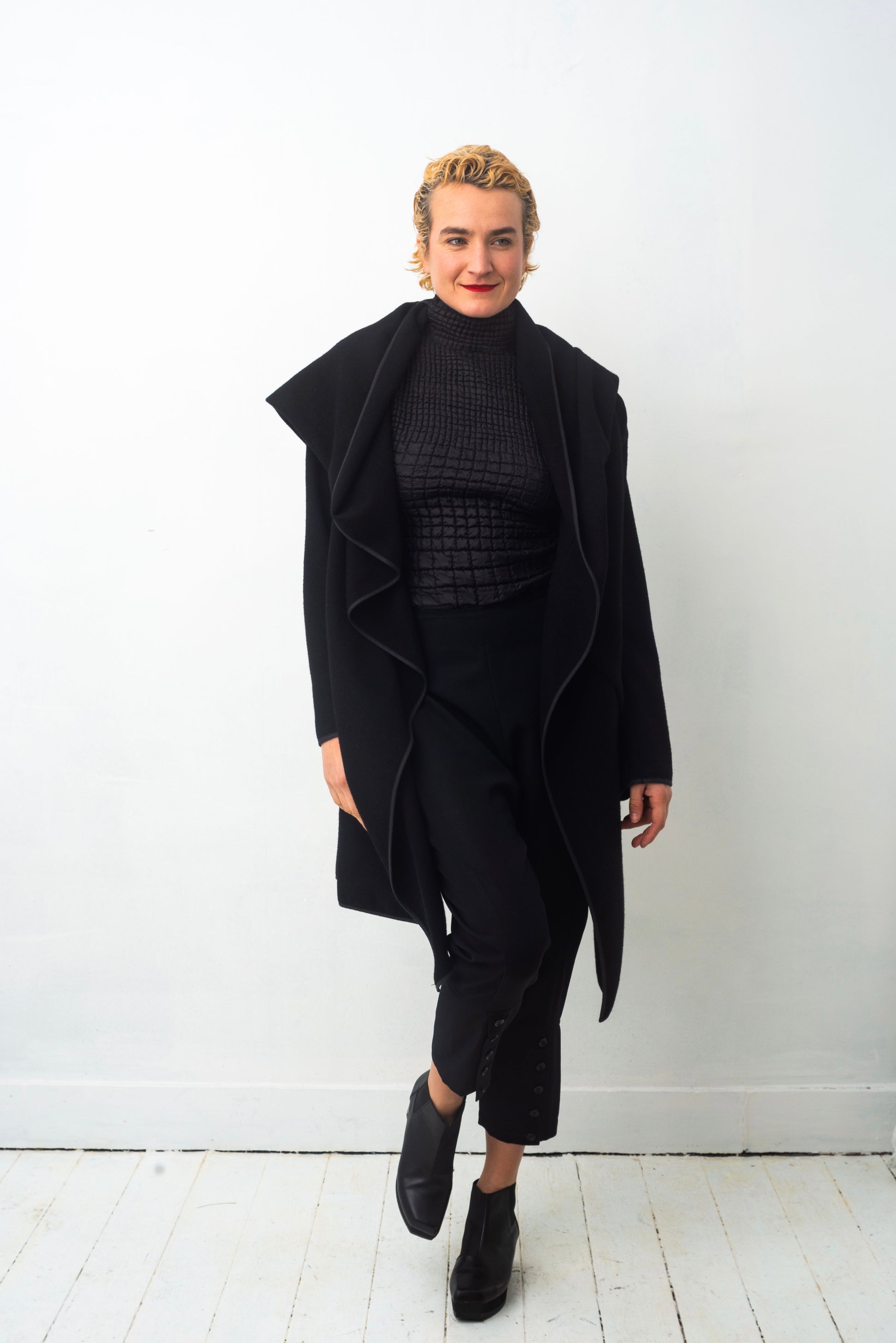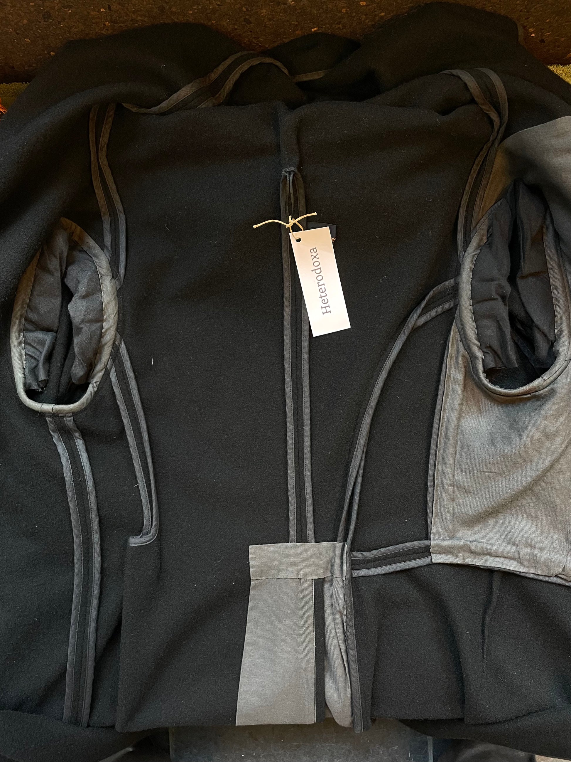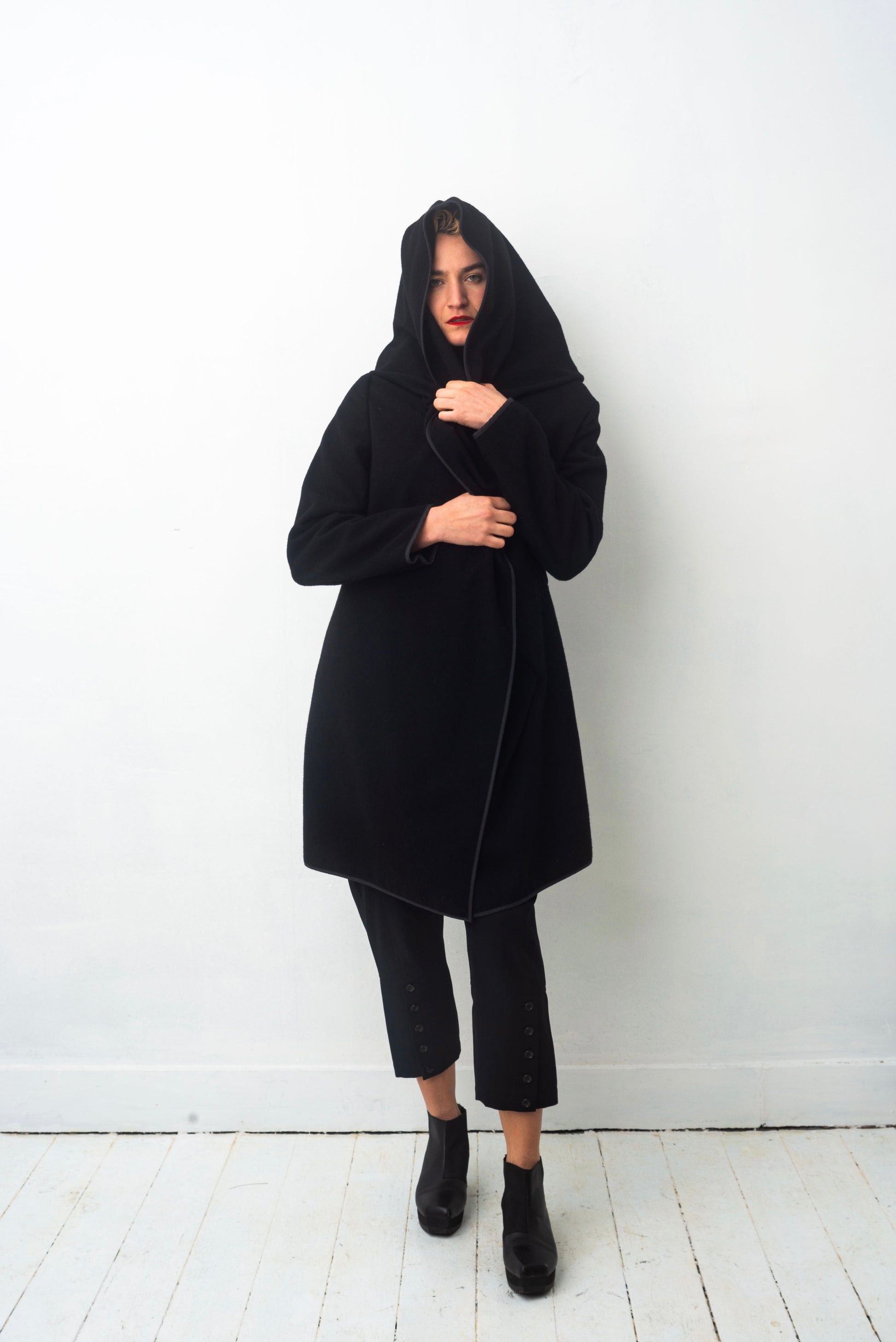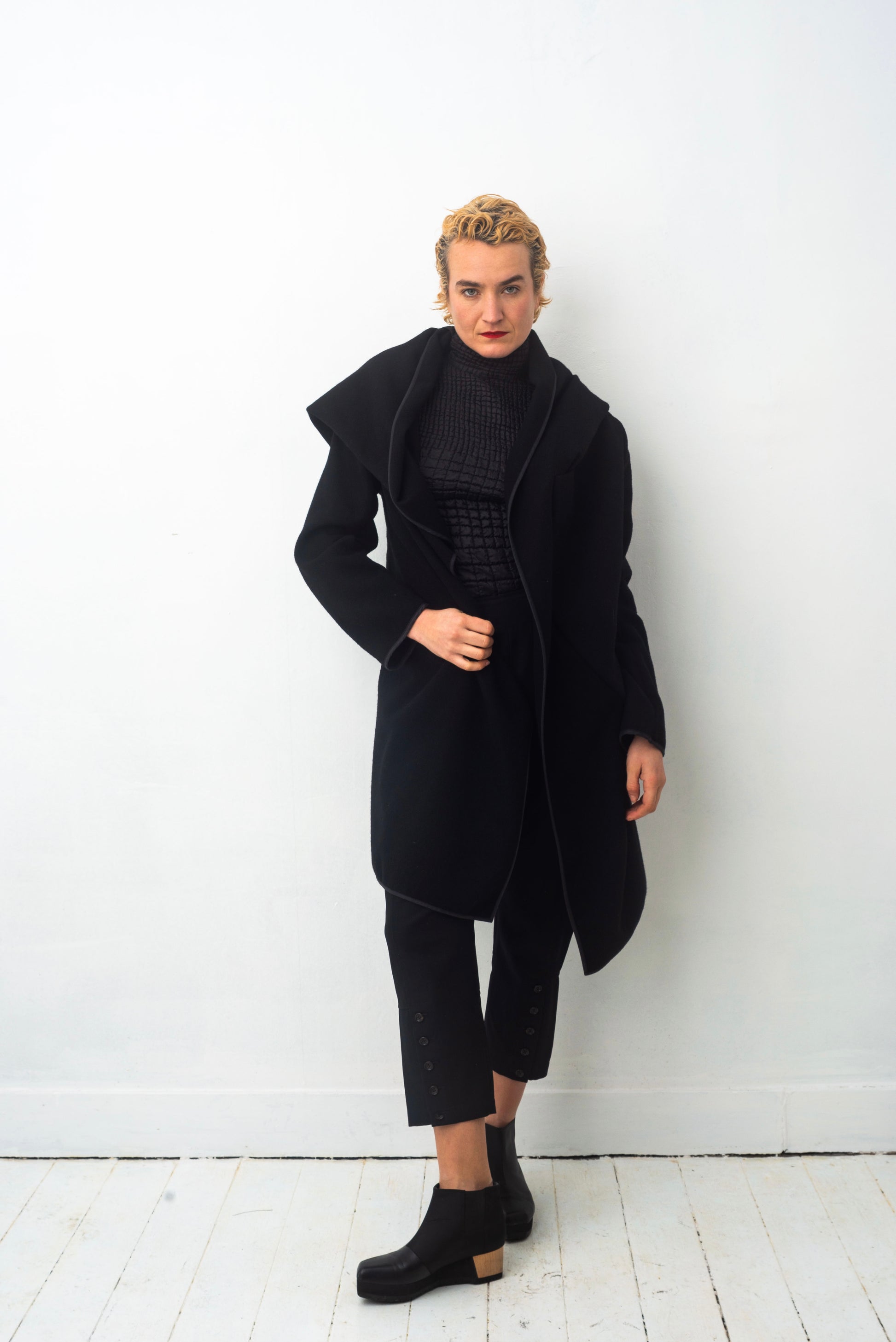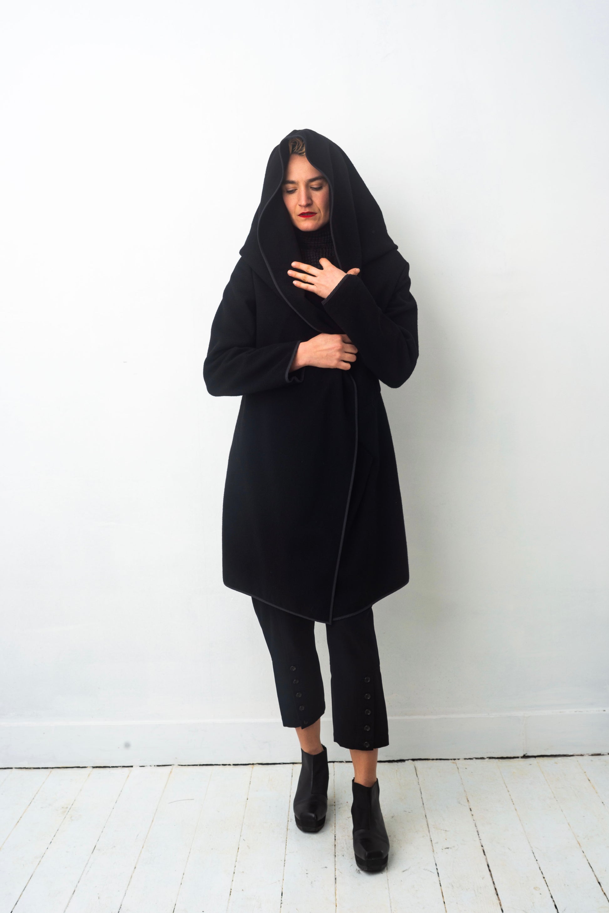 The result is a wonderful complex piece with a mysterious touch added by the extra large hood, full of unexpected small folds, stitching lines that depart from their original course, with assemblages of different fabric in the lining that give the piece structure.
