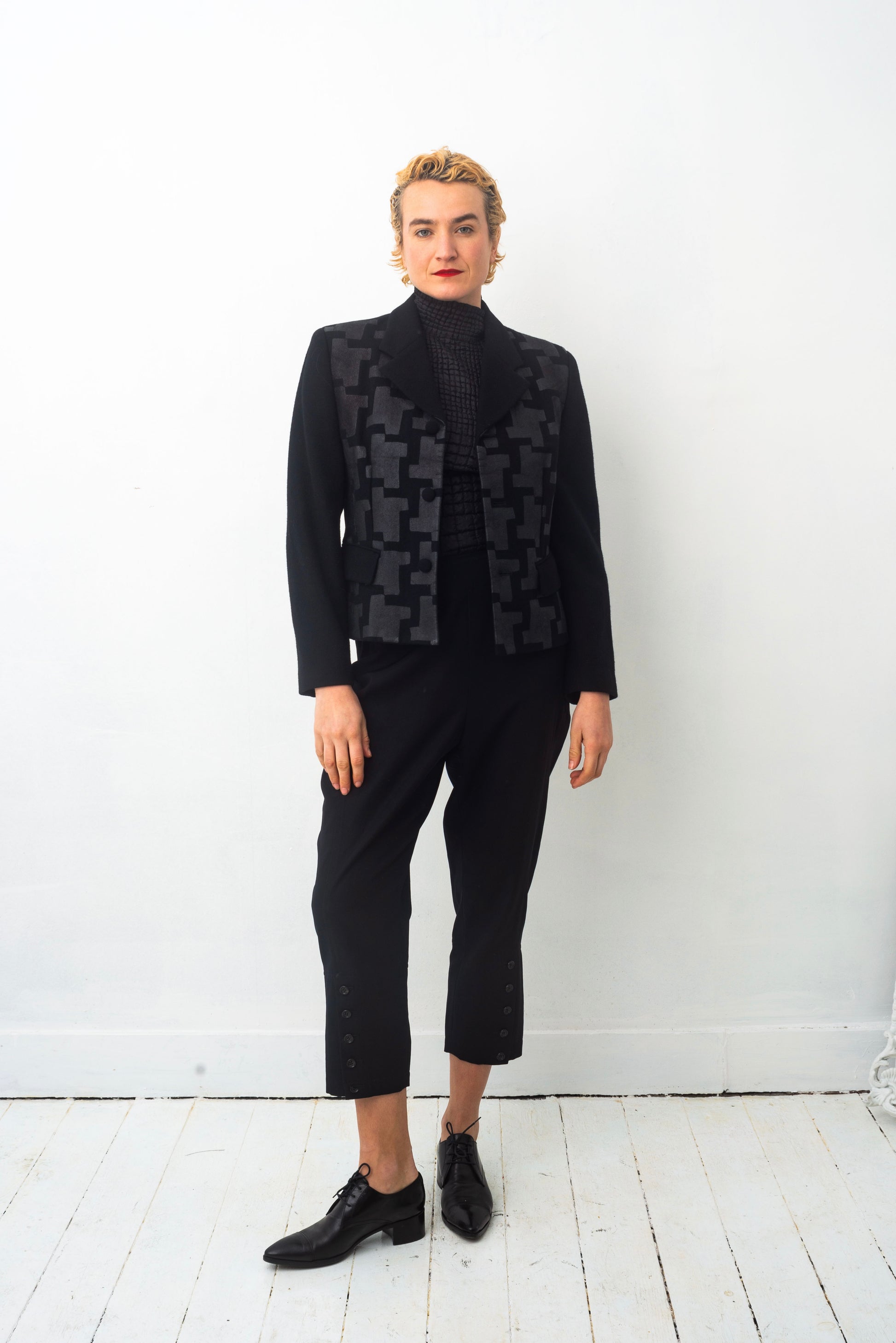 Fantastic Comme des Garçons main line jacket in wool with a embossed waxed graphic print that covers the front of the jacket, leaving the sleeves, back and collar plain.