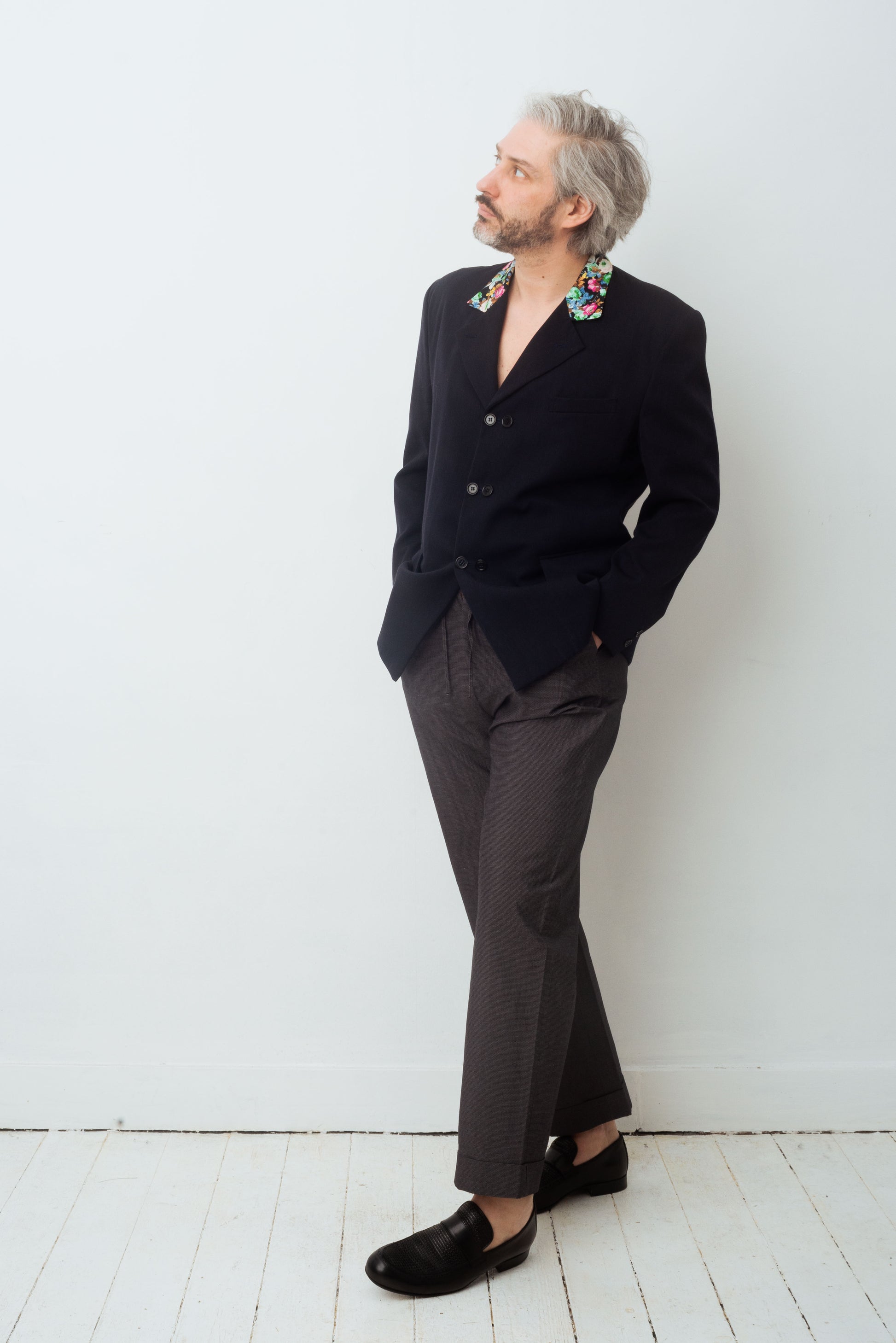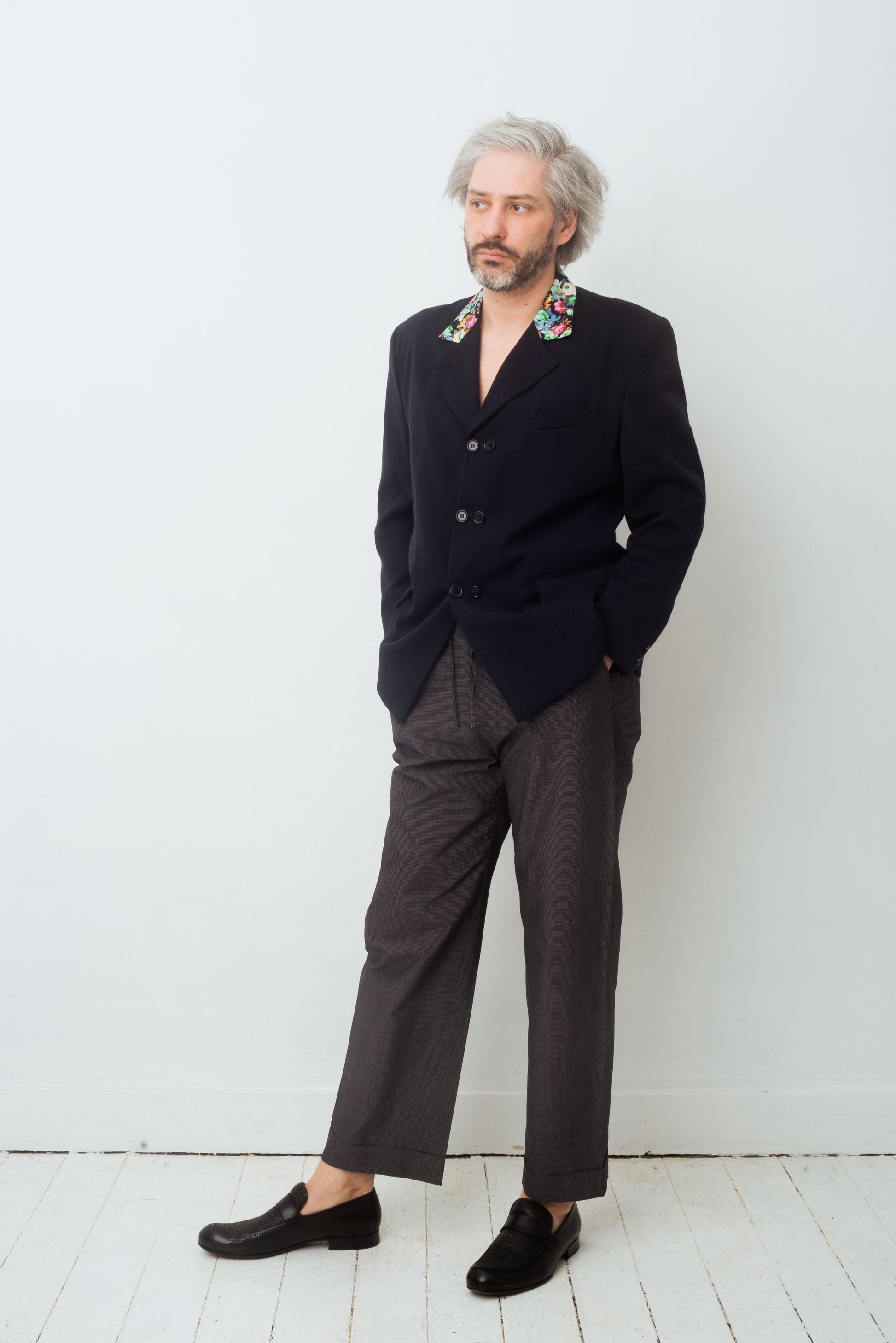 The jacket is made of a soft dark blue wool, with a floral printed collar and mock double buttoning. One breast pocket, and two front side pockets. The jacket is fully lined, with a straight fit and shoulder patches that emphasise a strong stature.