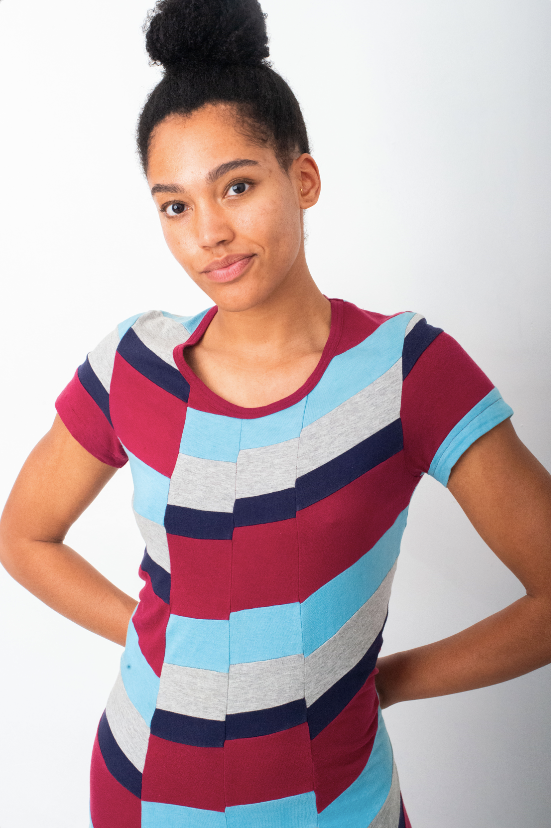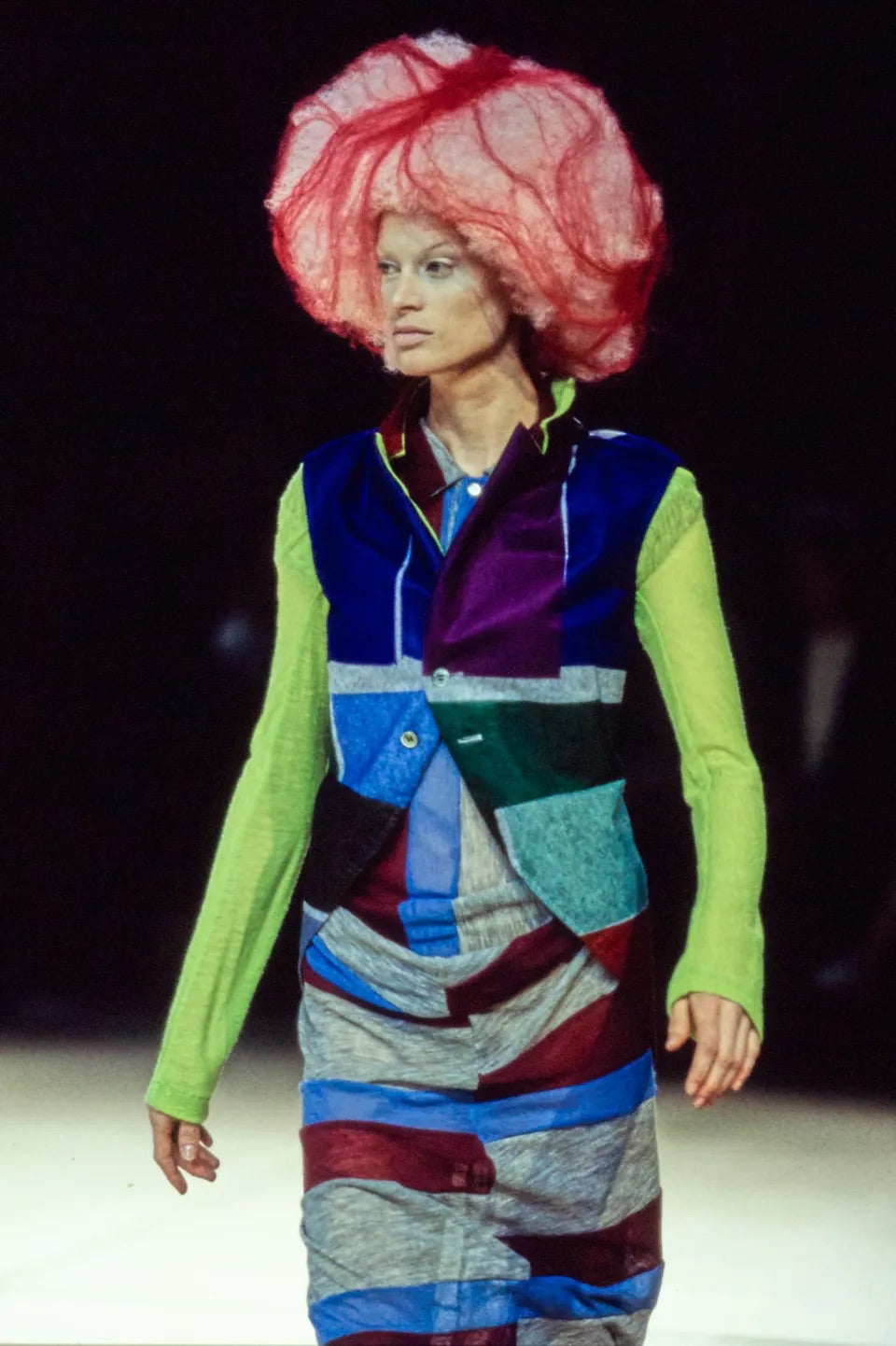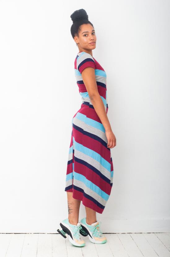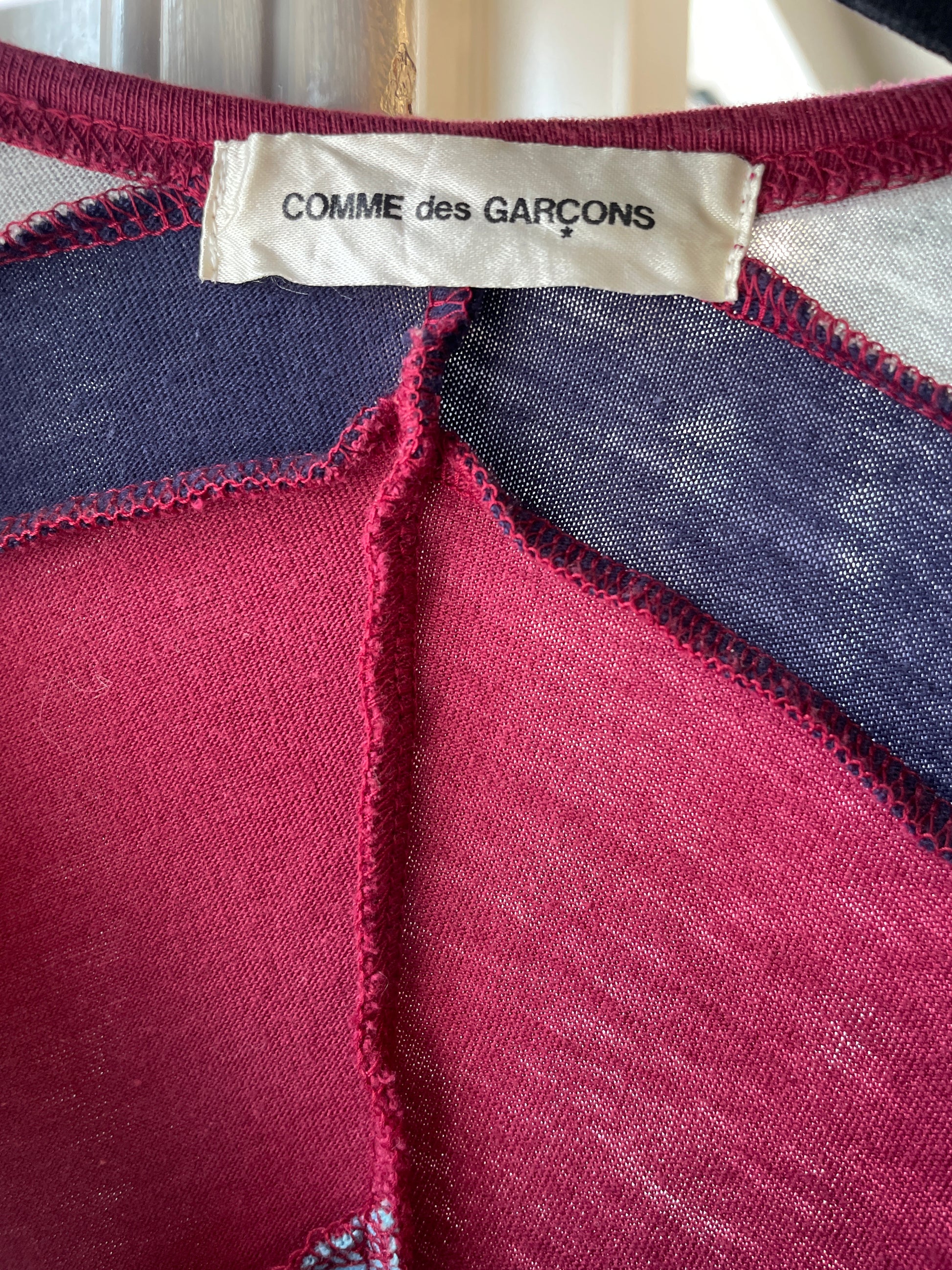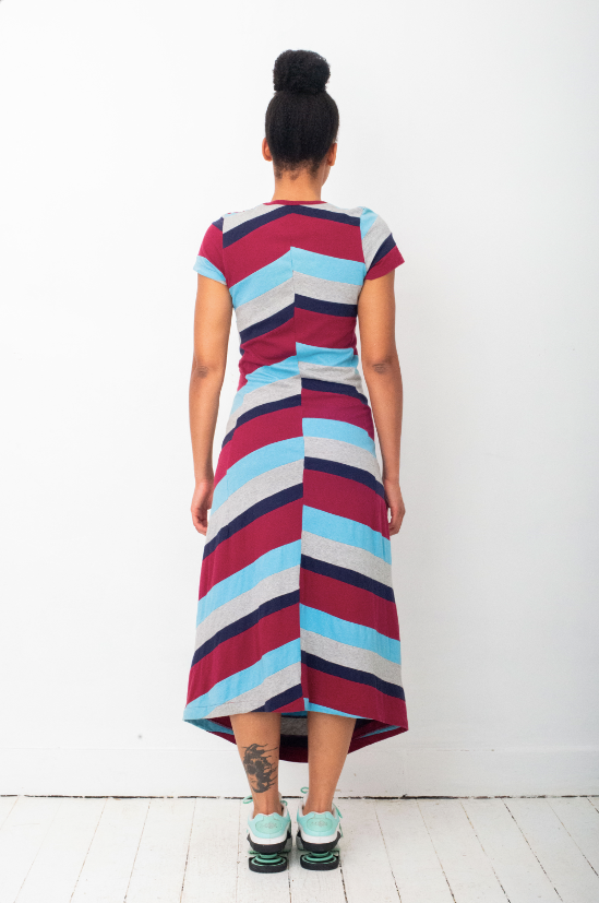 Playful dress from the Comme des Garçons 1996 Spring / Summer collection, made from a patchwork of 4 different coloured fabrics, creating a pattern of mismatched stripes.