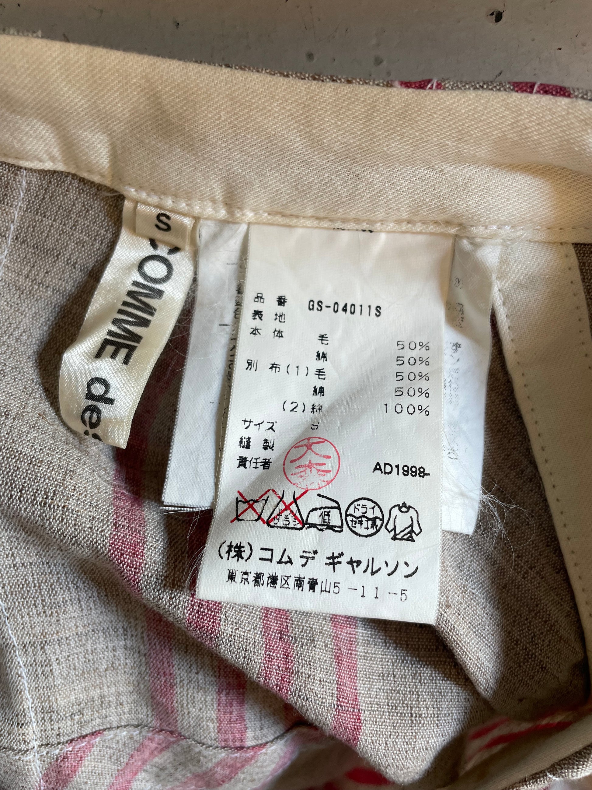 The skirt is testimony to Rei Kawakubo’s legacy of deconstructing garments and putting them back together in unexpected ways. The skirt is made of two different fabrics, a striped brown and red wool fabric and a soft beige cotton.