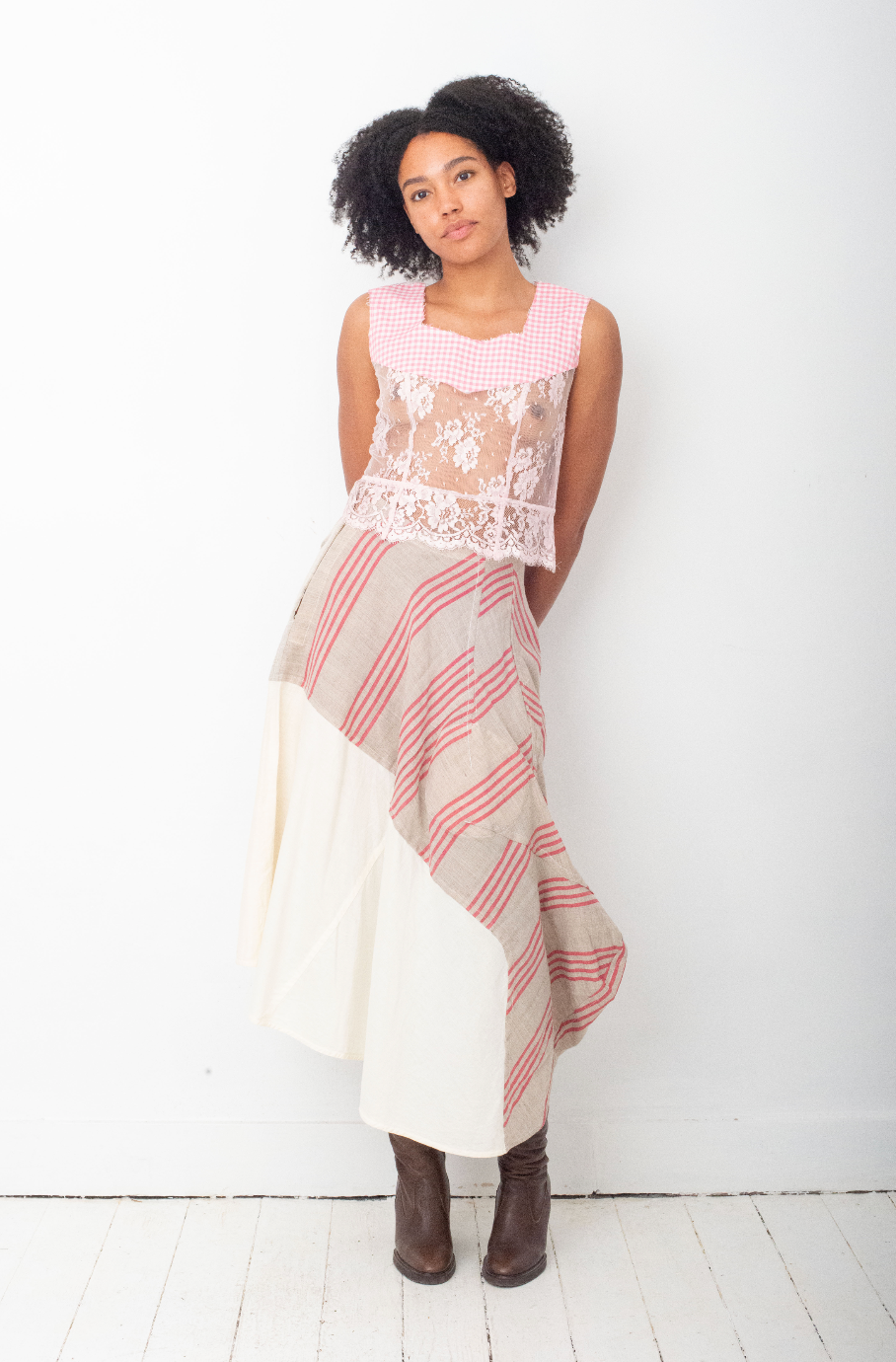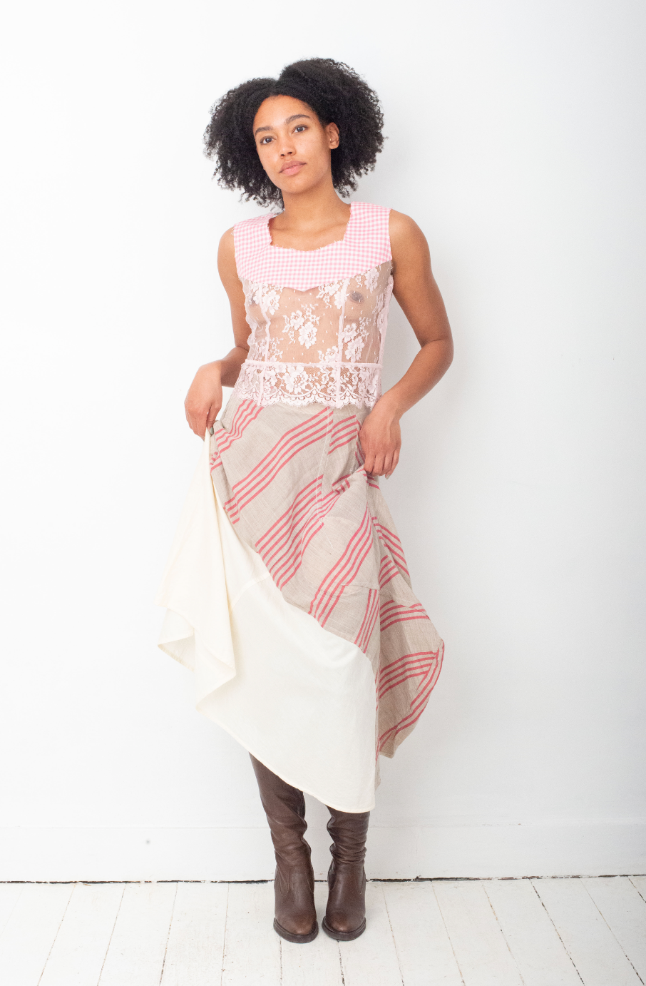 The skirt is sewn in a patchwork fashion, with a padded circle shape in the front, and a organic round shaped extension of the striped fabric, creating a draped effect.