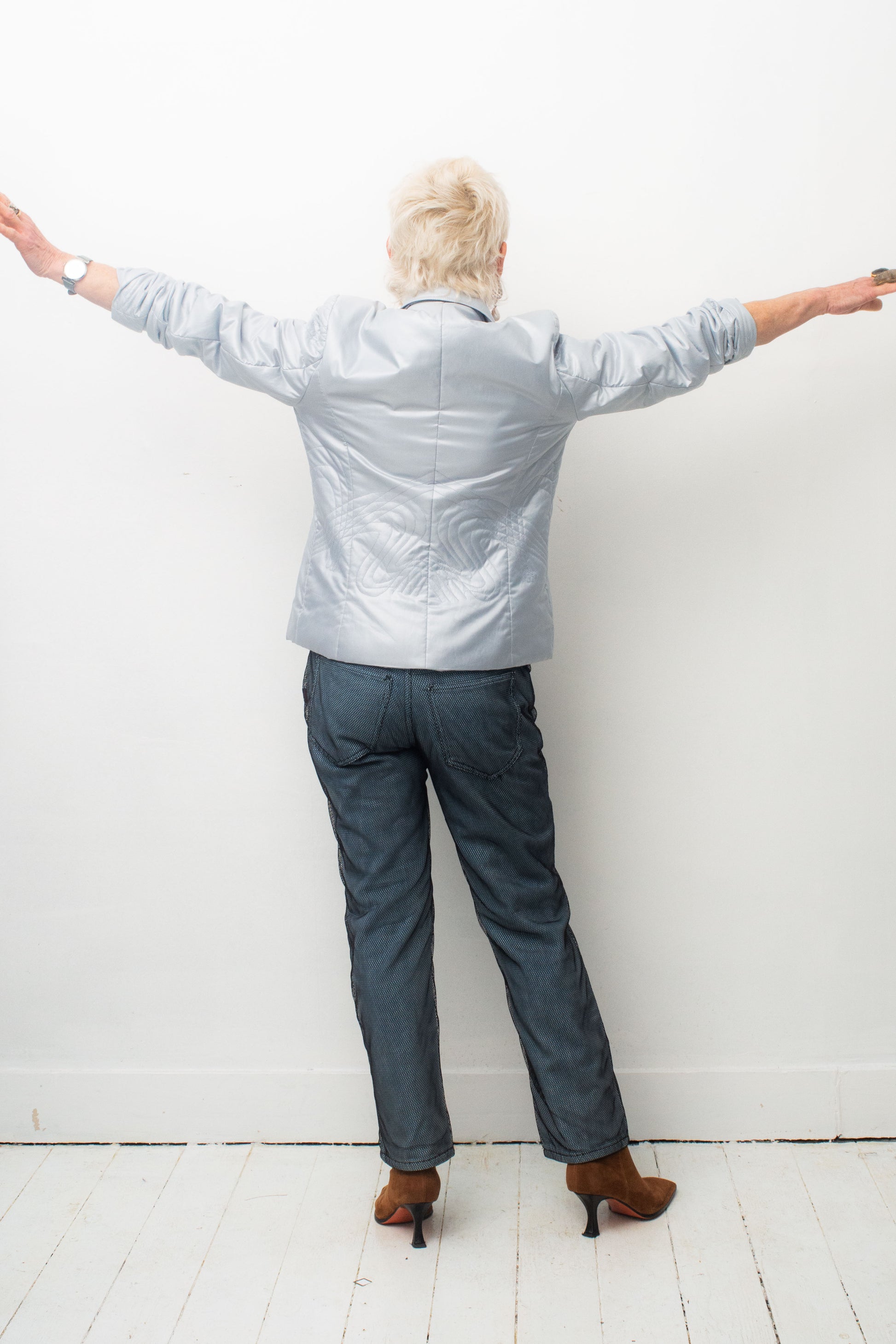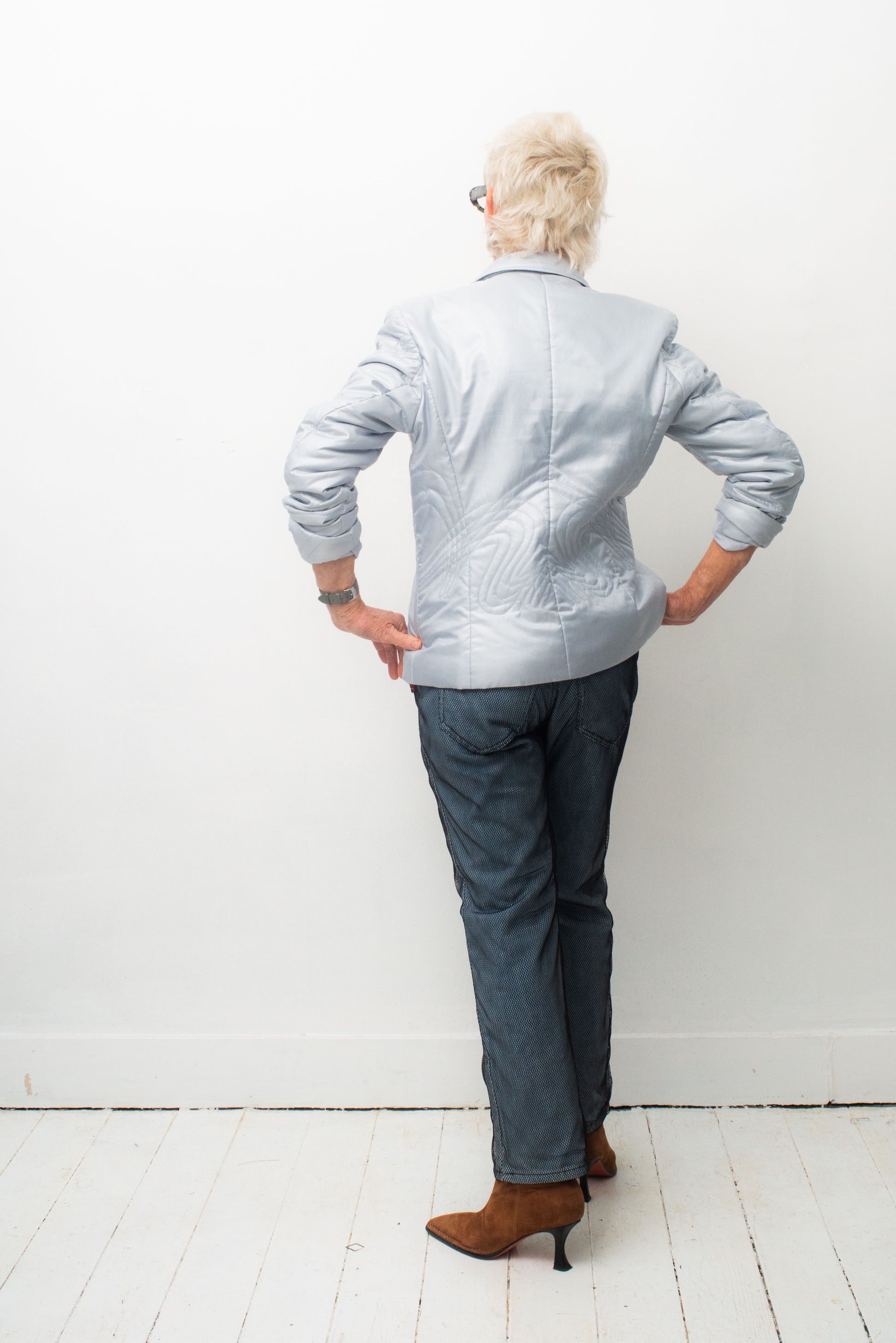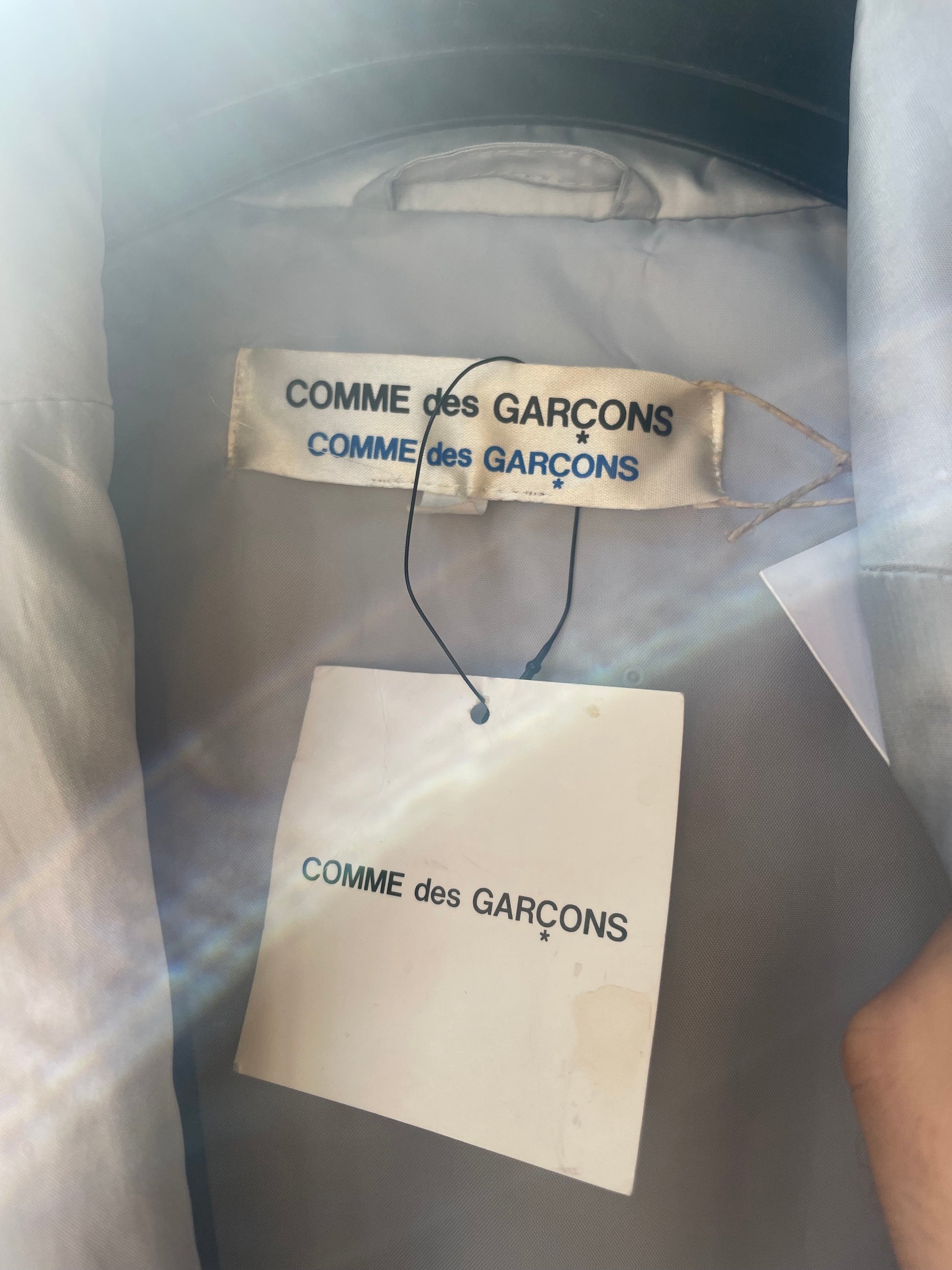 A futuristic Comme des Garçons Comme des Garçons jacket in a blue silver padded nylon from 2006.