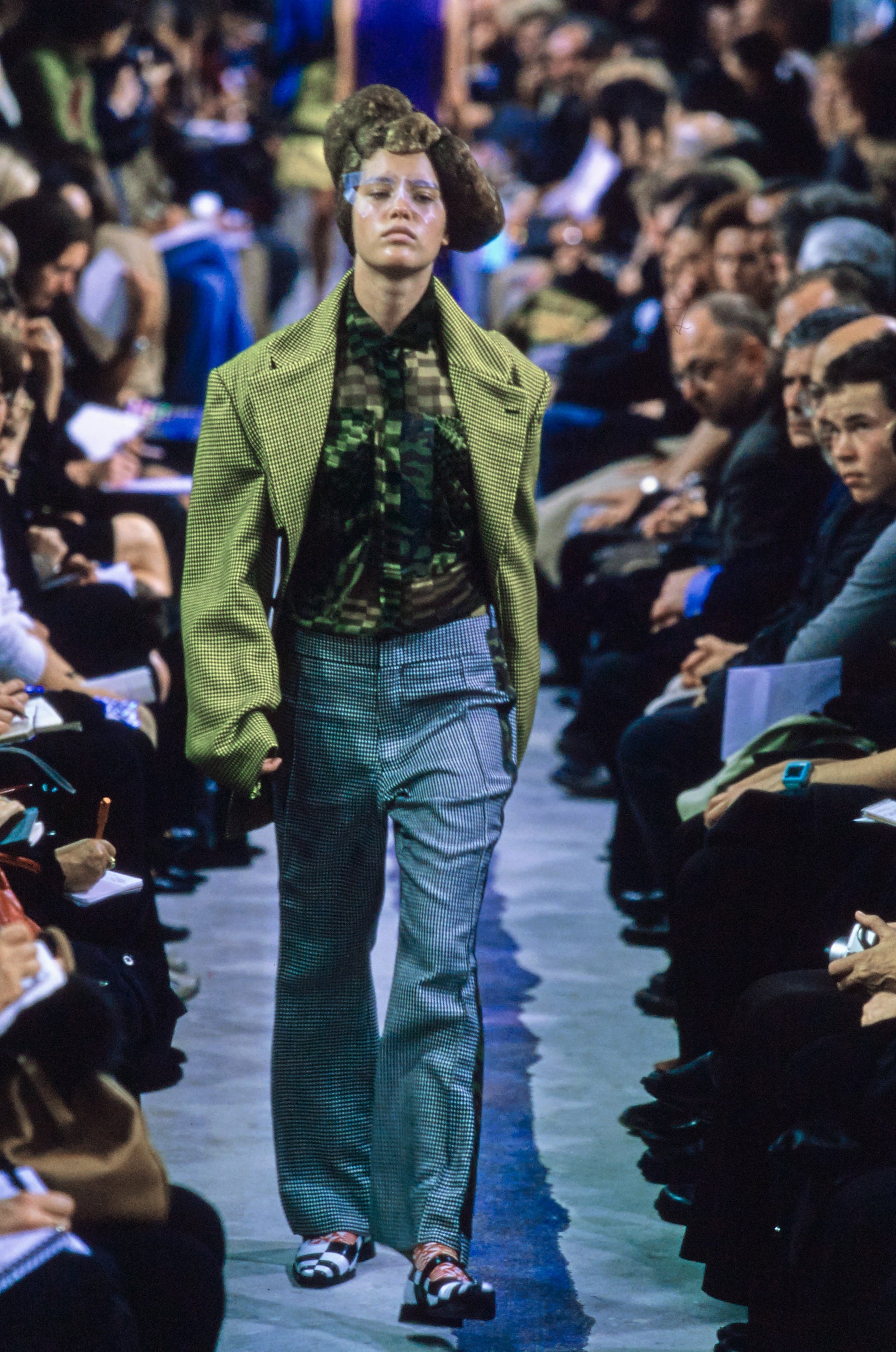 Rei Kawakubo’s work in the early aughts is marked by its graphic impact, and her Spring 2001 collection is a case in point. Titled Optical Shock, it mixed camouflage with dizzying Op Art patterns and florals, and see-through jeans with fantastical millinery made with materials like plastic bags, bubble wrap, tinfoil, and caution tape.