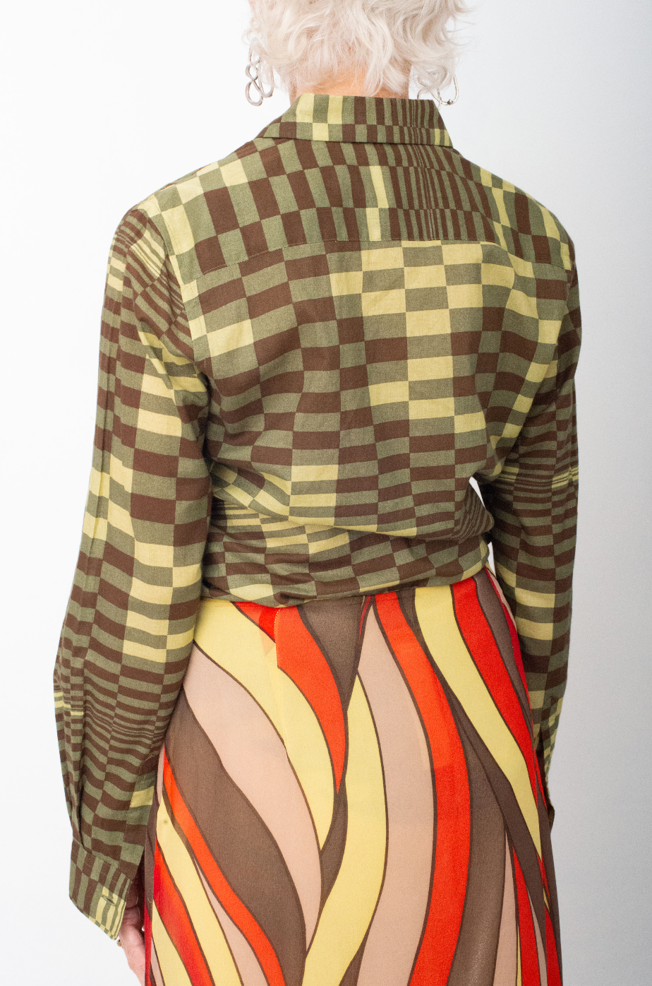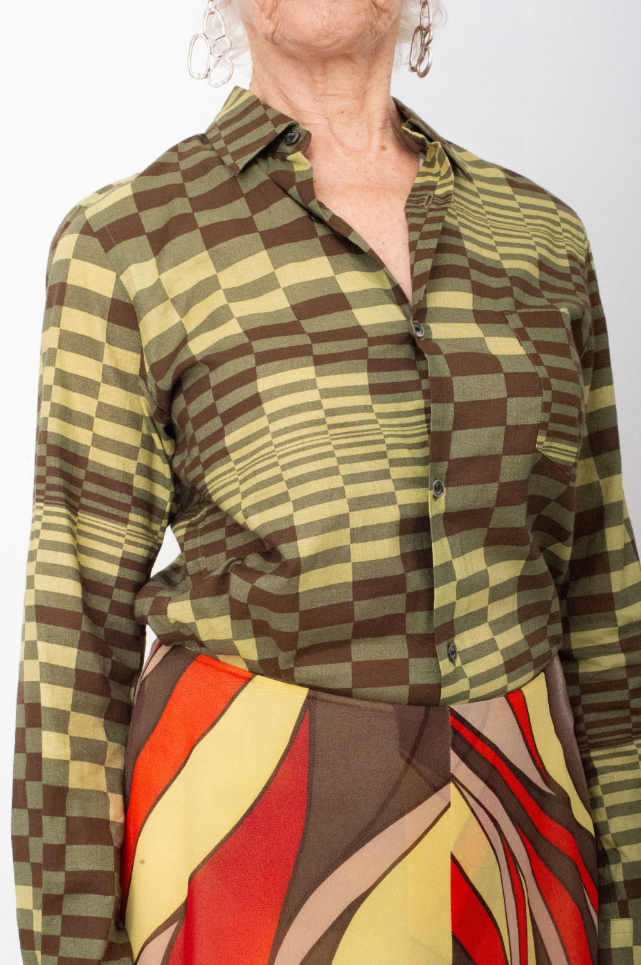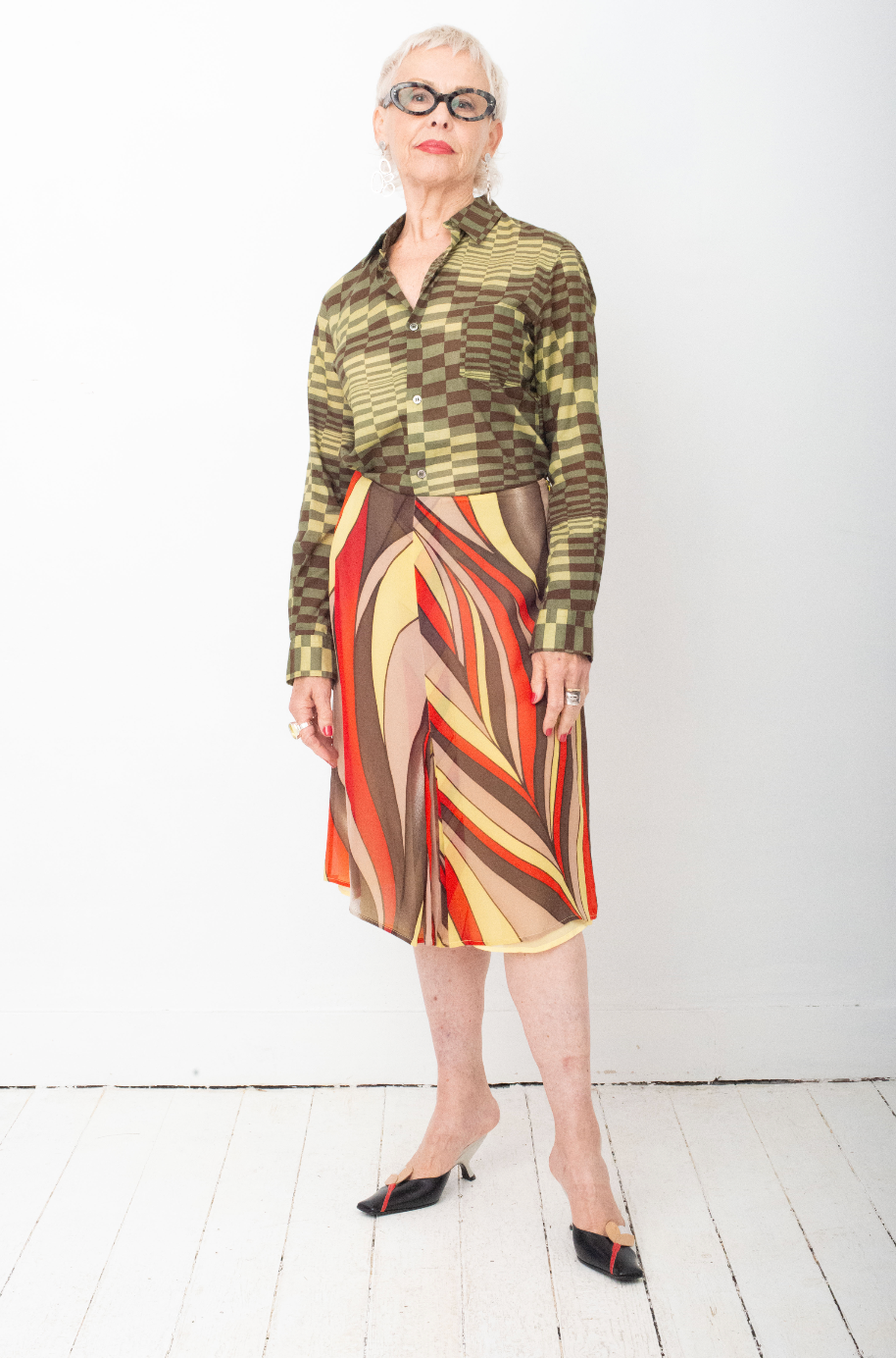 Here worn with a Gianni Versace swirl silk skirt, also available online.