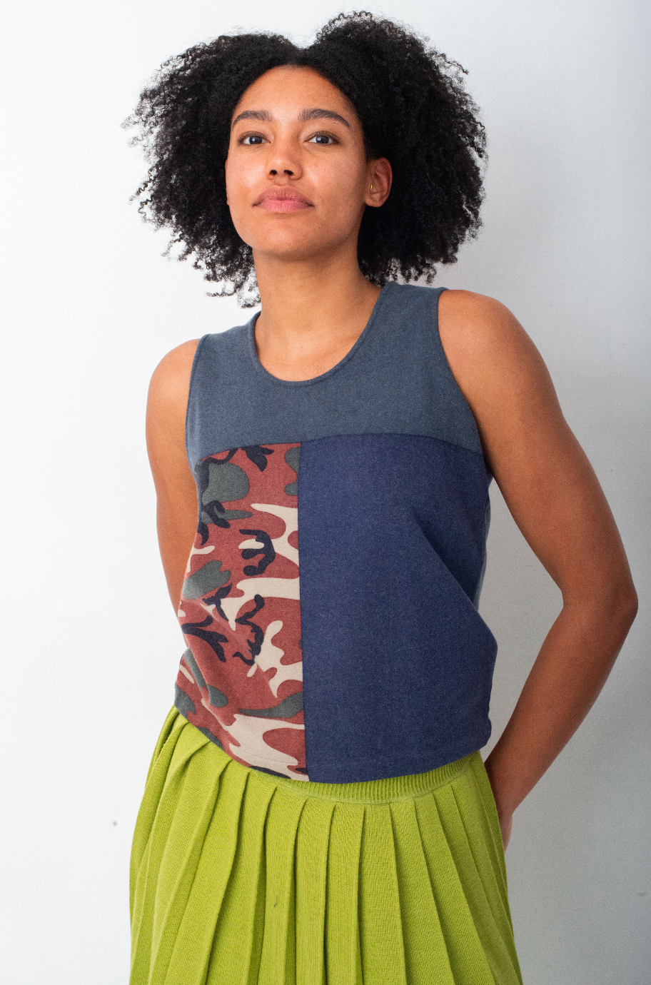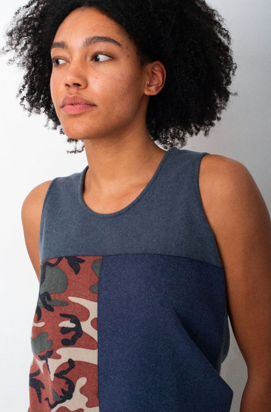 The print is devided into sections: two different shades of blue and a brick red-dark olive green-beige-black unique camouflage pattern.