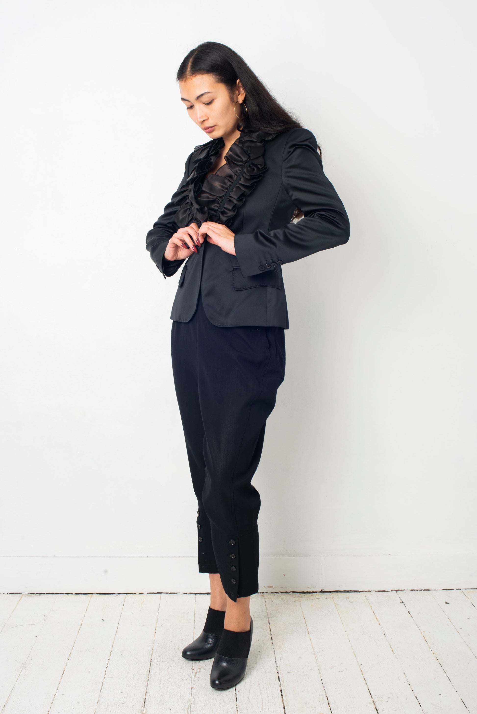 Very elegant D&G silk black blazer with a ruffled collar and shoulder pads, giving her an 80s touch, albeit in a contemporary fashion.