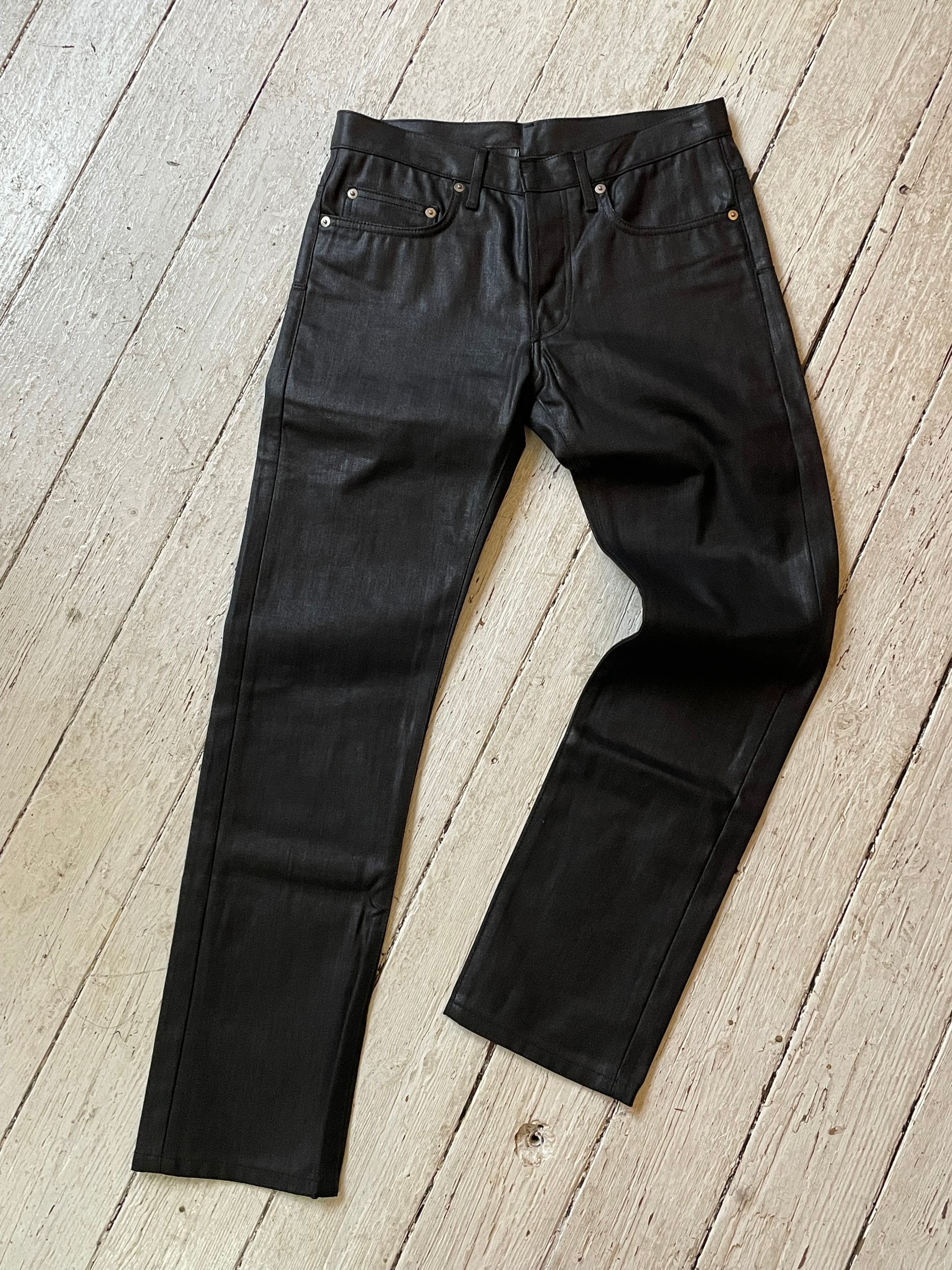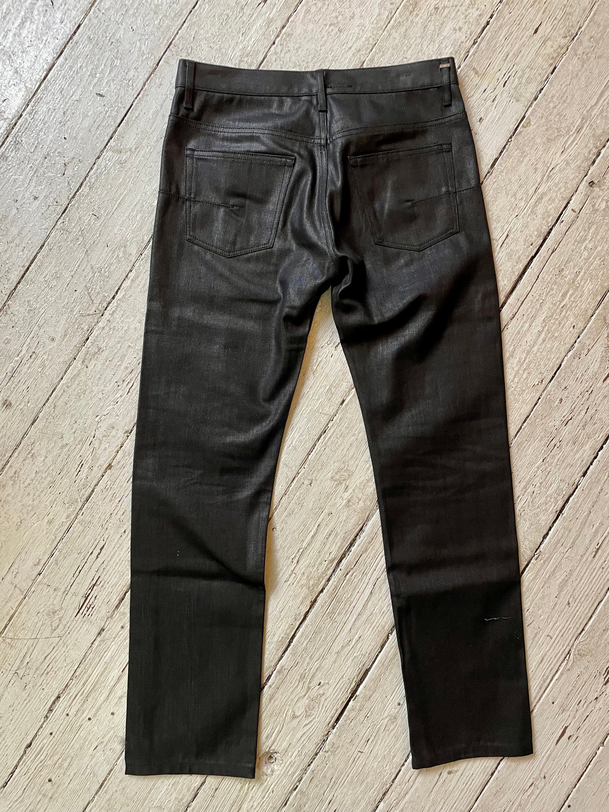 From the iconic period of Hedi Slimane at Dior, ultra skinny waxed black denim jeans.
