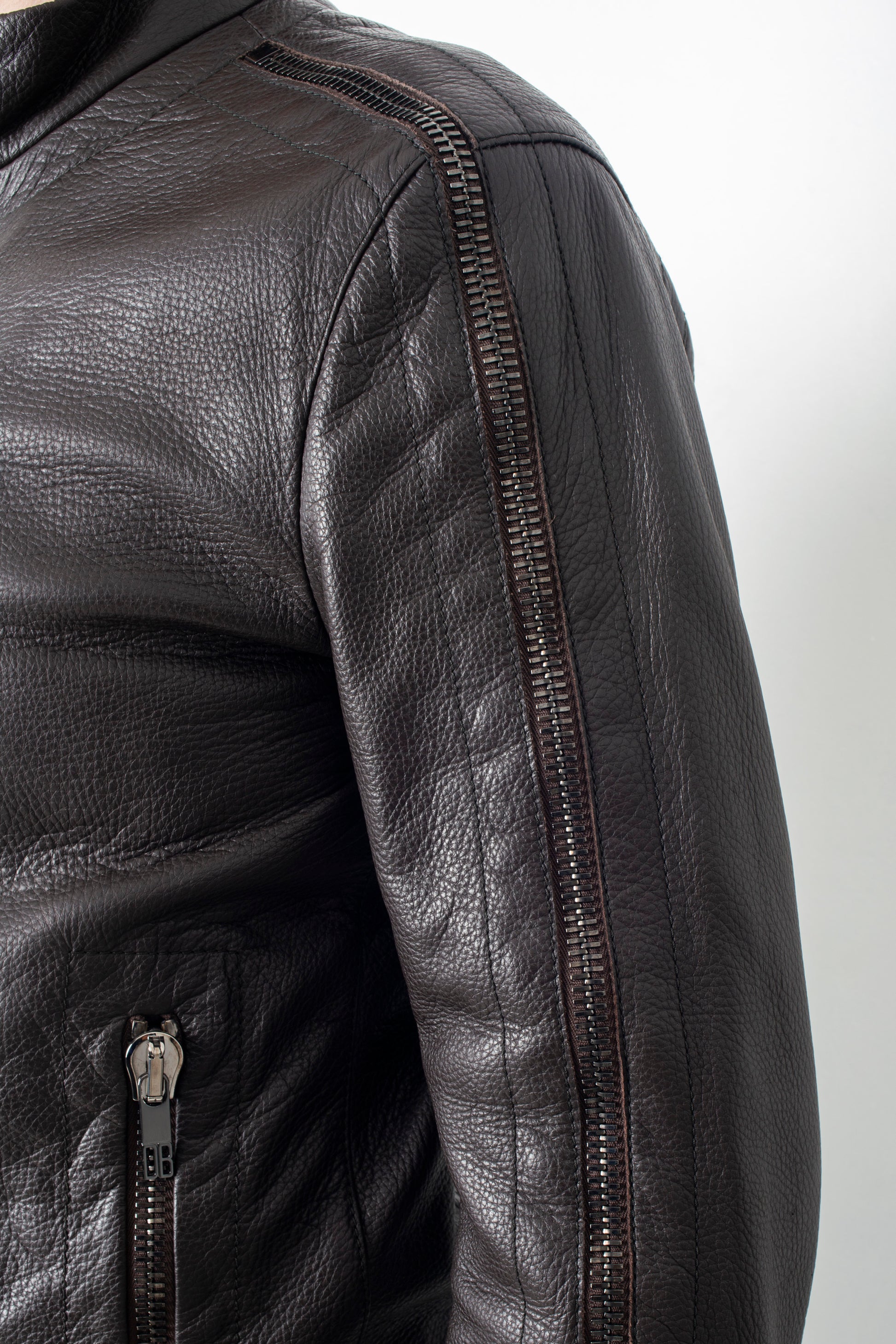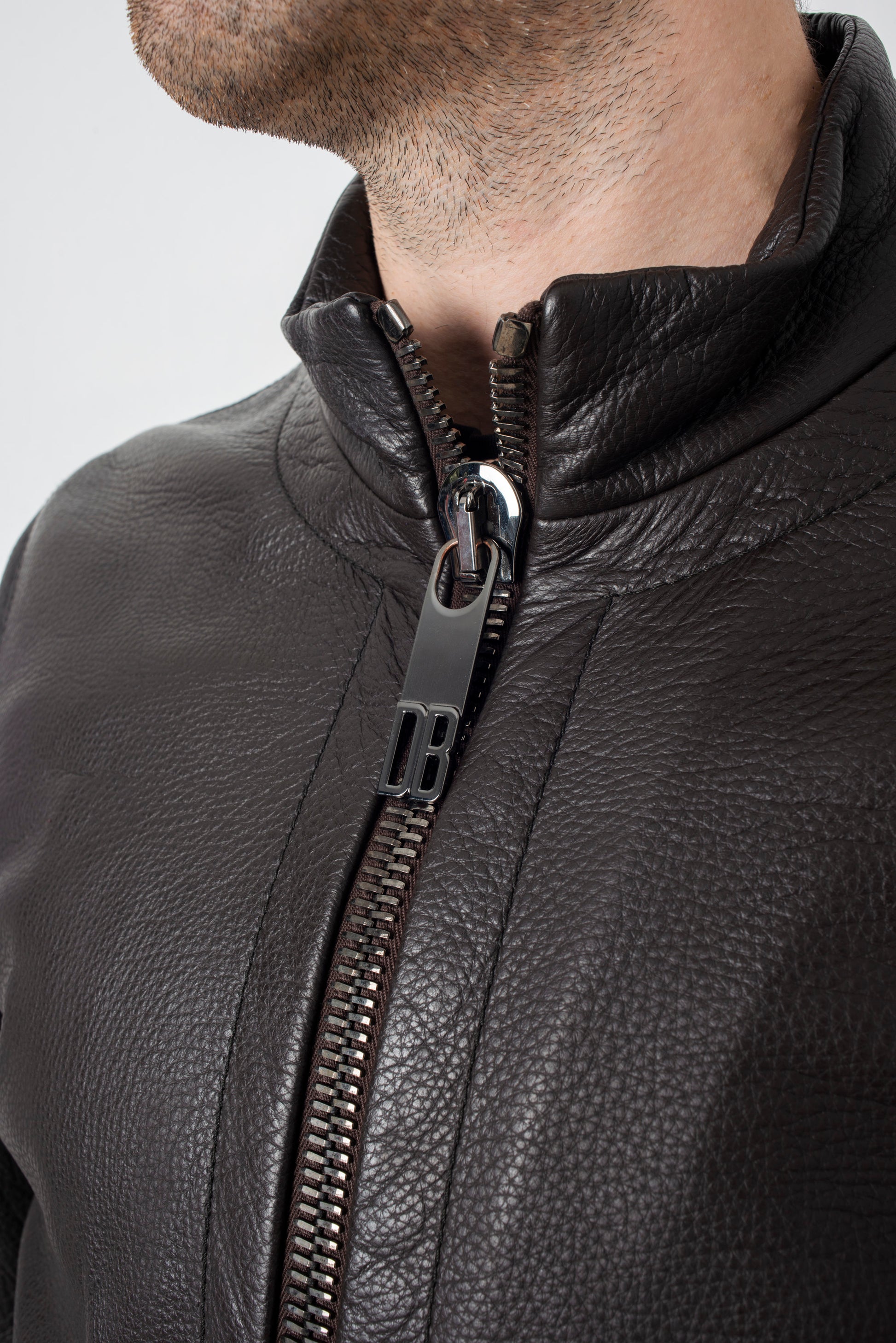 The jacket is made from a heavy textured deer skin leather, fully lined with a zip closure bearing the initials DB