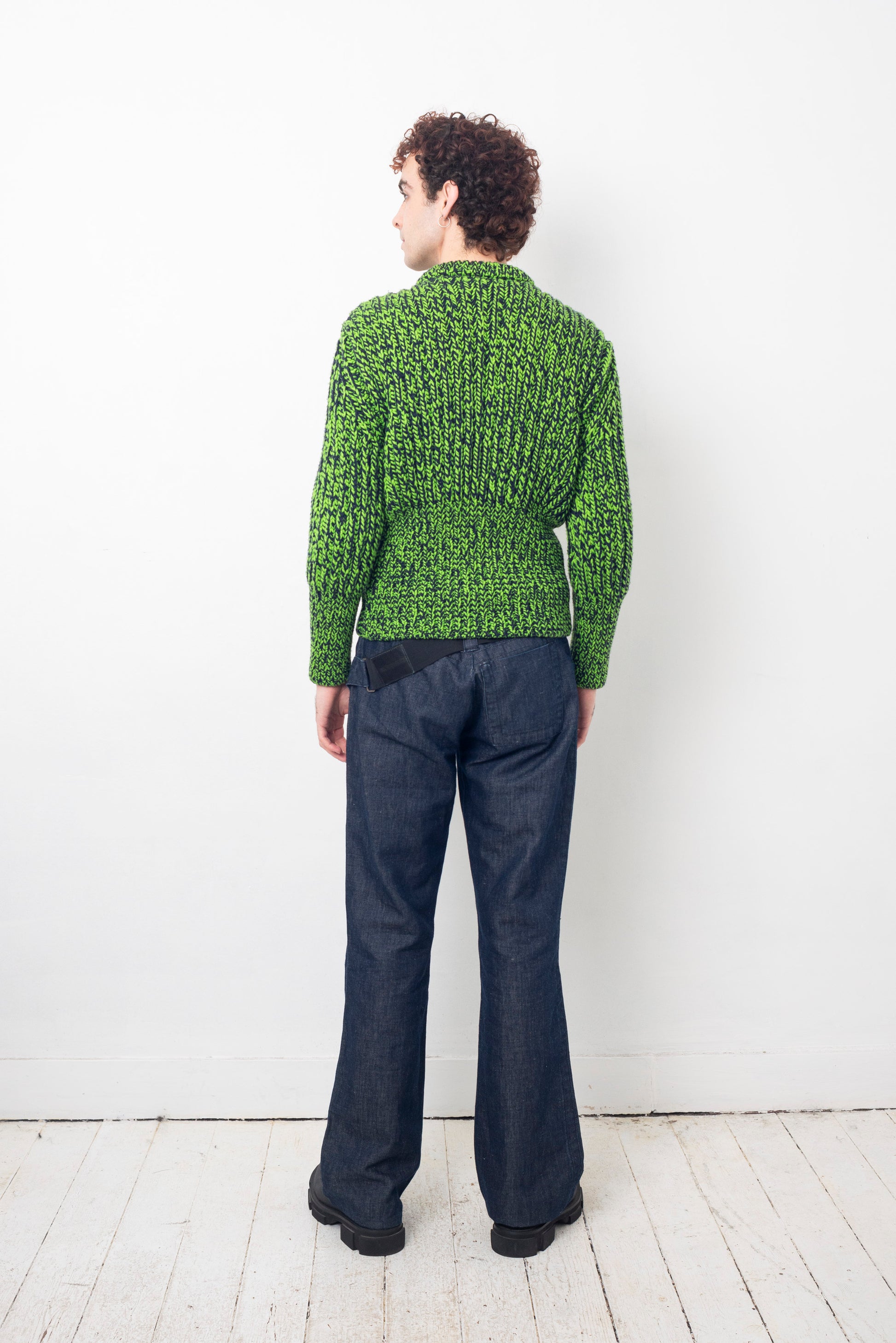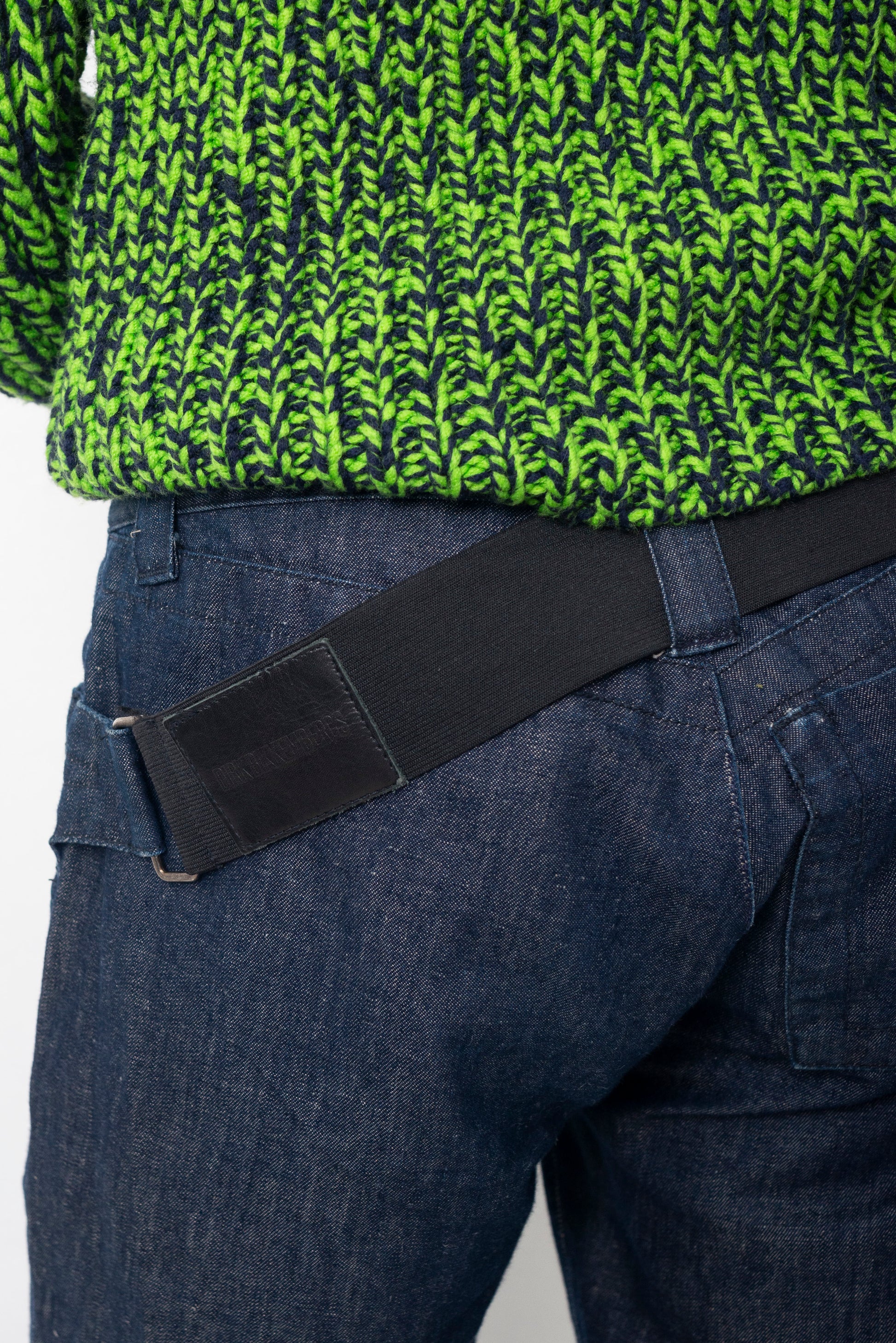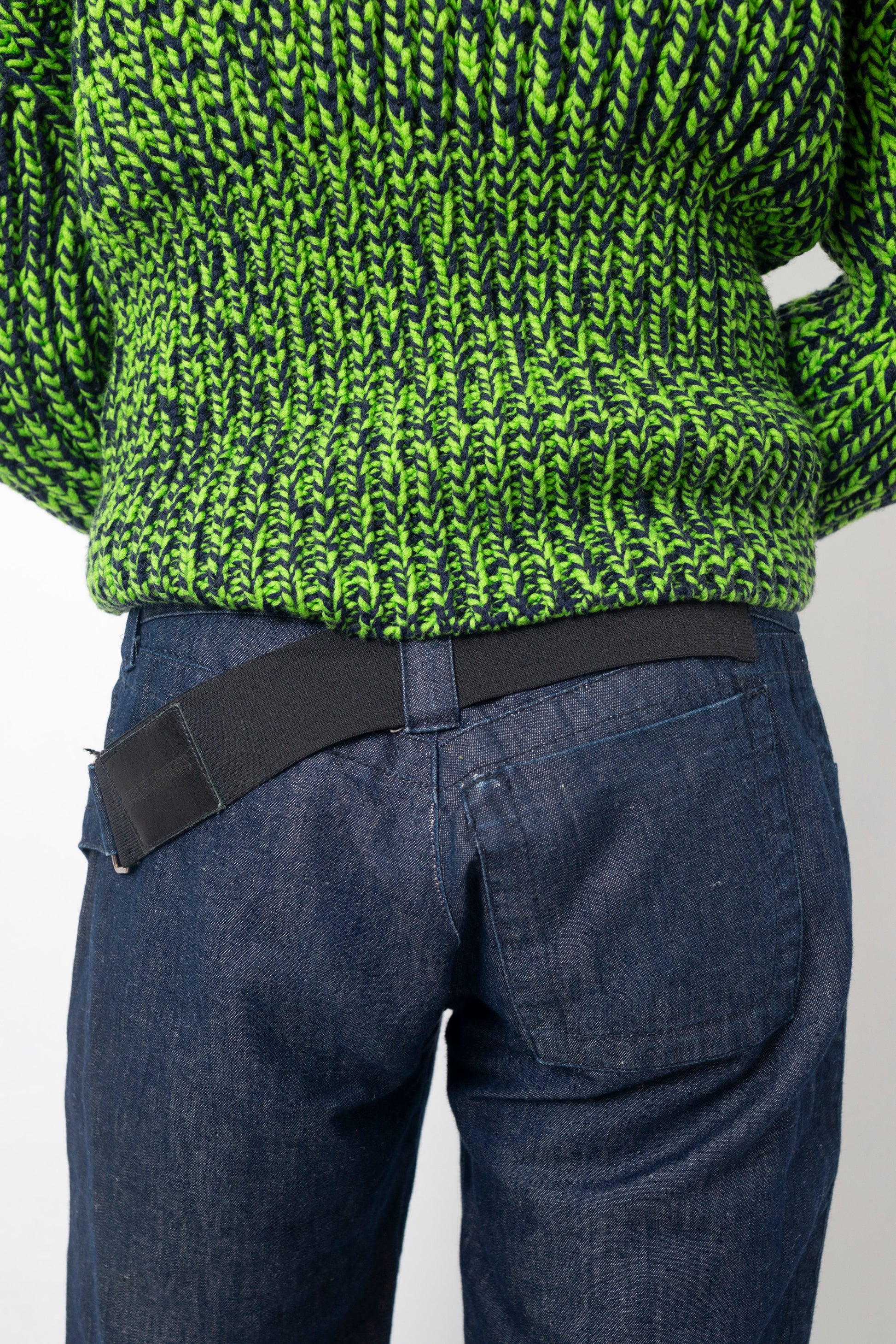 Denim trousers by Dirk Bikkembergs from the 2000's with an asymmetric elastic belt detail in the back that hangs casually off the left thigh.