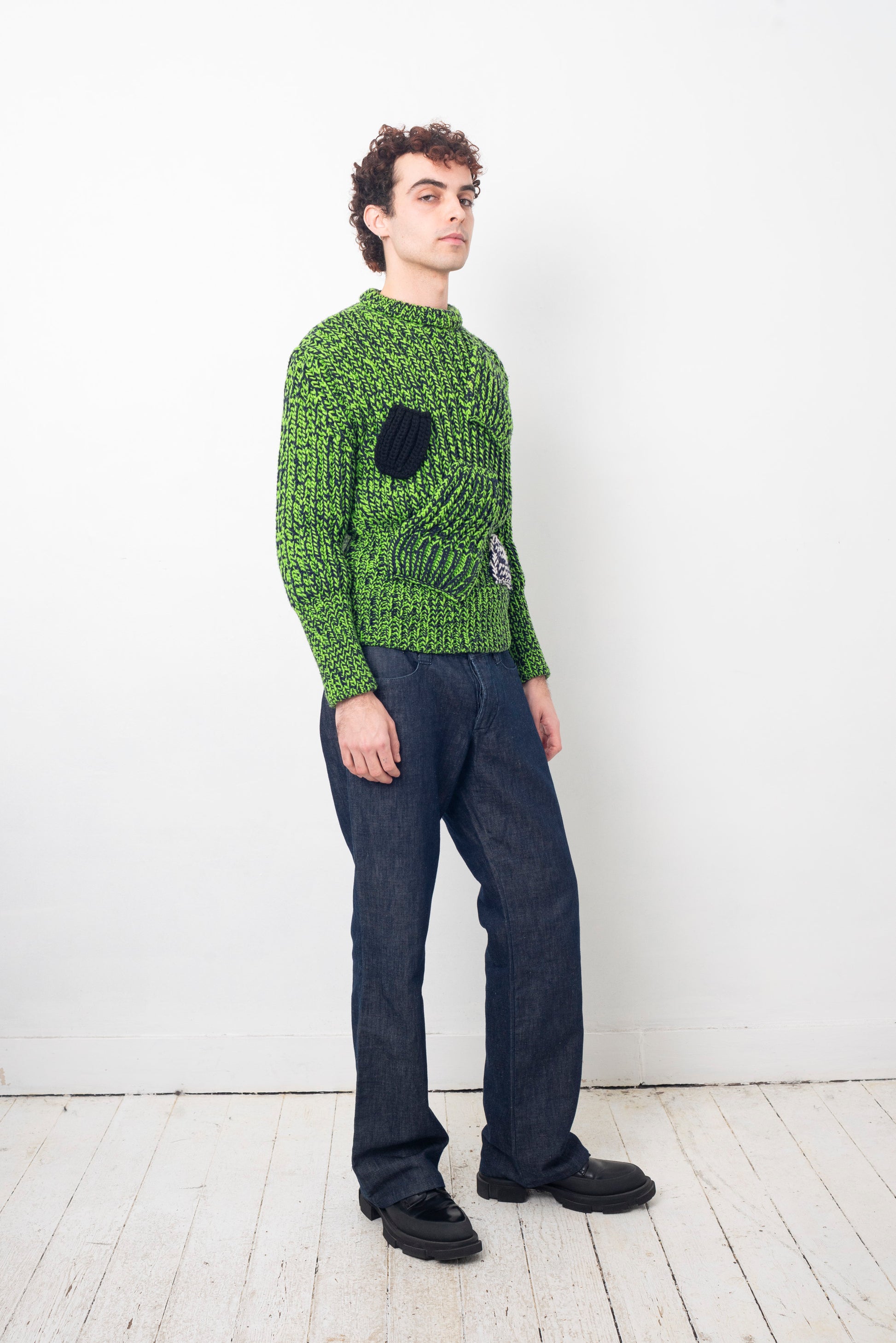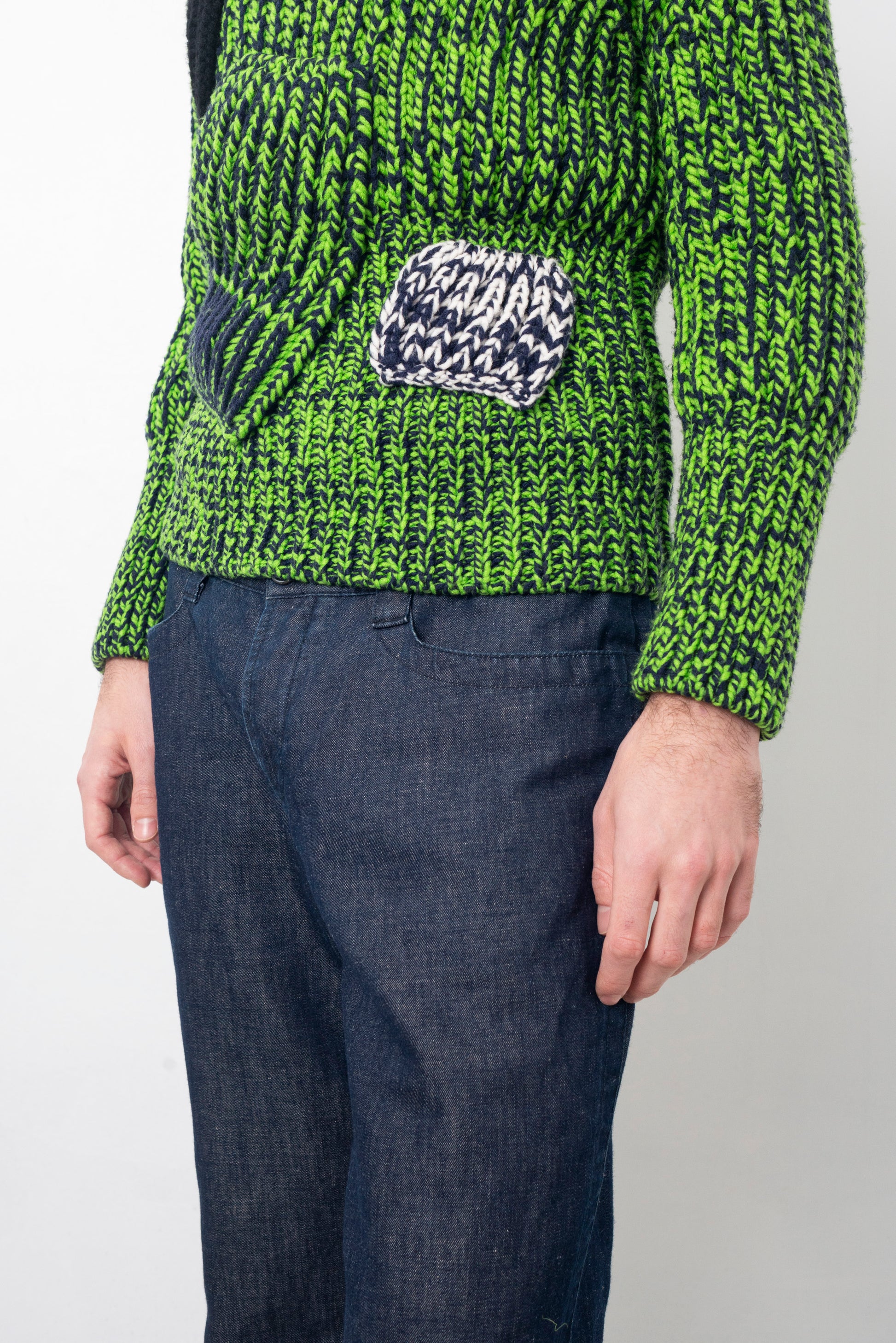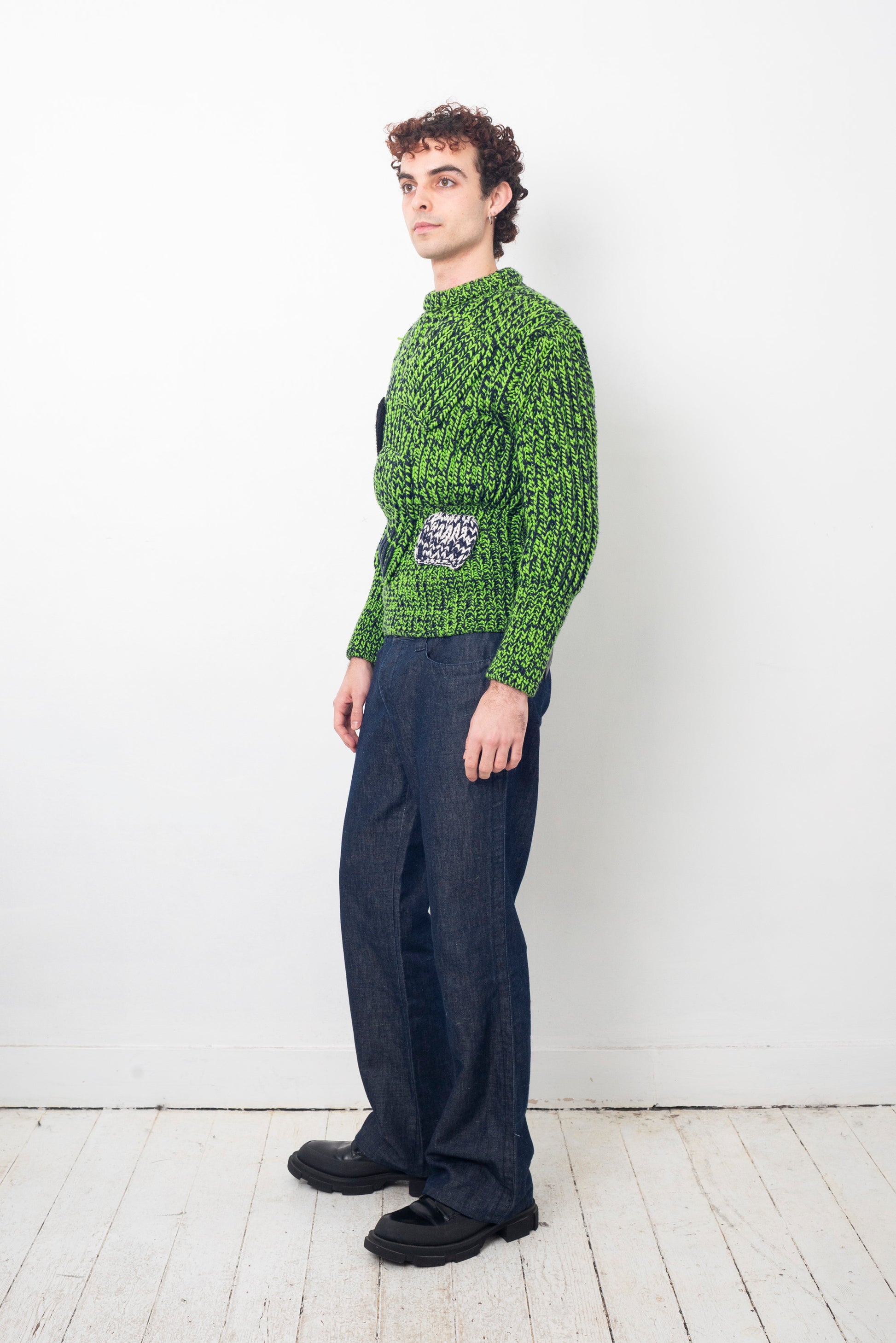 Denim trousers by Dirk Bikkembergs from the 2000's with an asymmetric elastic belt detail in the back that hangs casually off the left thigh.