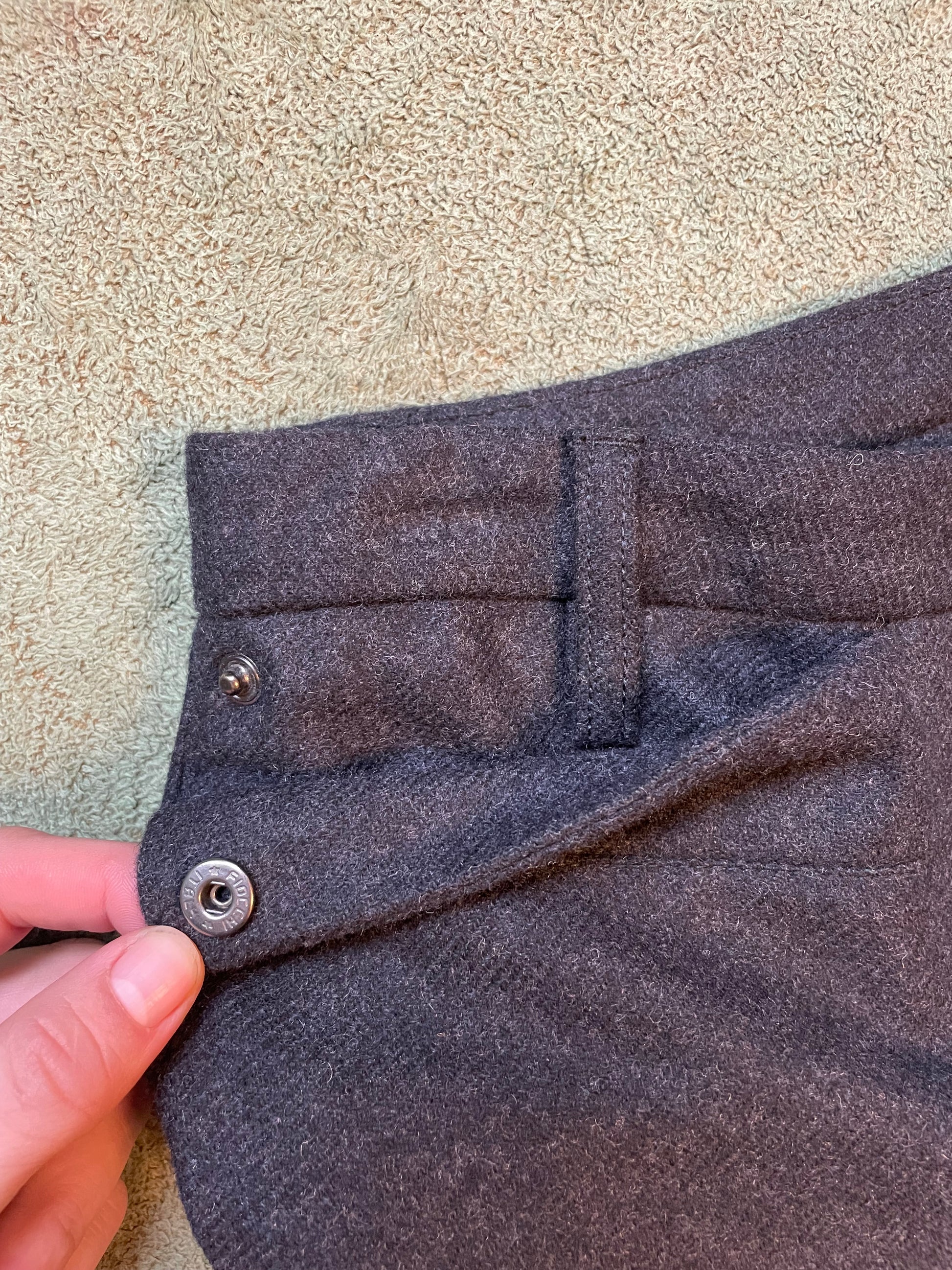 The particularity of these trousers are the rectangular straight pockets that close with a snap button on the outer upper side of the trousers.