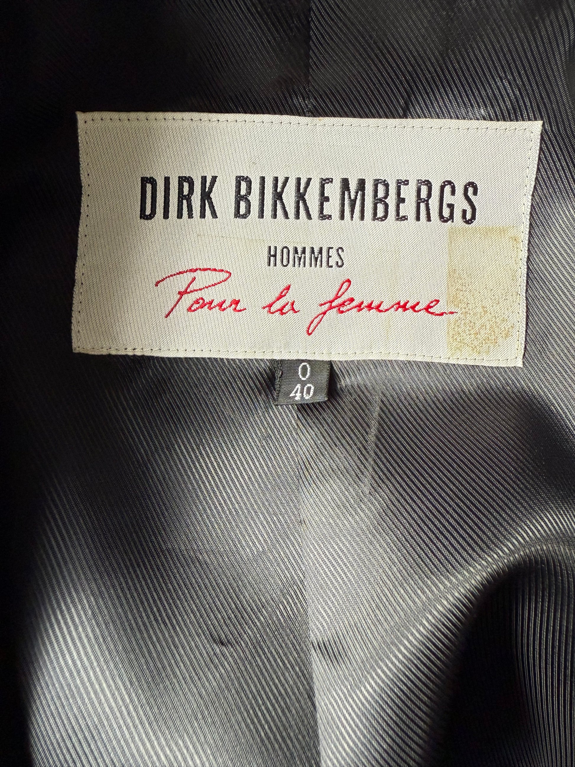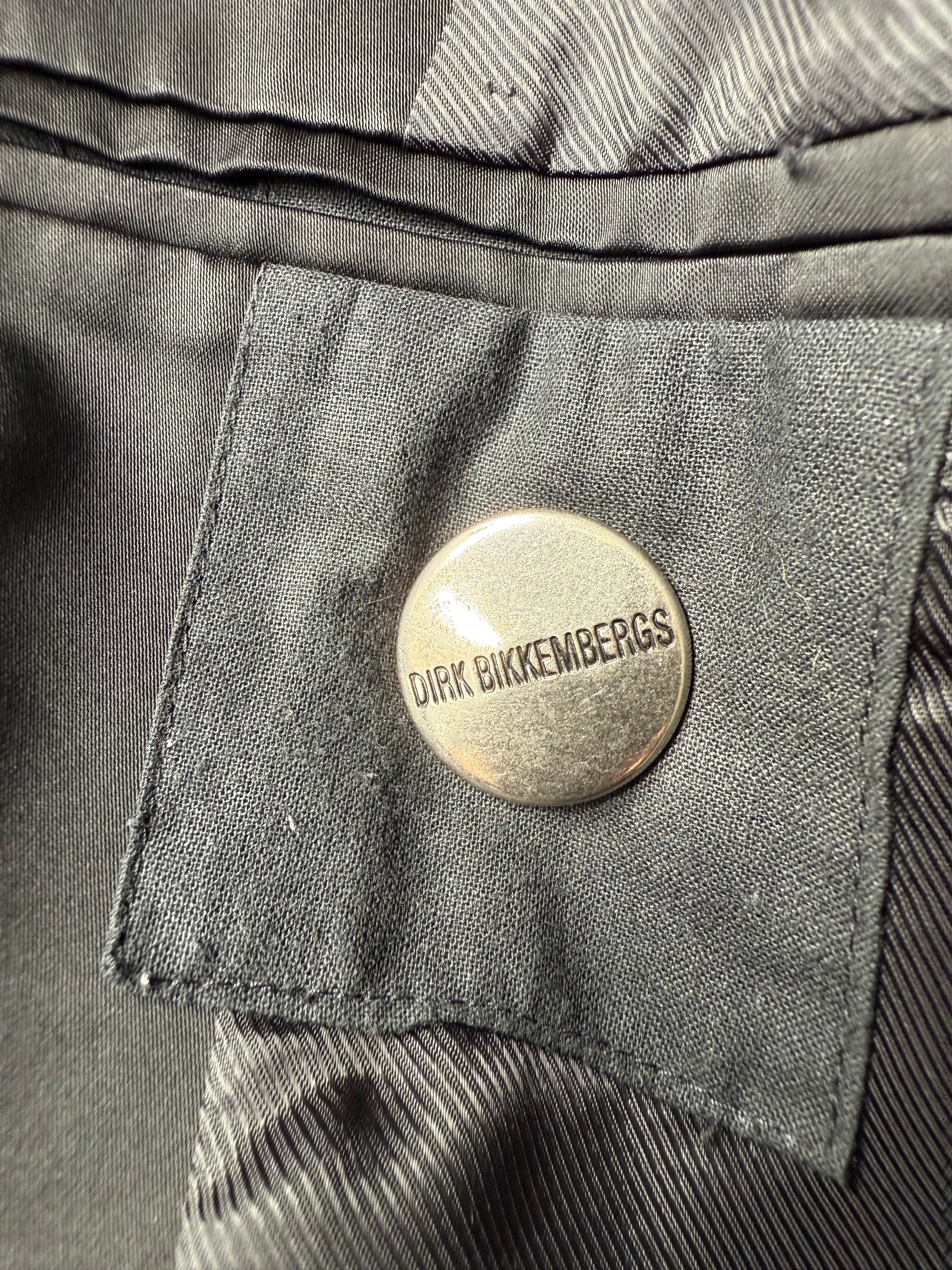 Dirk Bikkembergs "Homme pour la Femme" black nylon single breasted blazer that closes in the front with a row of closely arranged buttons. The blazer has two front pockets, one chest pocket and two particular oversized pockets in the bottom back.