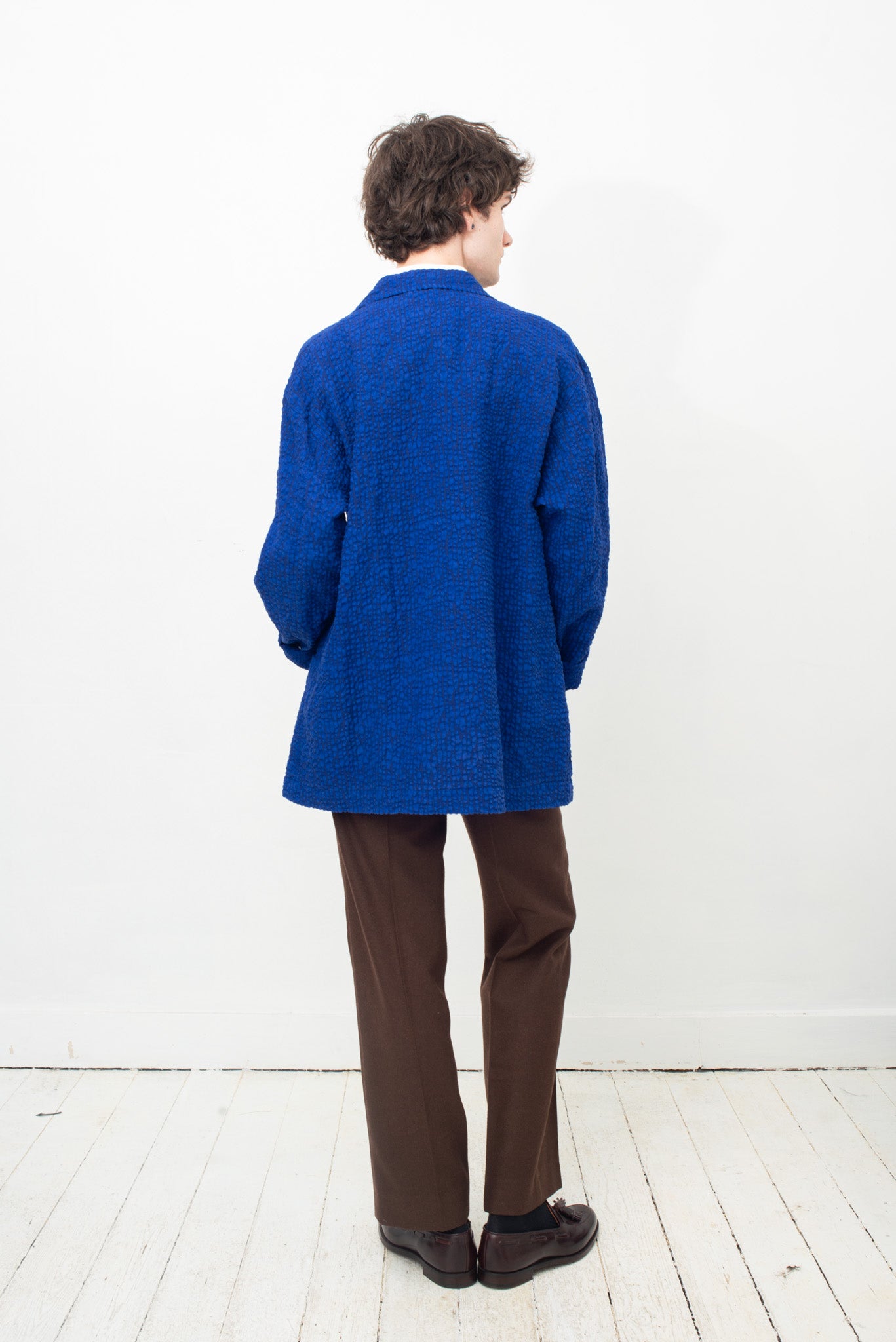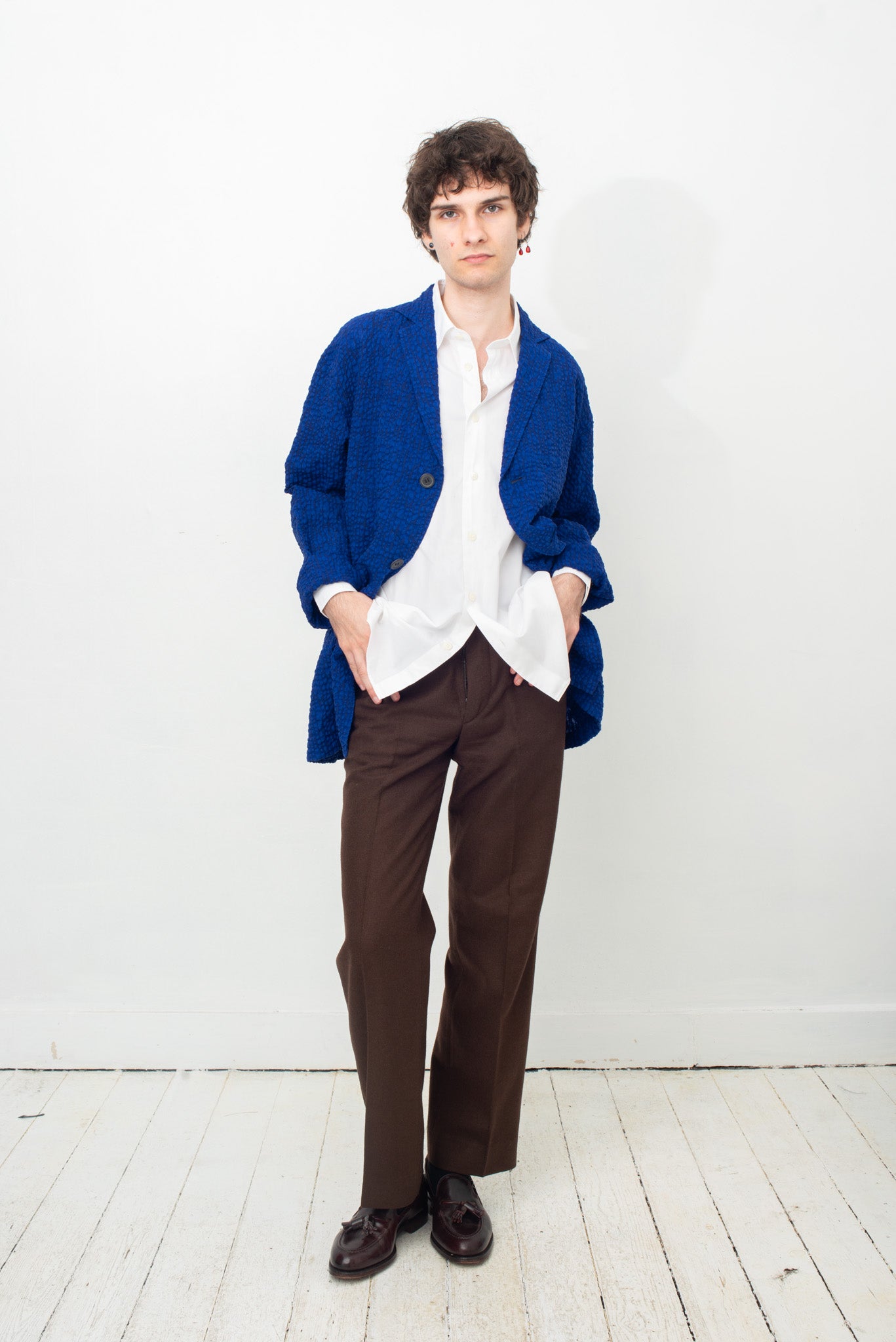 Here worn with a reversible Issey Miyake cotton jacket and a blue wrinkled Issey Miyake blazer, all available online and in our brussels store.