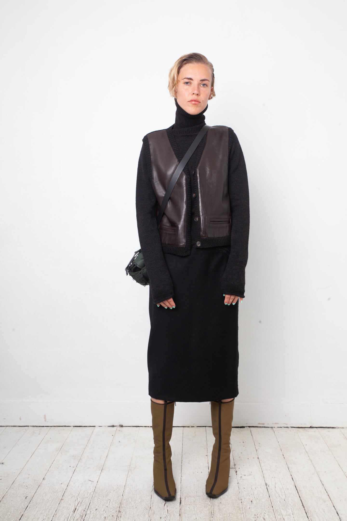 For a quintessentially 90's look, smart & functional, this DKNY twinset composed of a black turtleneck and a matching leather and wool gilet.