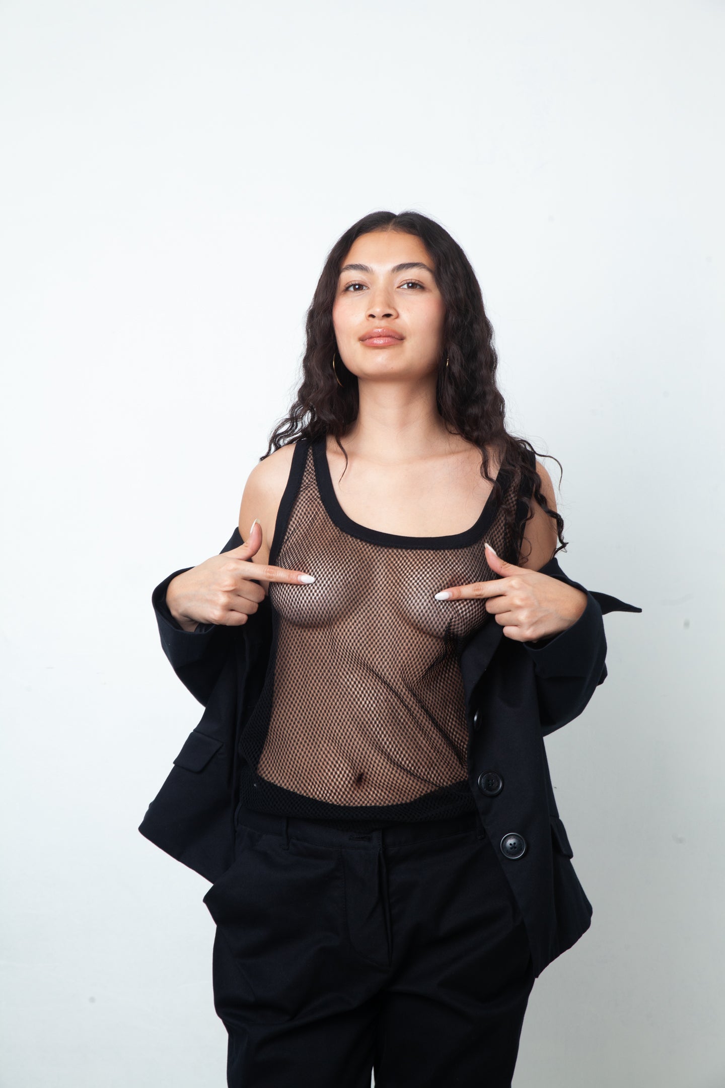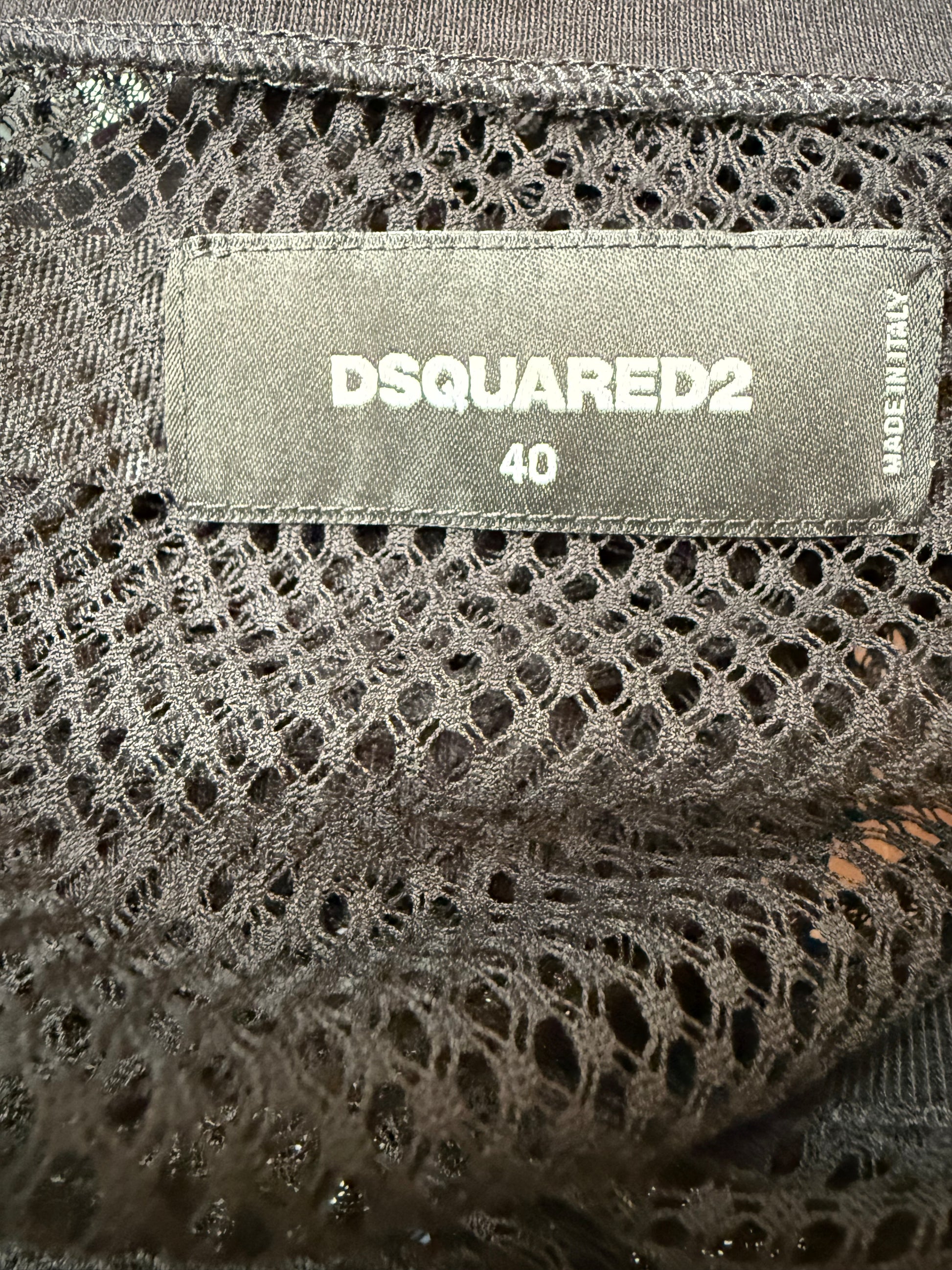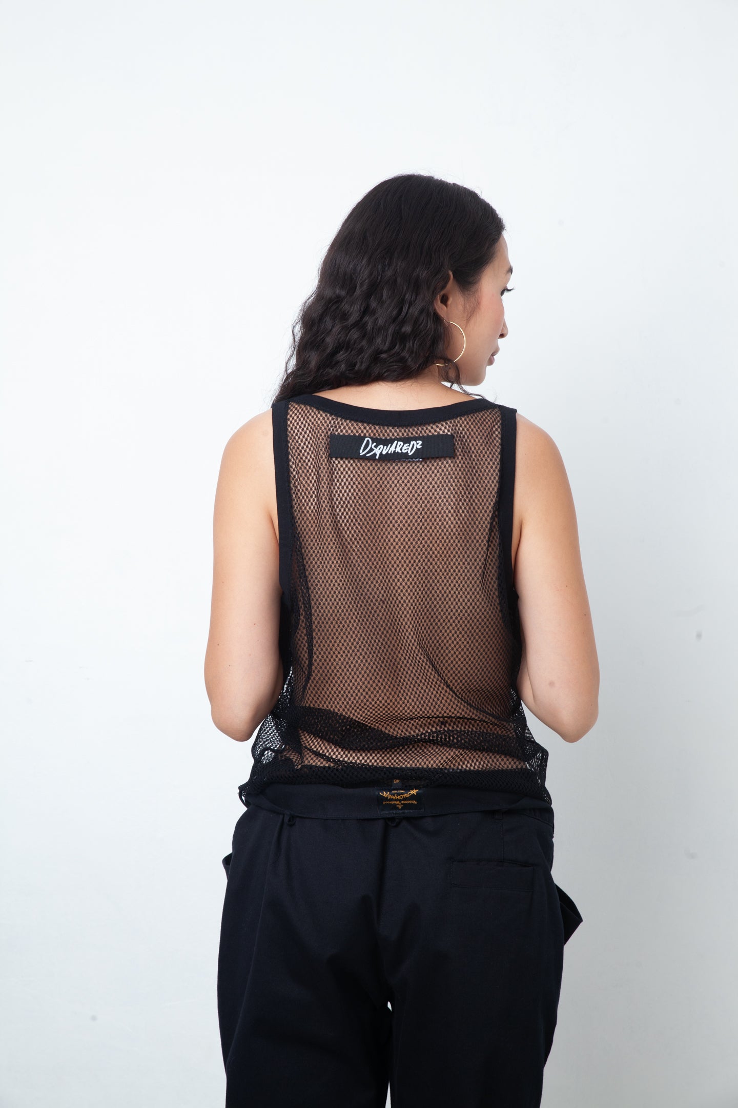 Designer Desquared2 black fishnet tank top with Dsquared label on the back.