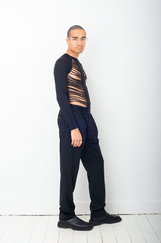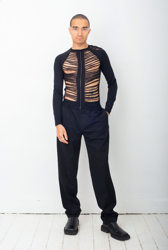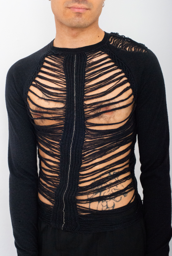 There’s a thin shiny silver chain along the center of the sweater as an interesting detail contrasting the edgyness of the whole piece.