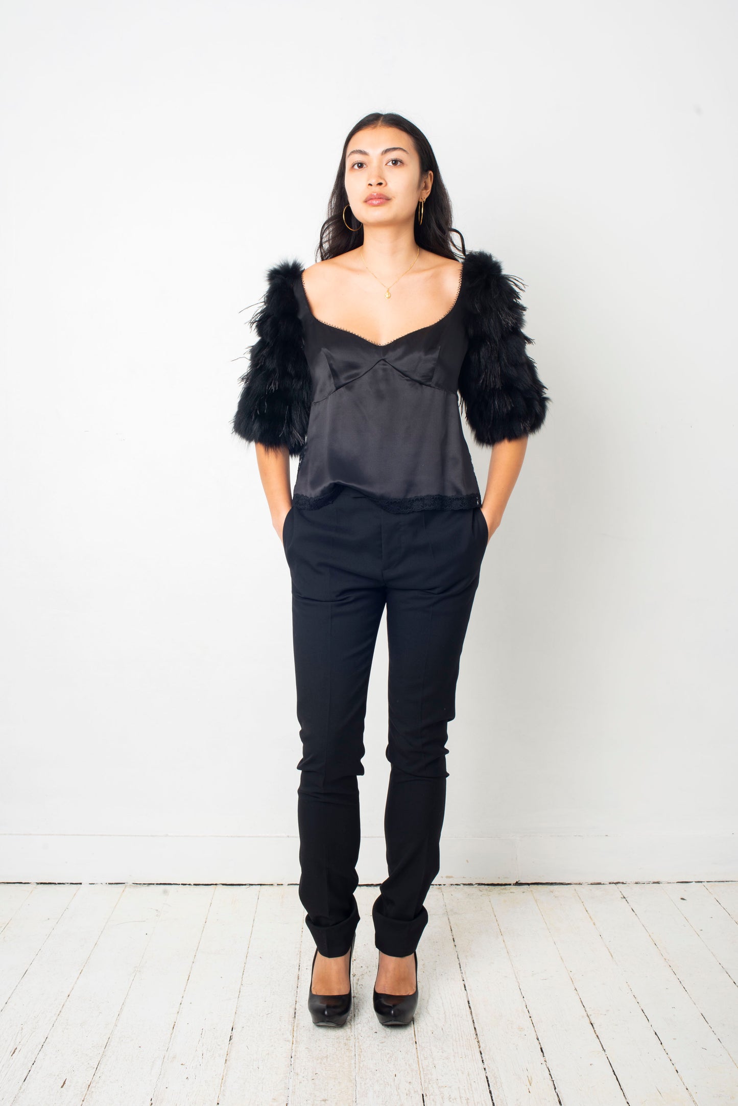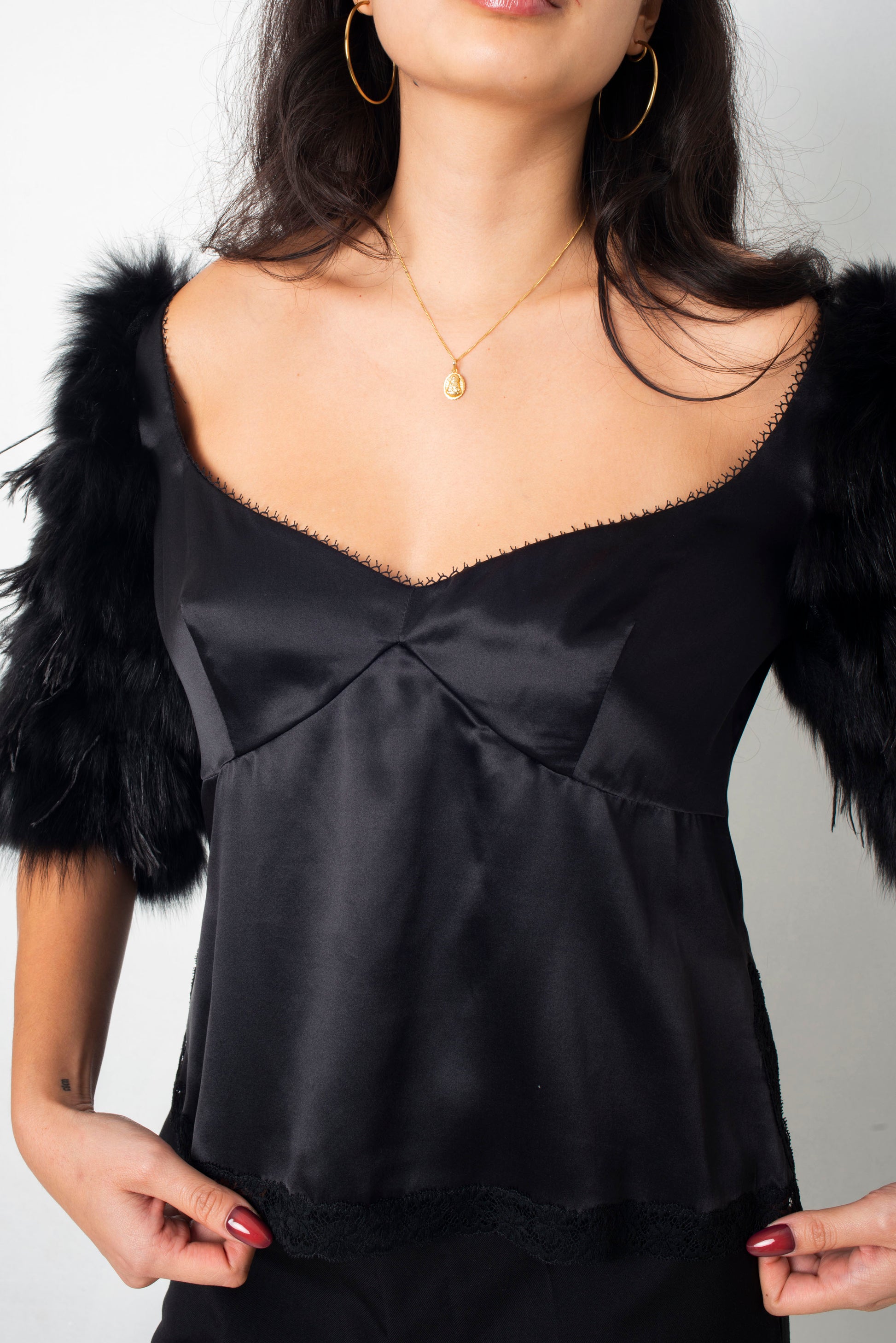 Emporio Armani FW 2004 black silk top with fur and feather sleeves