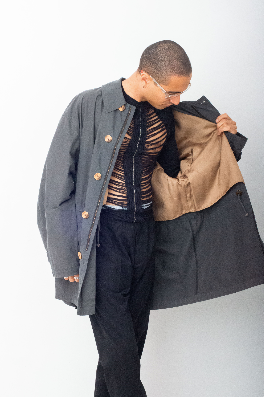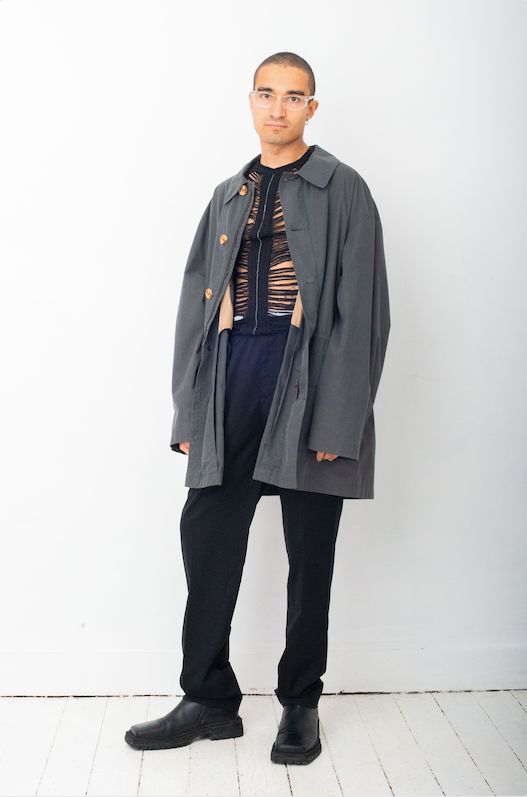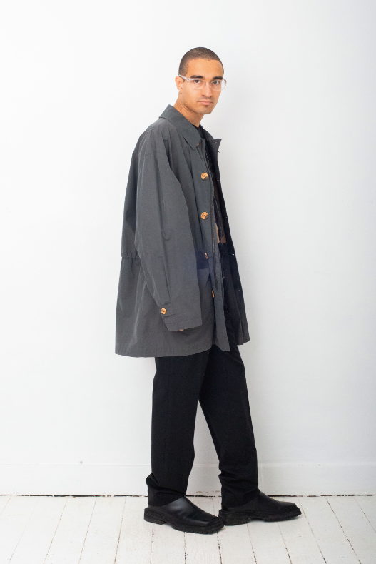 The coat closes with a zipper and and button closure, while a drawstring on the inside allows for a more fitted silhouette at the waist.
