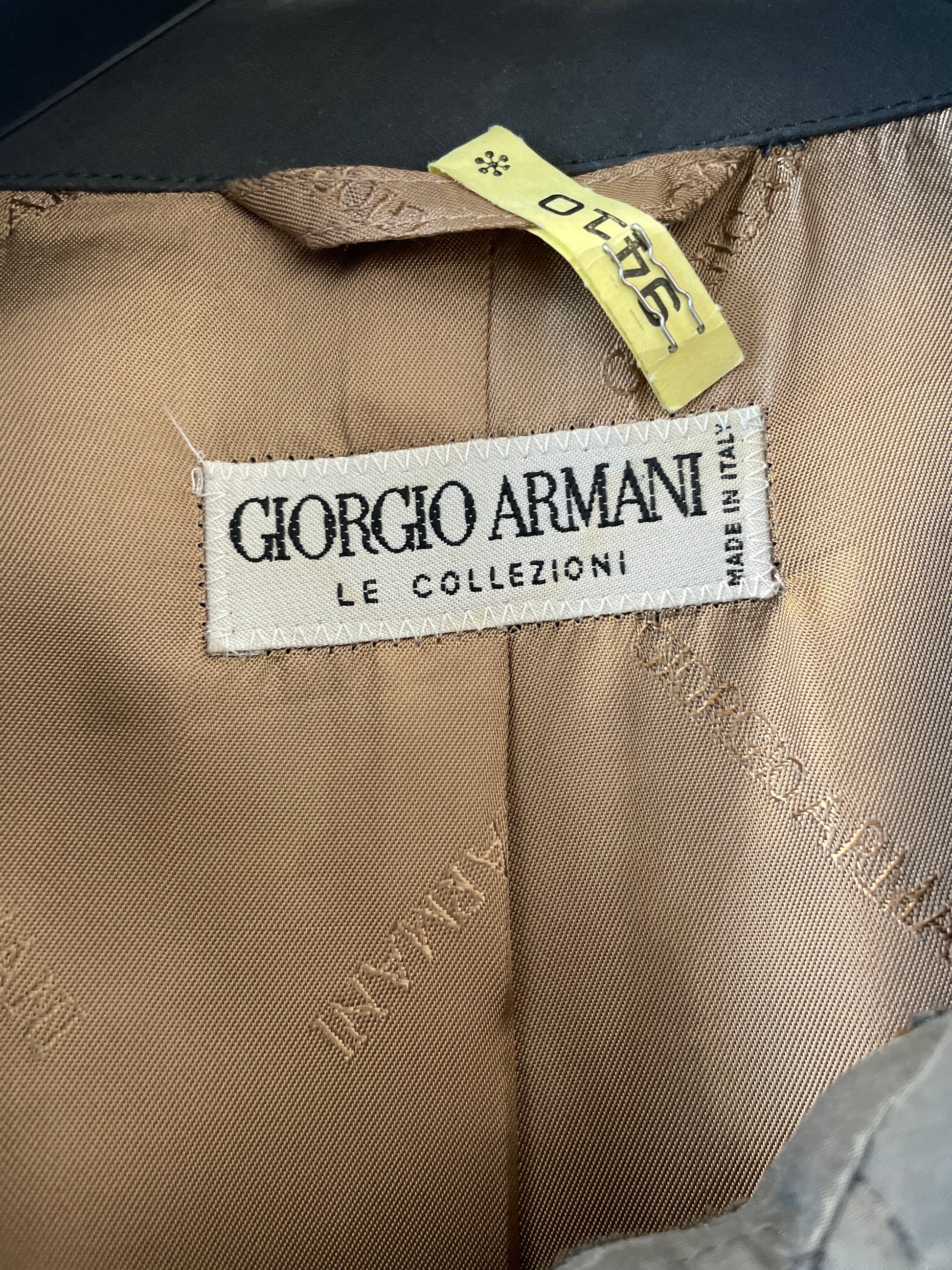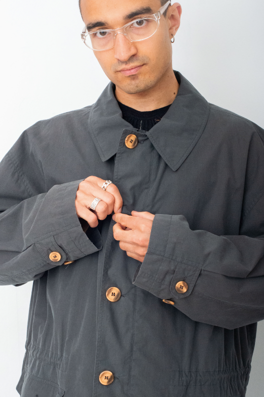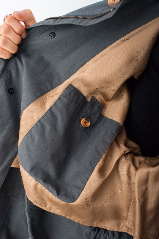 Beautiful coat by Giorgio Armani in a blue greyish waxed cotton fabric, making her resistant to wind and gentle rain.