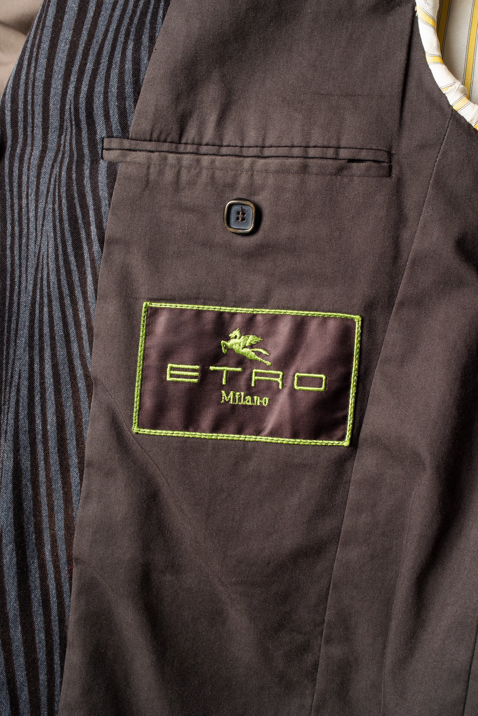 The jacket has one breast pocket and two front pockets. The Same type of square buttons are repeated in a smaller version at the cuffs in a row of four.
