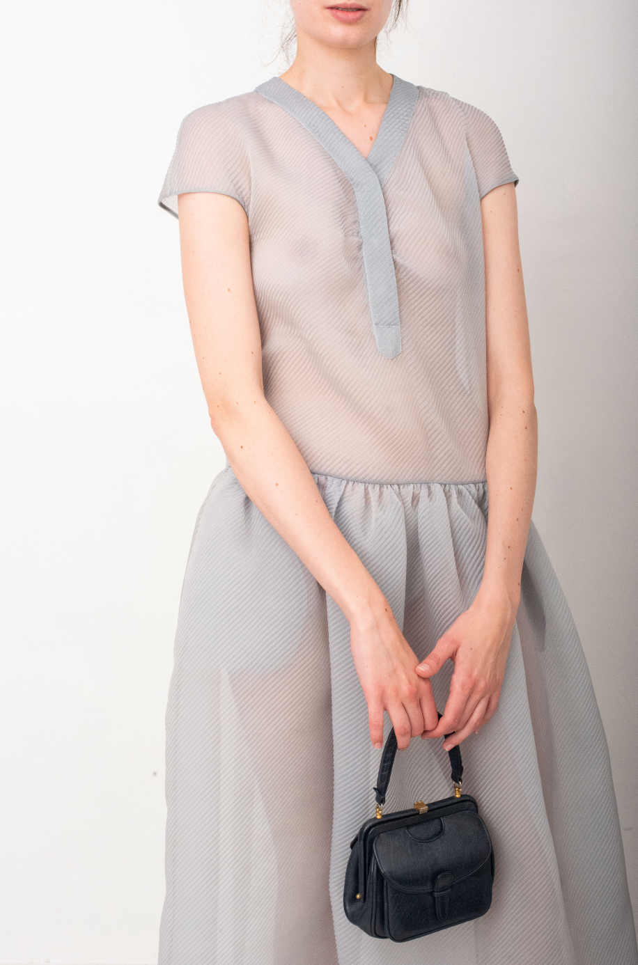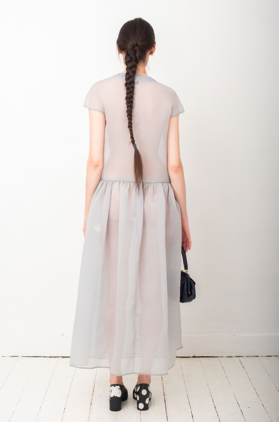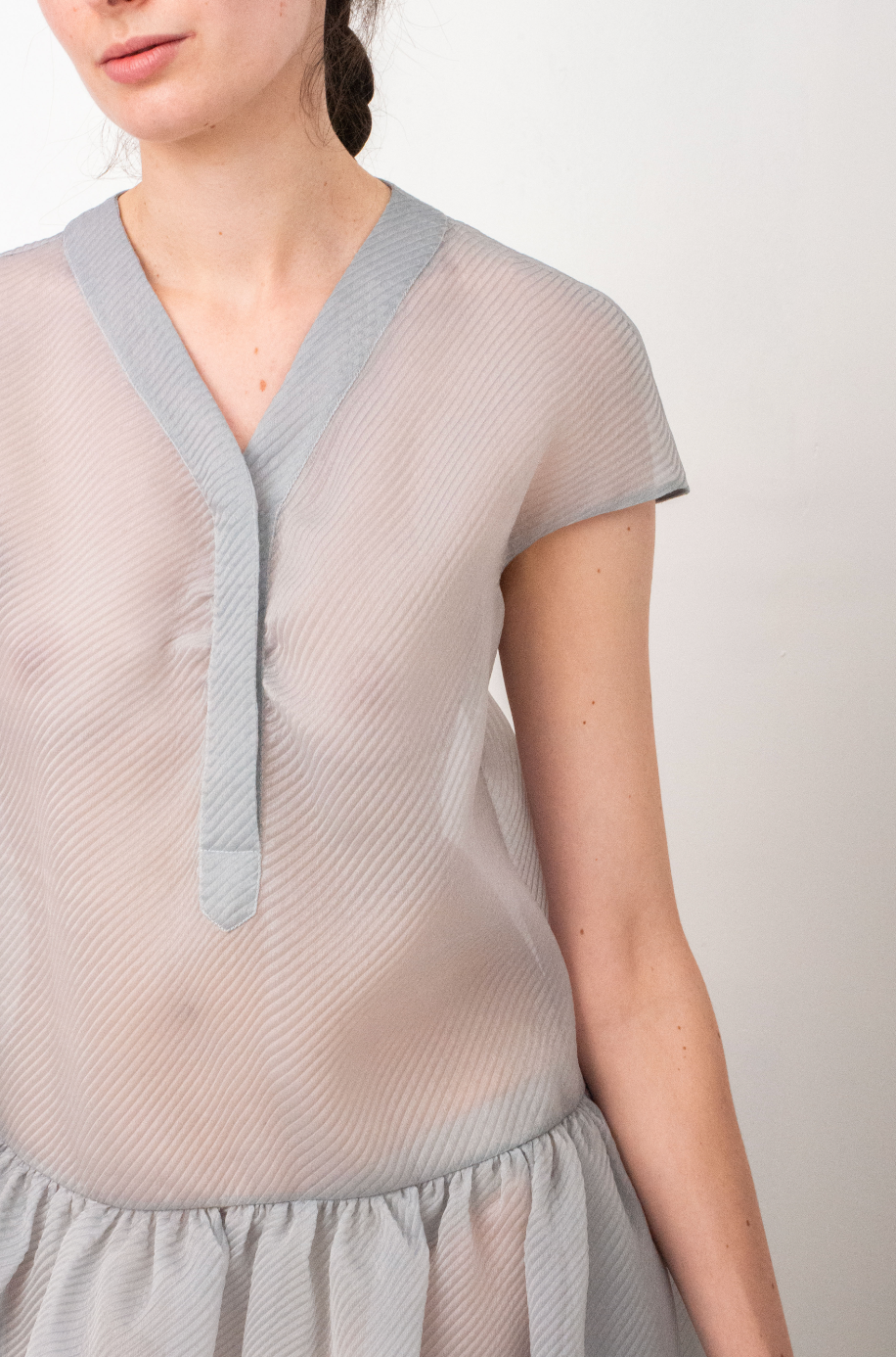 Made of a pale blue organza, the soft waffled textured fabric gives a very breezy aspect to the dress.