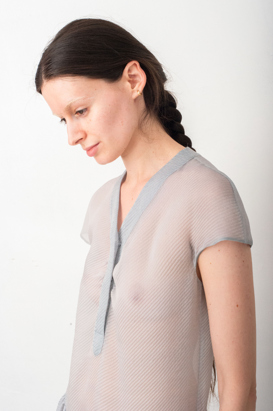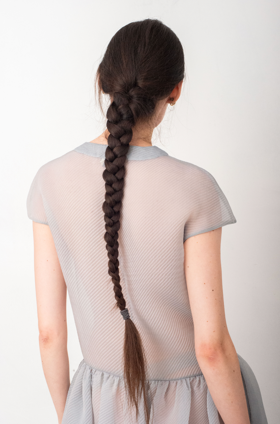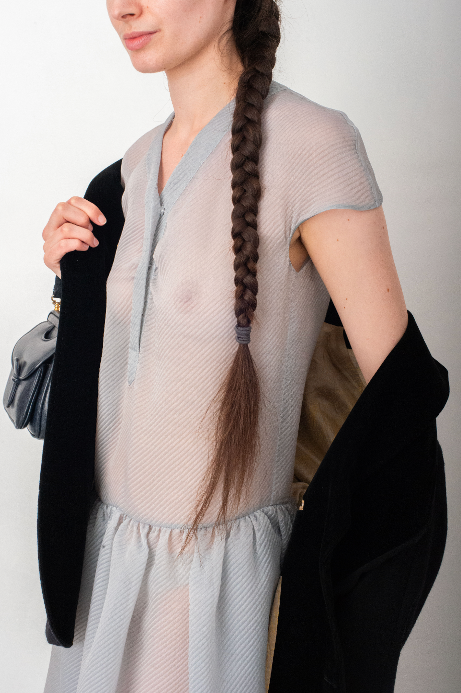 Made of a pale blue organza, the soft waffled textured fabric gives a very breezy aspect to the dress.