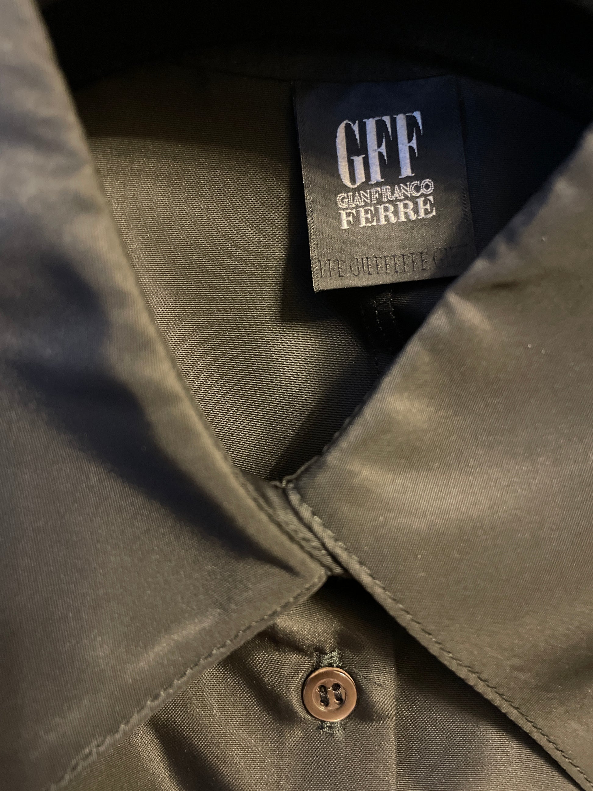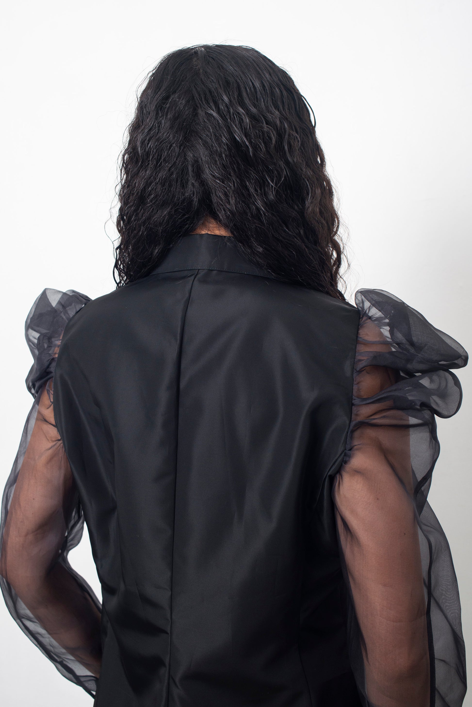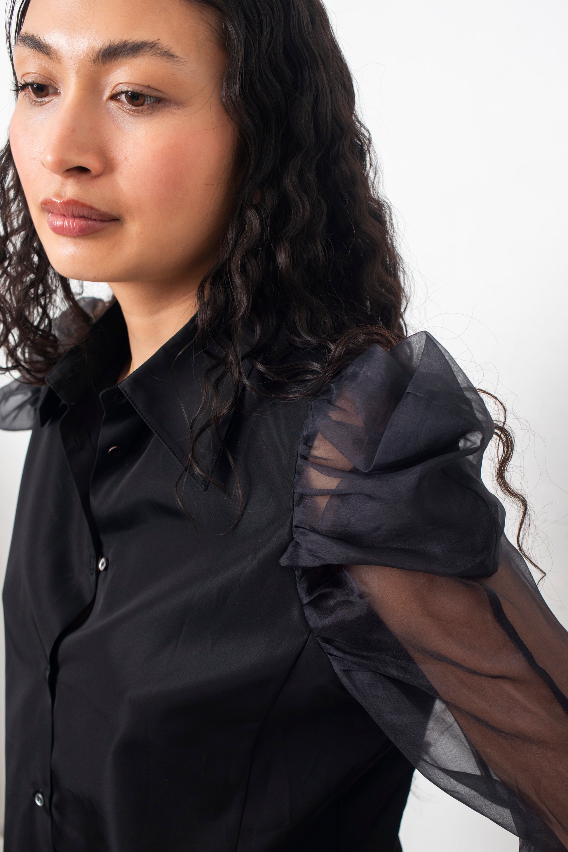 Elegant Gianfranco Ferre black button down shirt with black sheer ruffled silk sleeves.