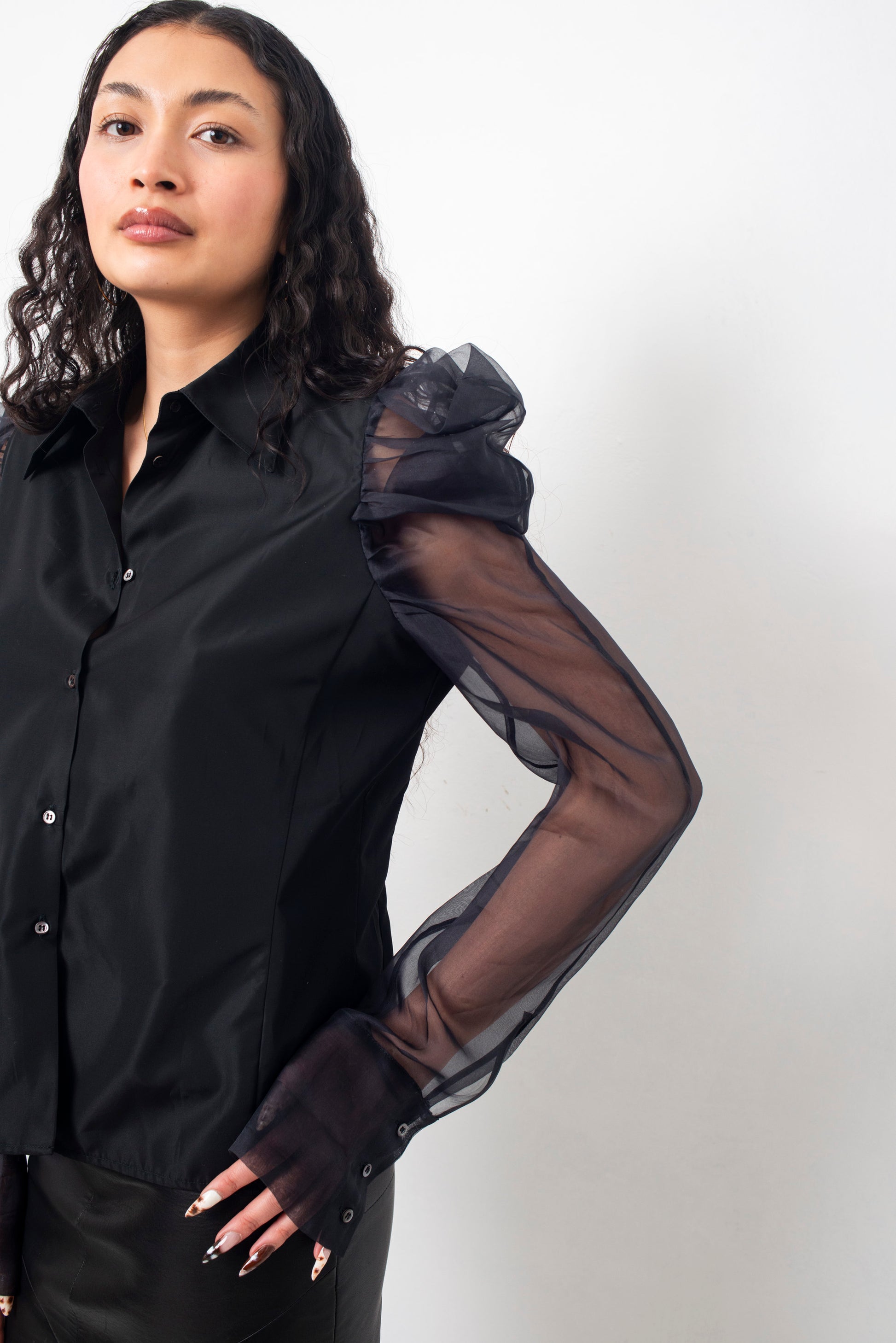 Gianfranco Ferre 2000's black shirt with sheer silk ruffled sleeves