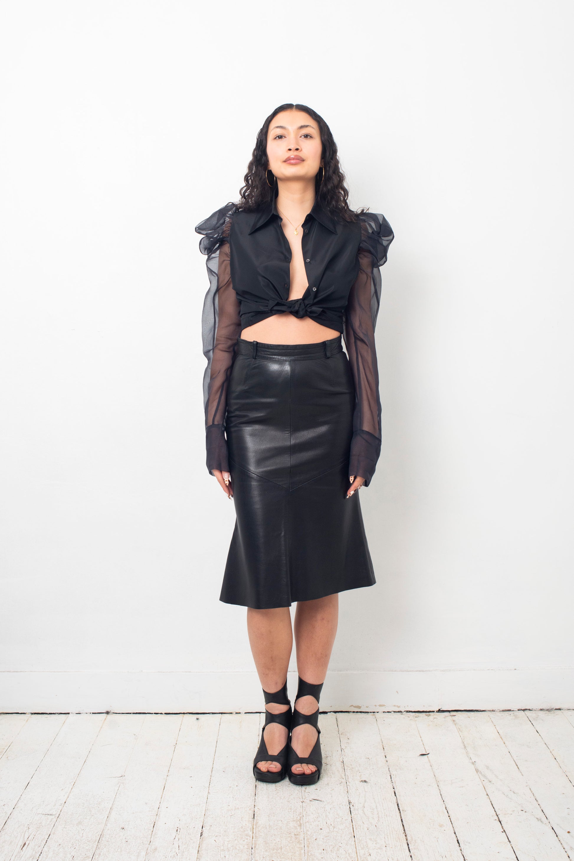here worn with a 90s Sylvie Schimmel black leather peplum skirt, also available online